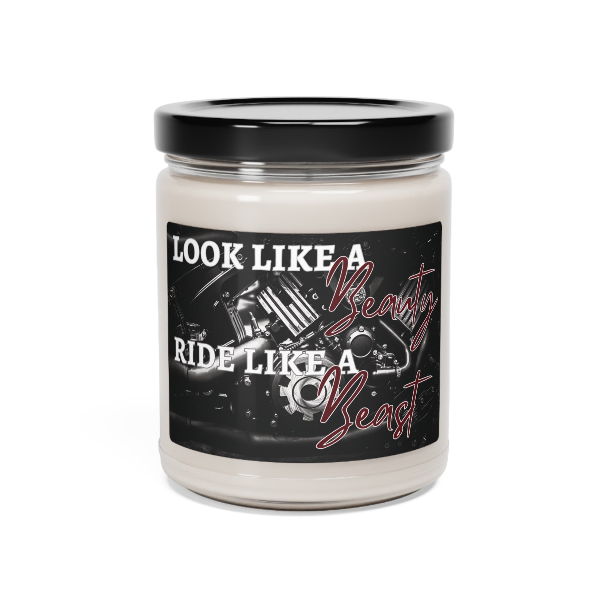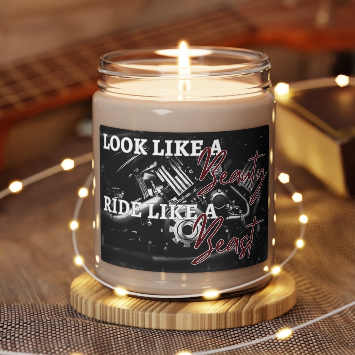 Surprise your loved one with this unique and beautiful Motorcycle Themed Scented Soy Candle. Look like a Beauty, Ride like a Beast bold biker messaging on label.