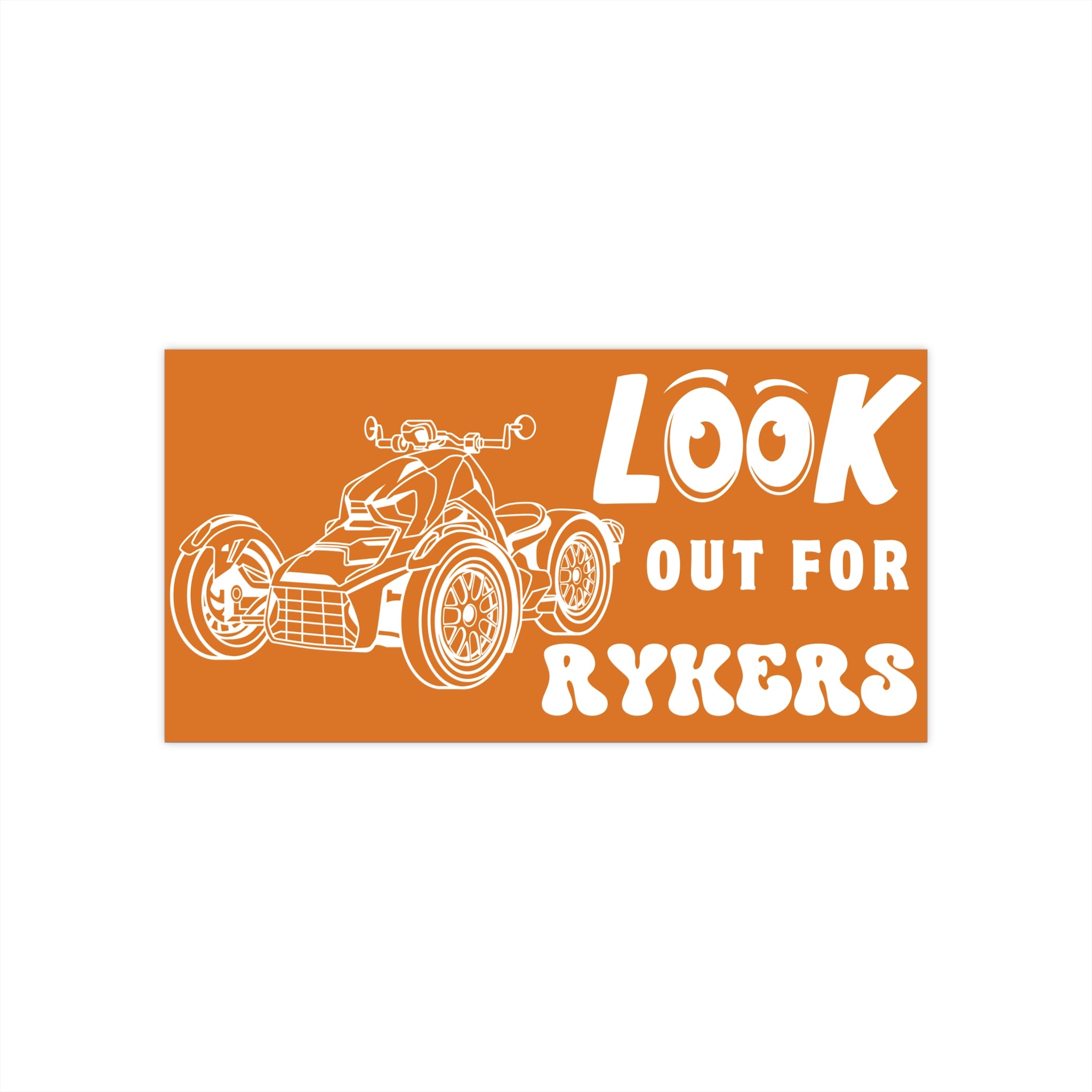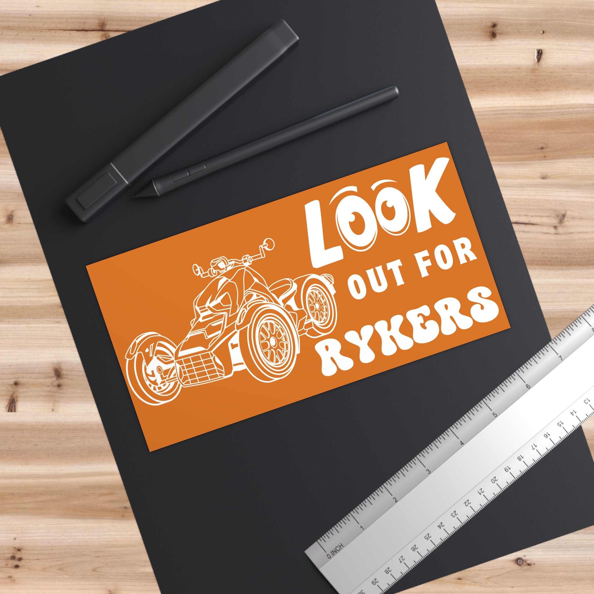 Enhance your vehicle's appeal with our eye-catching bumper sticker featuring the bold text "Look Out for Rykers" alongside a striking Ryker Motorcycle graphic on a orange background. Ideal for Can-Am Ryker fans and all motorists, this durable sticker is a vibrant reminder to drive safely and watch for bikes.