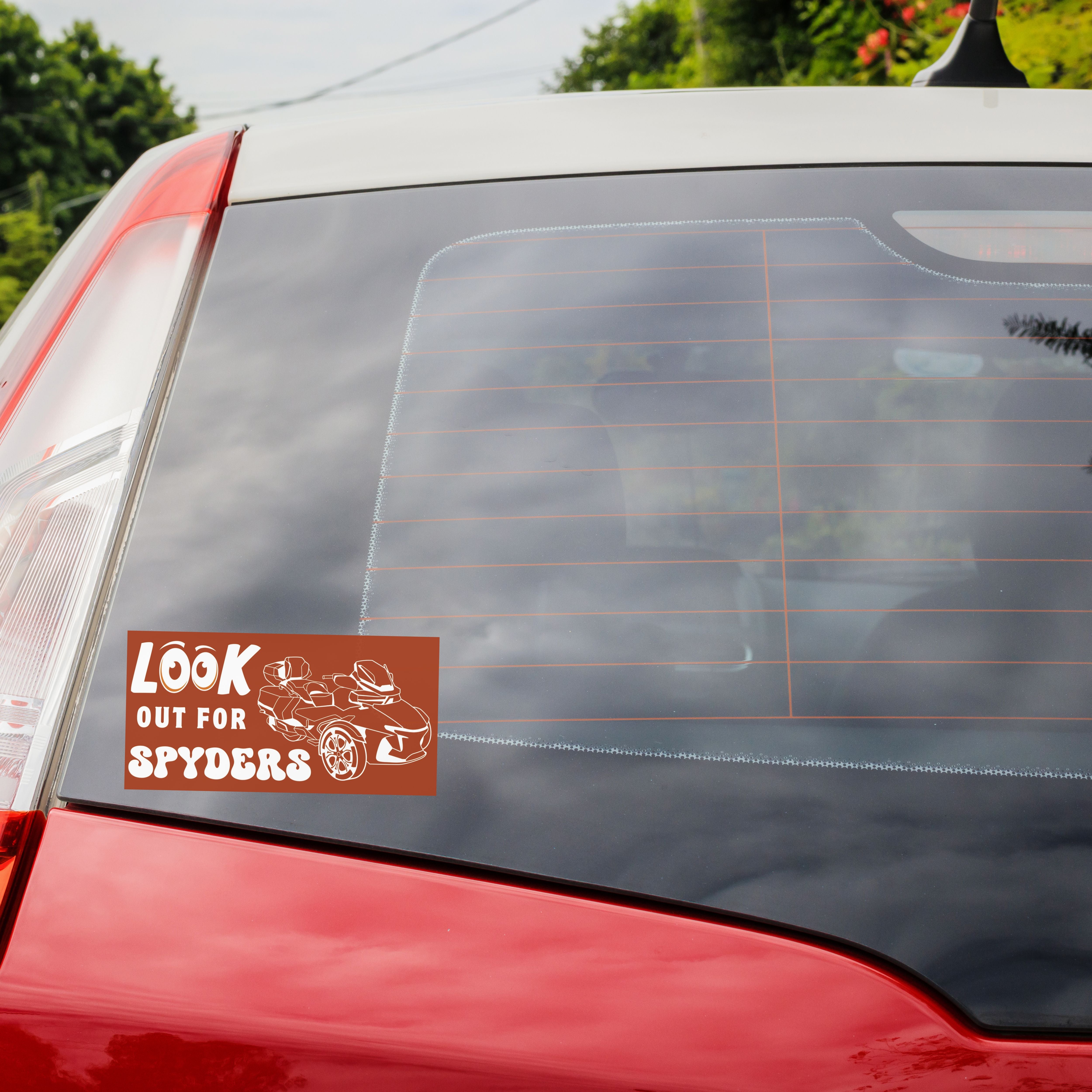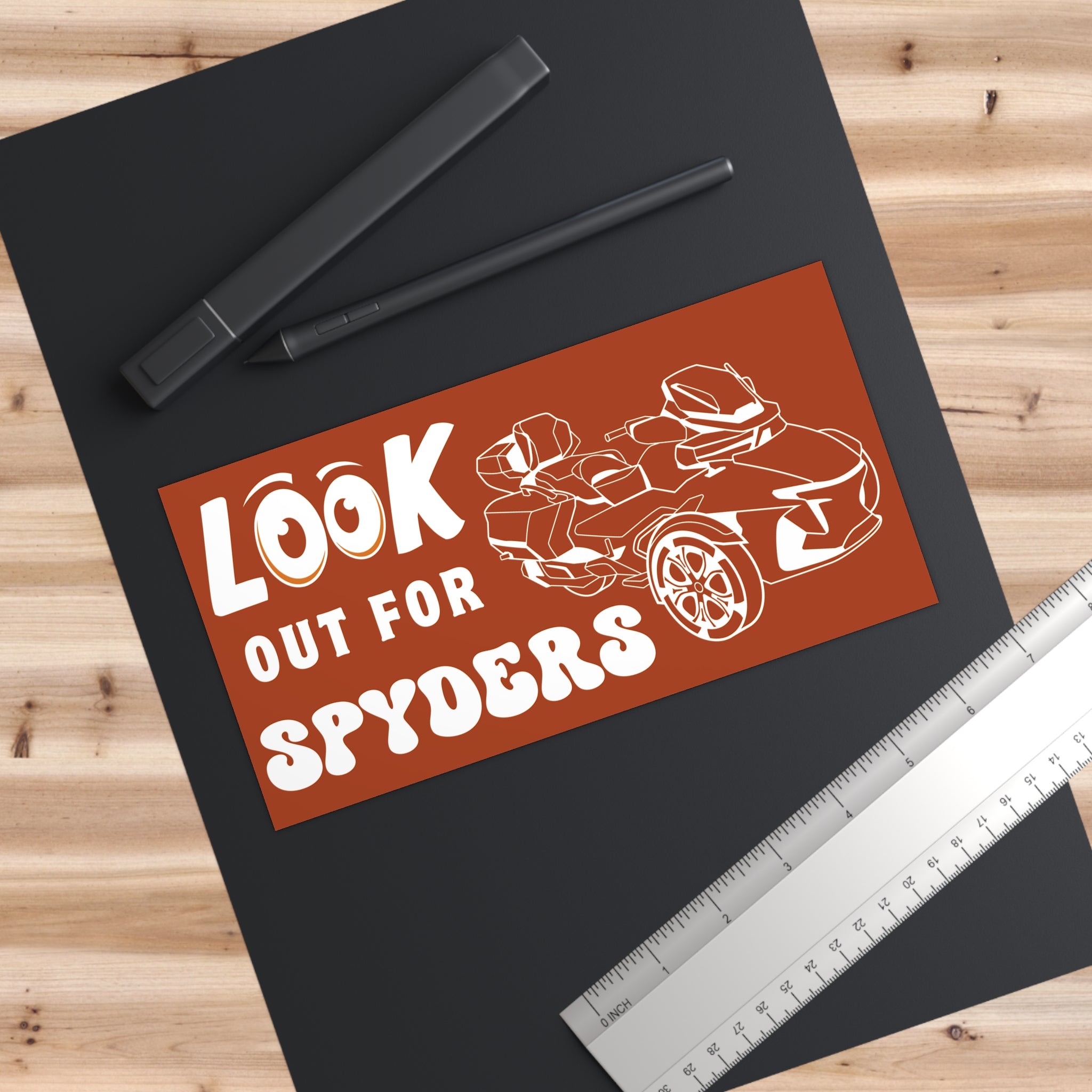 Enhance your vehicle's appeal with our eye-catching bumper sticker featuring the bold text "Look Out for Spyders" alongside a striking Spyder graphic on a burnt orange background. Ideal for Can-Am Spyder fans and all motorists, this durable sticker is a vibrant reminder to drive safely and watch for bikes.