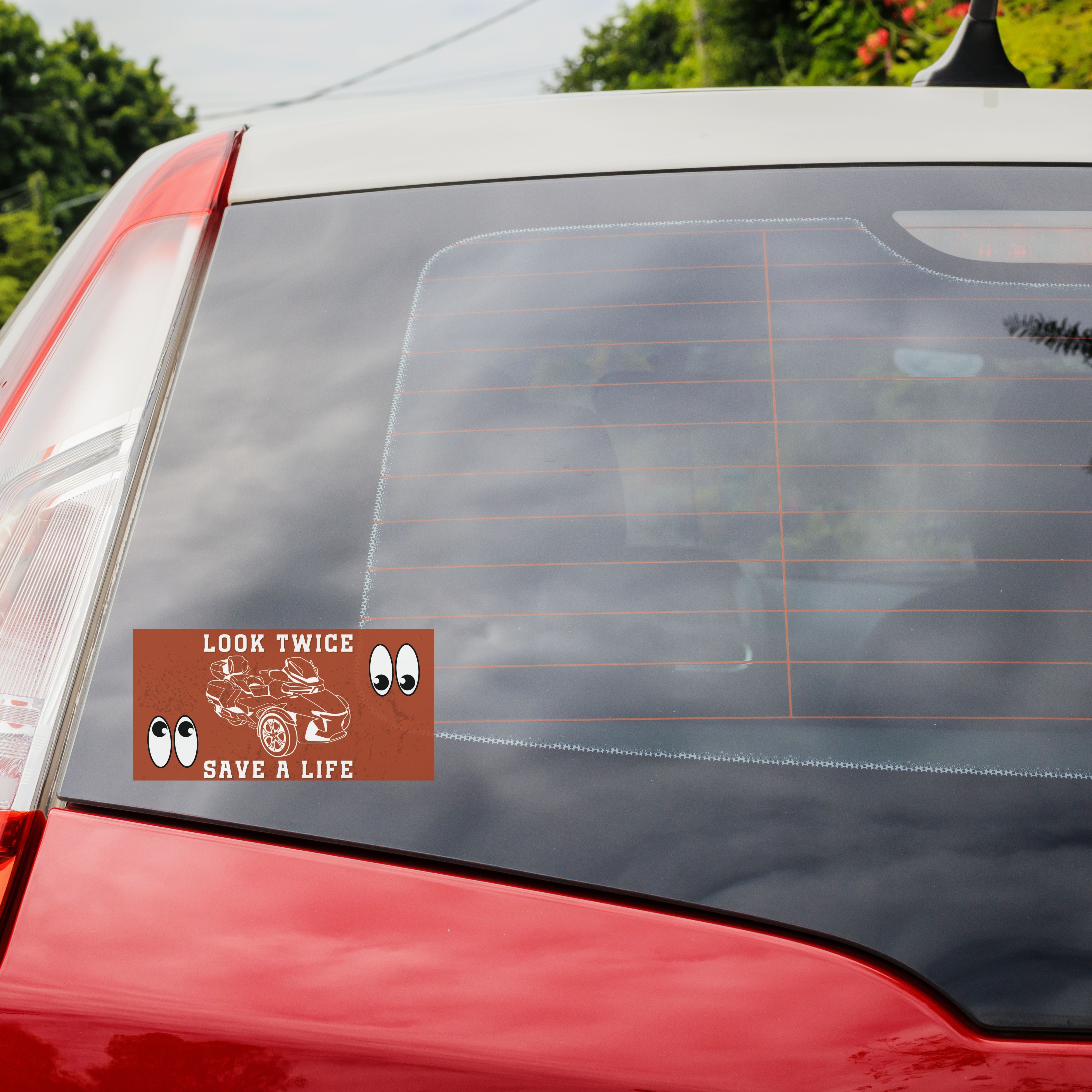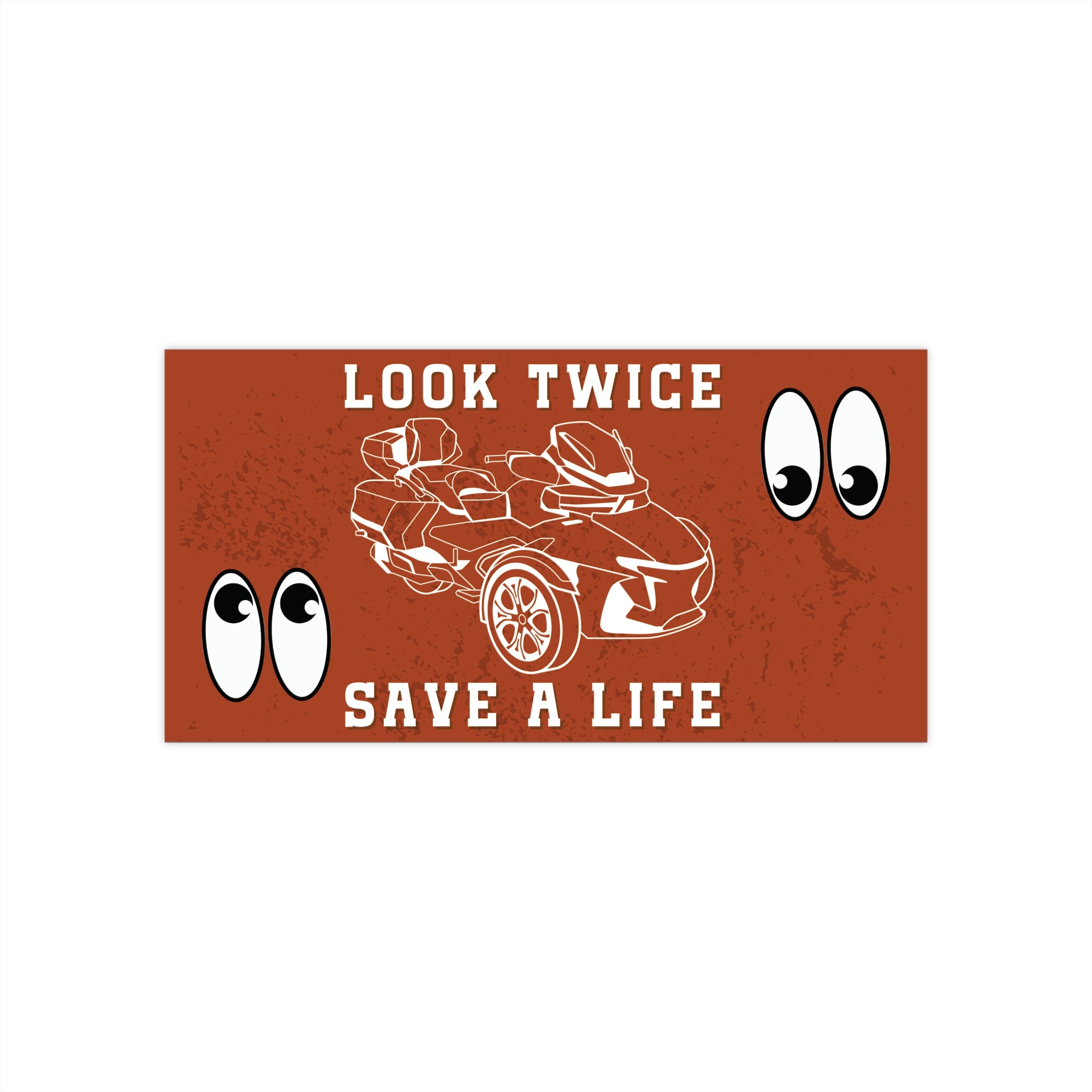 Enhance your vehicle's appeal with our eye-catching bumper sticker featuring the bold text "Look Twice Save a Life" alongside a striking Spyder graphic on a burnt orange background. Ideal for Can-Am Spyder fans and all motorists, this durable sticker is a vibrant reminder to drive safely and watch for bikes.