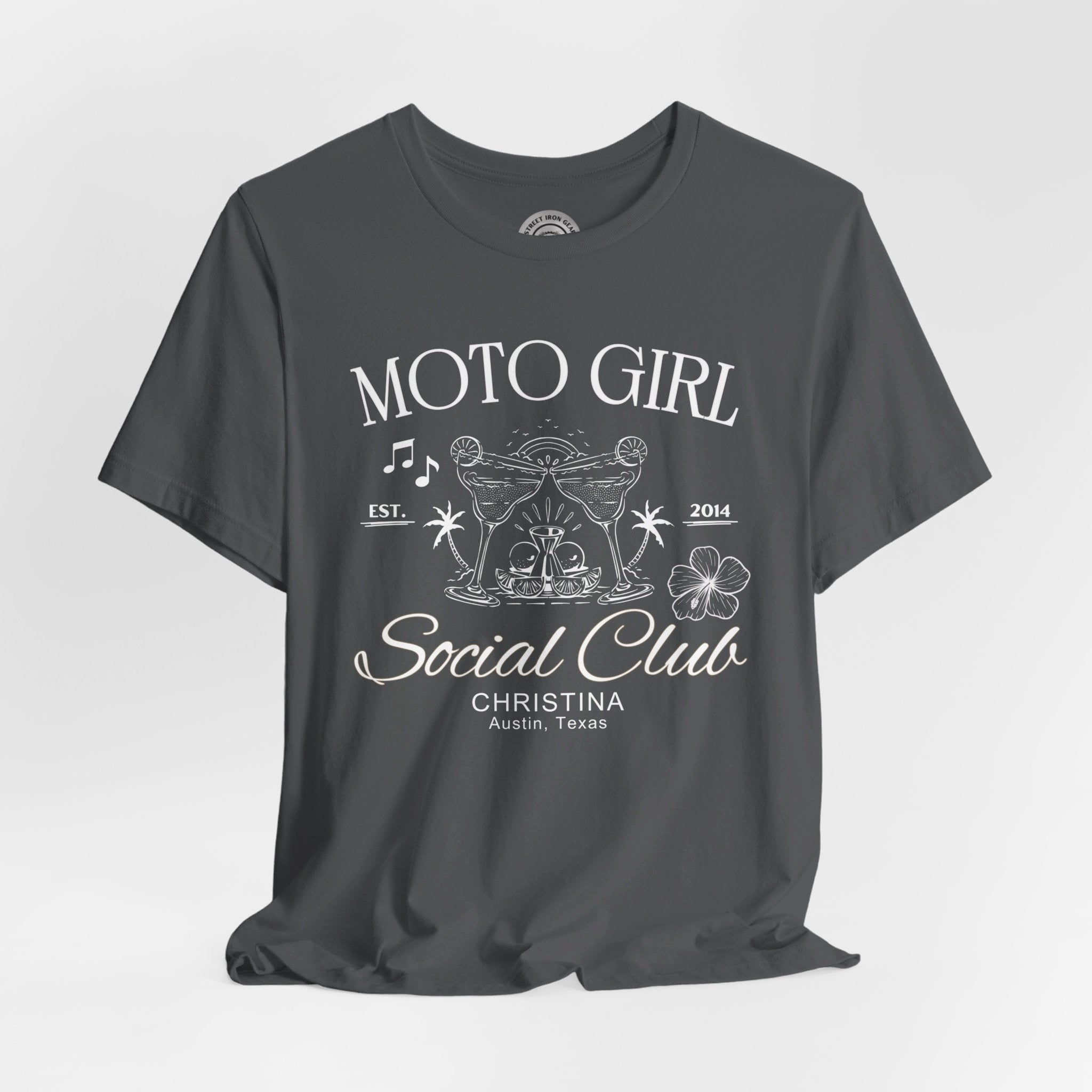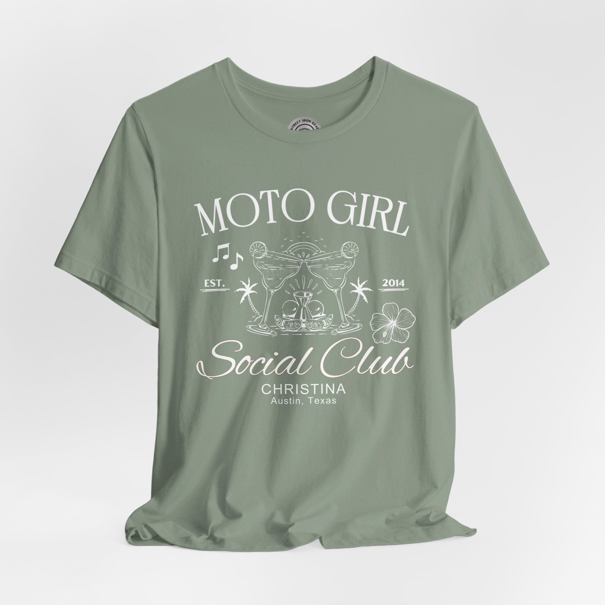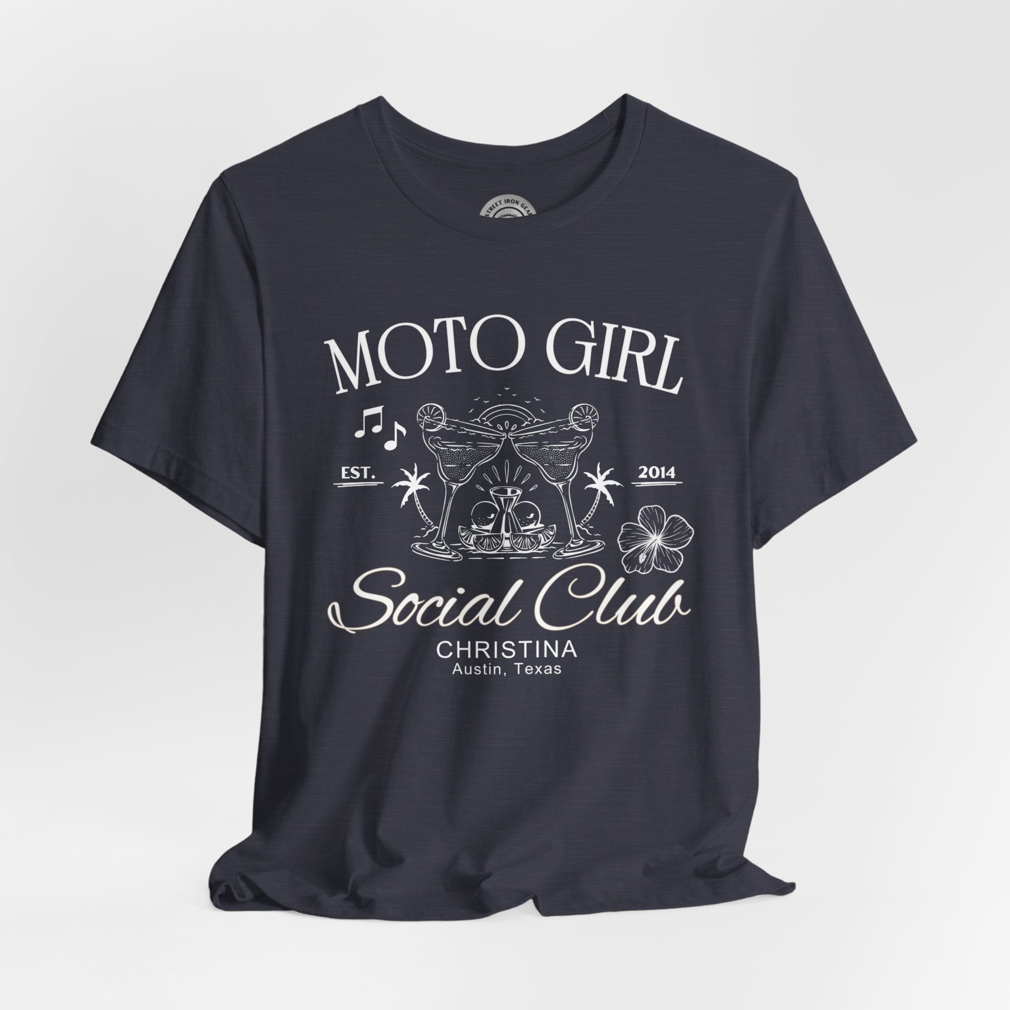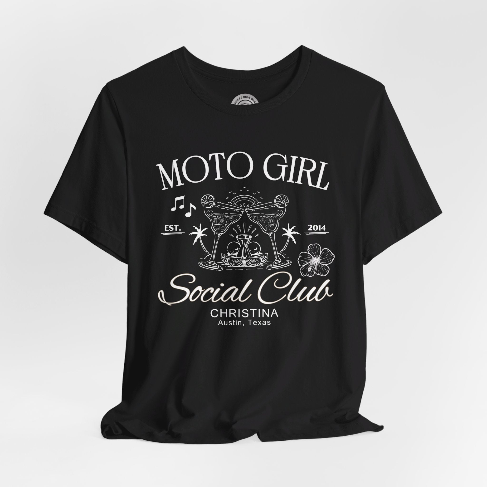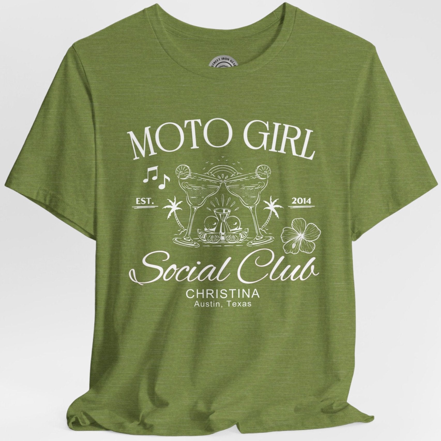 Elevate your ride with our customizable Moto Girl T-shirt, featuring elegant line drawings of fancy cocktails and music notes. Perfect for individual riders or local women's motorcycle groups, you can personalize it with your name and location to make it uniquely yours. Celebrate your love for the open road in style with this exclusive design from StreetIronGear.com!