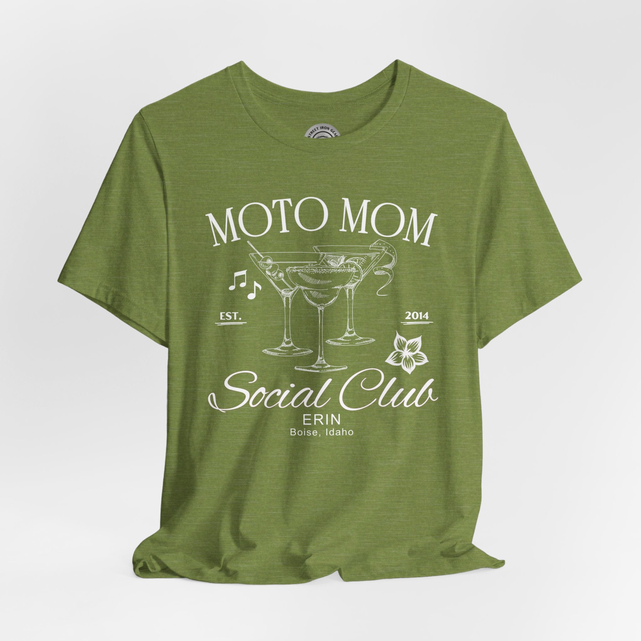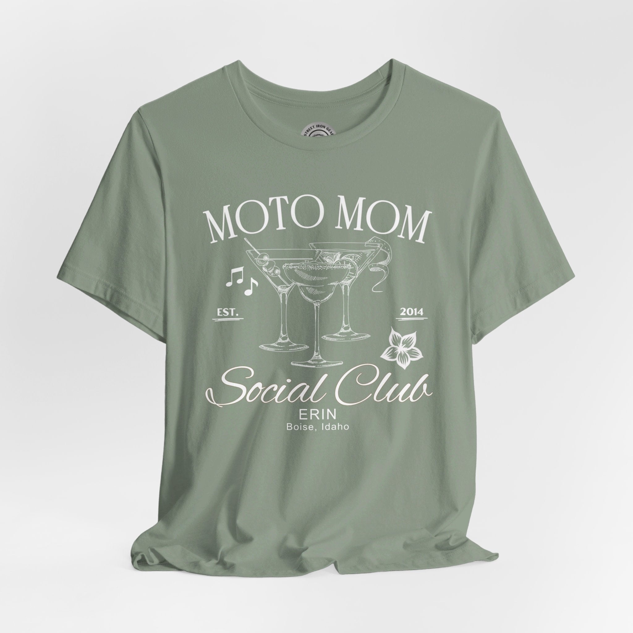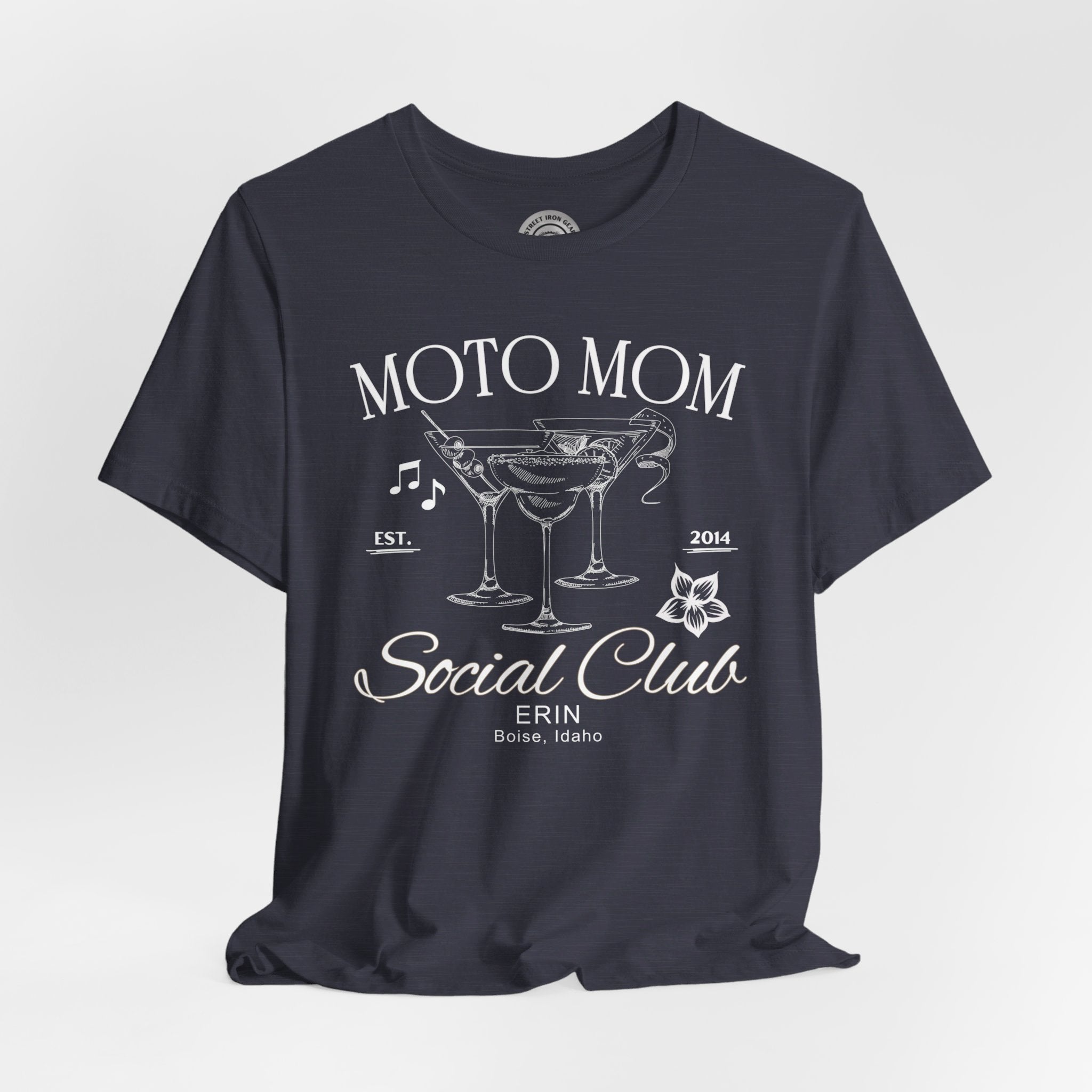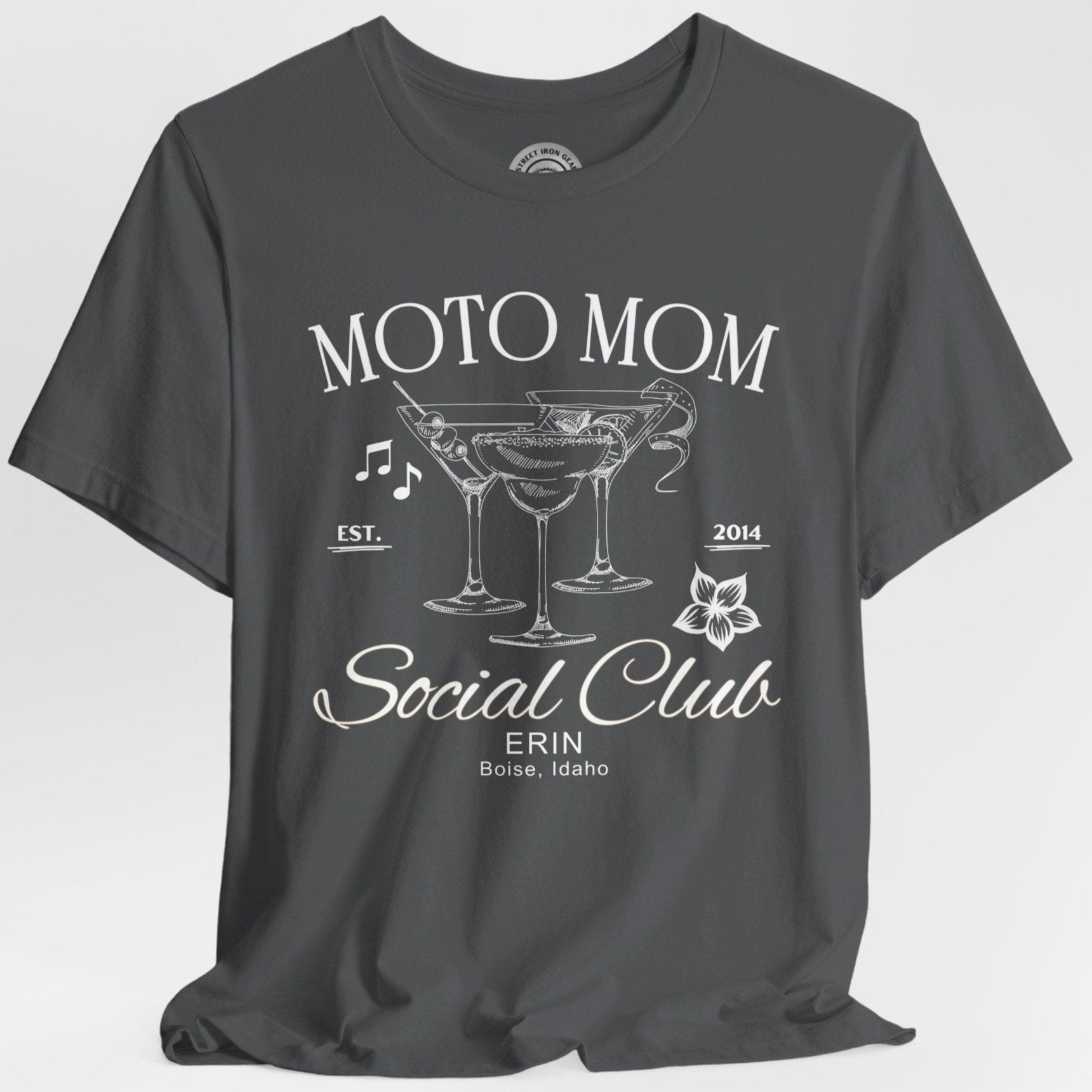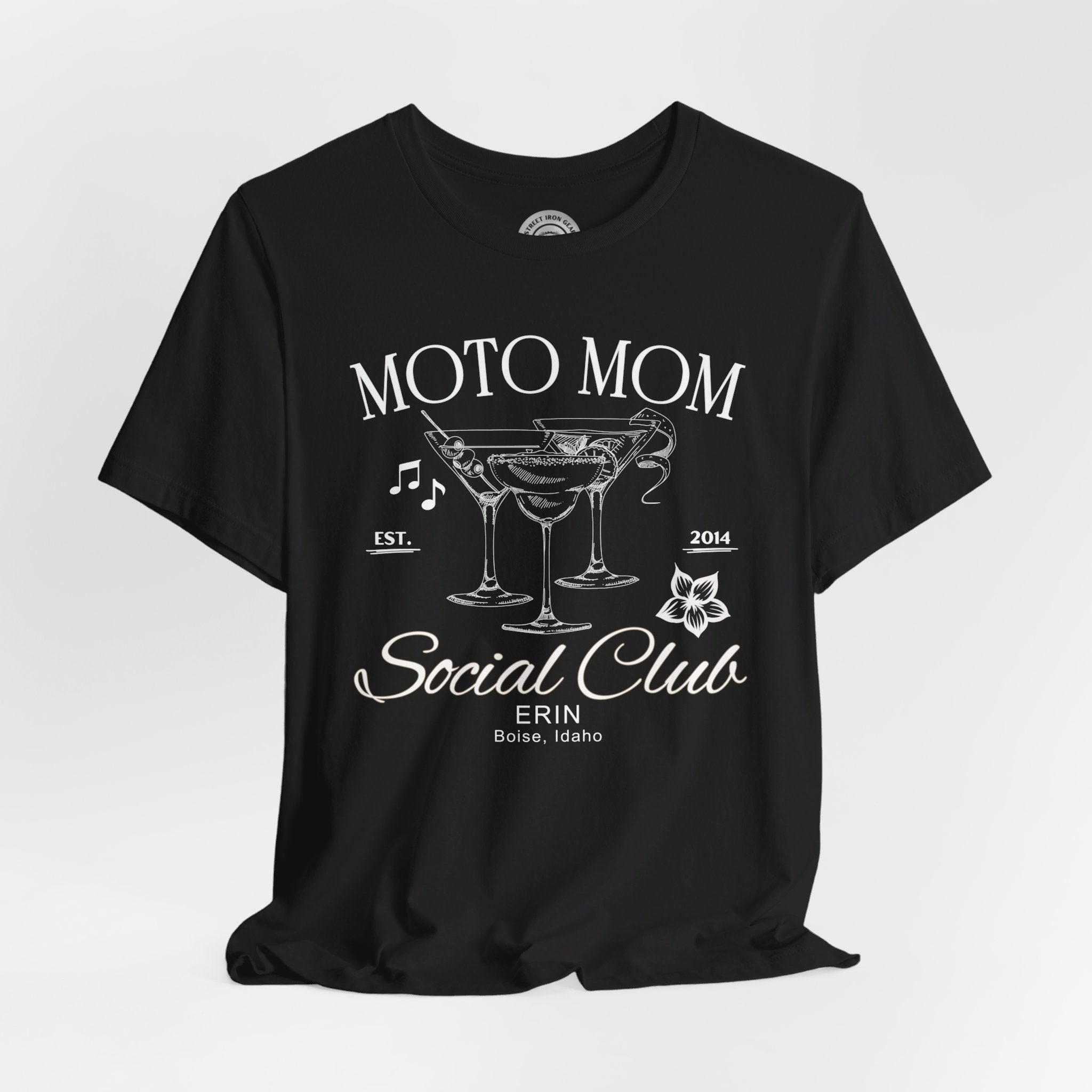 Elevate your ride with our customizable Moto Mom T-shirt, featuring elegant line drawings of fancy cocktails musical notes. Perfect for individual riders or local Can-Am motorcycle groups, you can personalize it with your name and location to make it uniquely yours. Celebrate your love for the open road in style with this exclusive design from StreetIronGear.com!