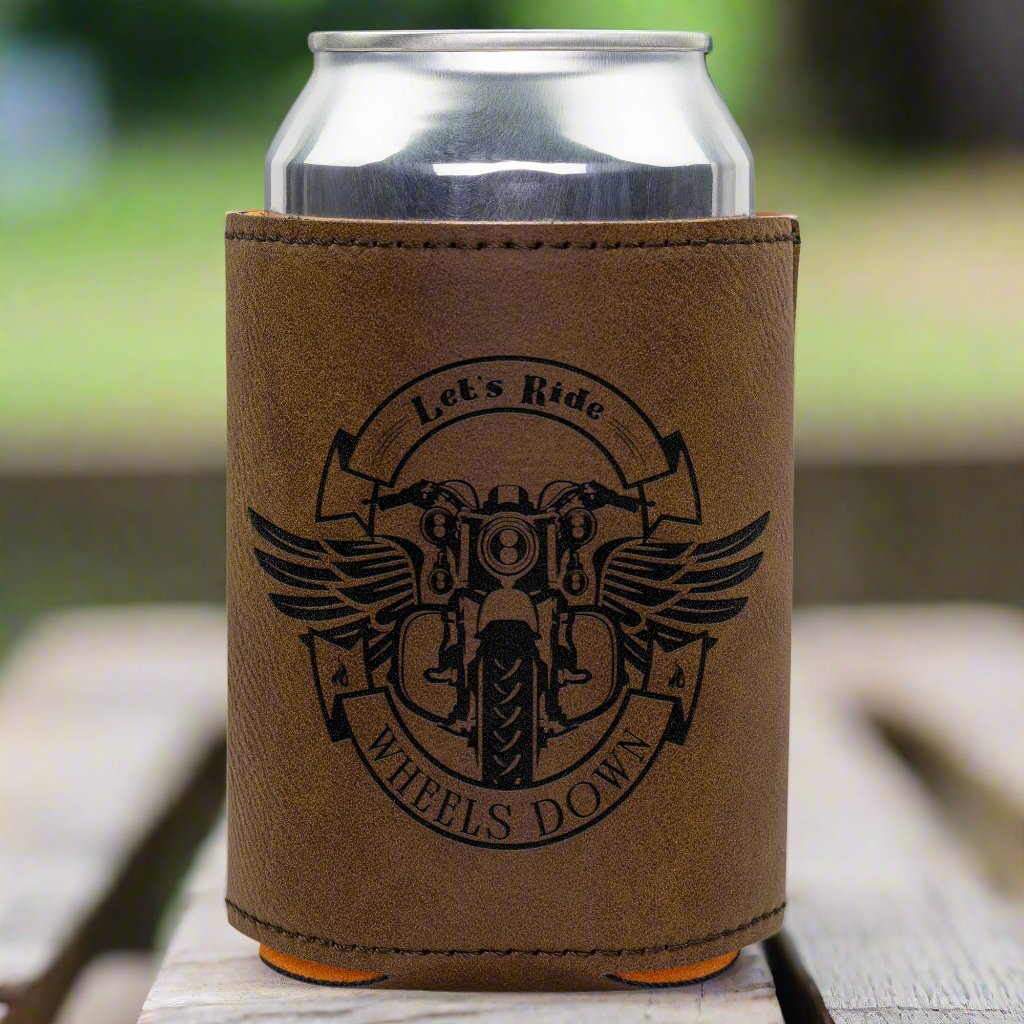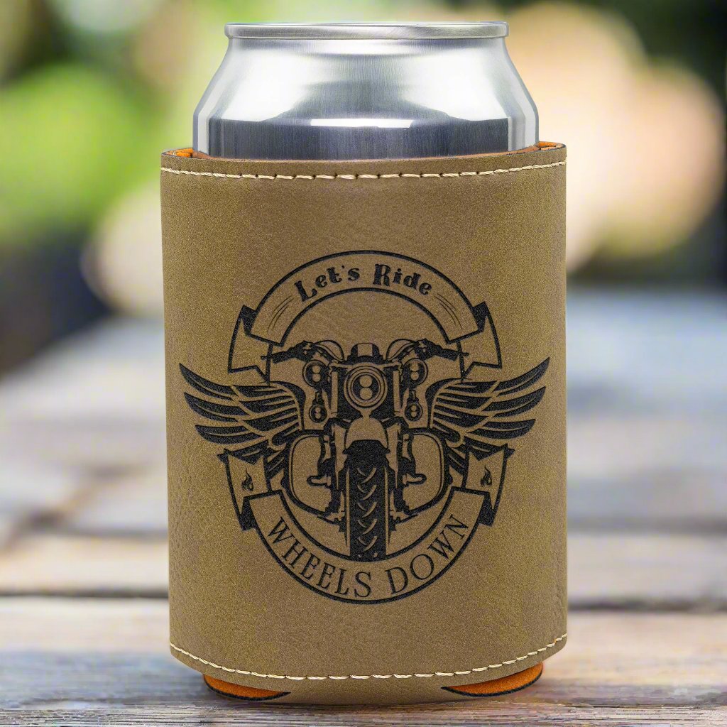 Keep your drinks cool in style with our custom-designed Faux Leather Can Cooler, perfect for motorcycle enthusiasts. Featuring a bold motorcycle image with wings and traditional biker elements, along with the text "Let's Ride Wheels Down," this can cooler is a must-have for any biker. Available in multiple colors, it’s ideal for keeping your beverages cold while showing off your love for the open road. Made with high-quality faux leather, it combines durability with a rugged, classic look.