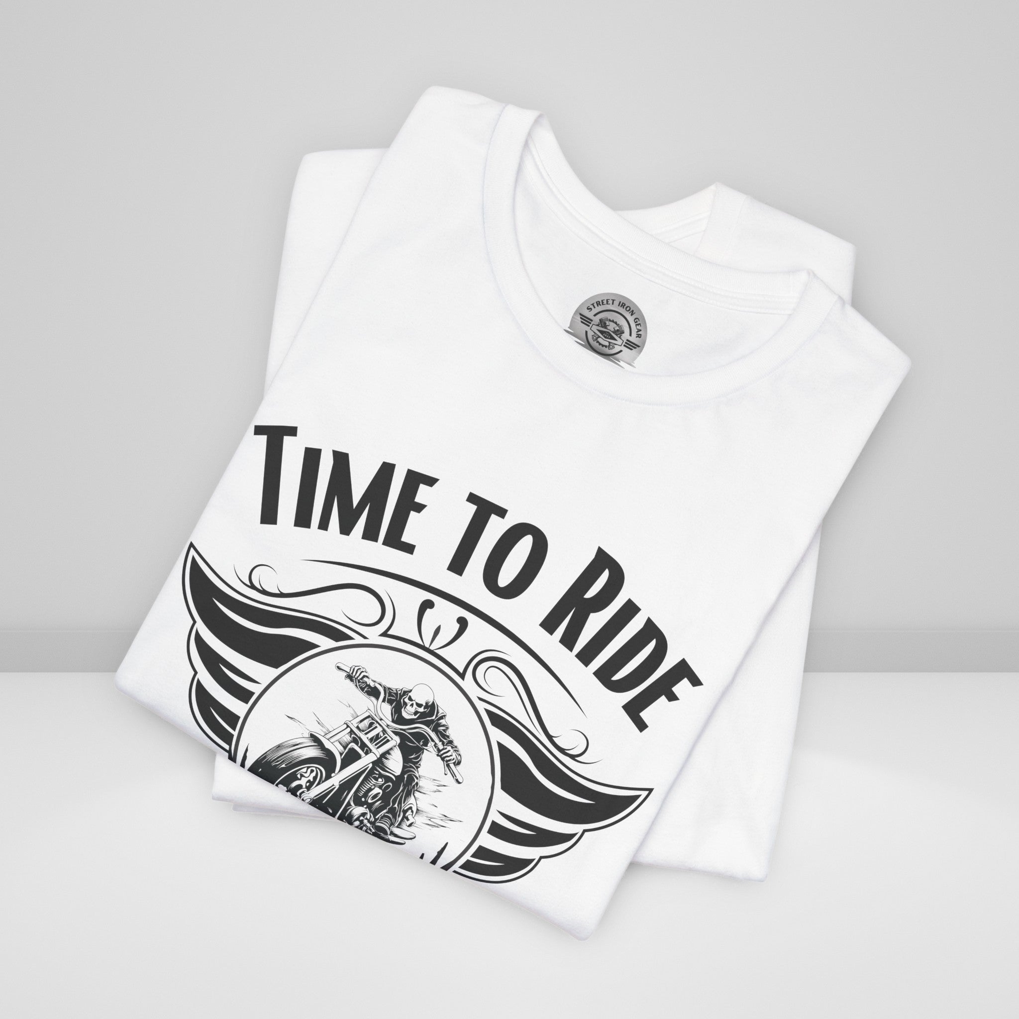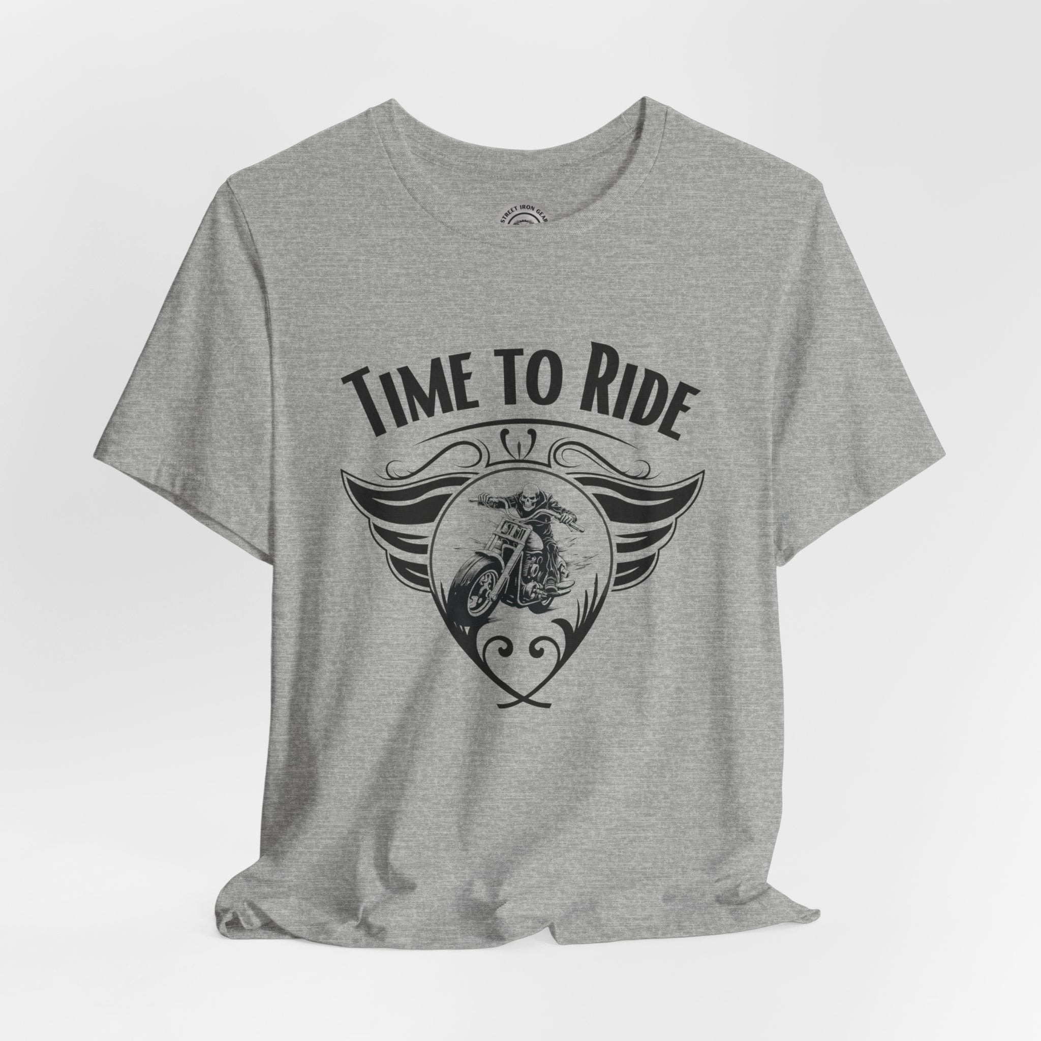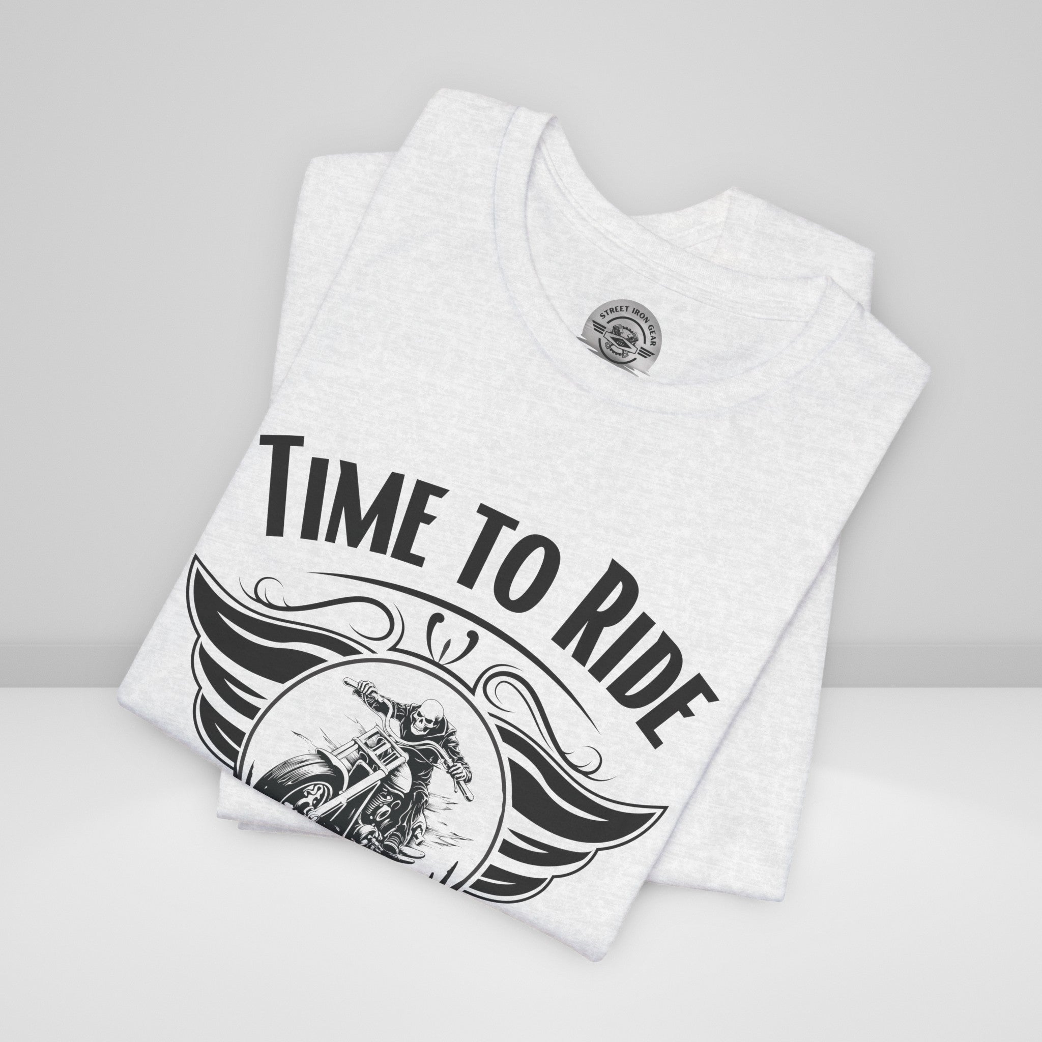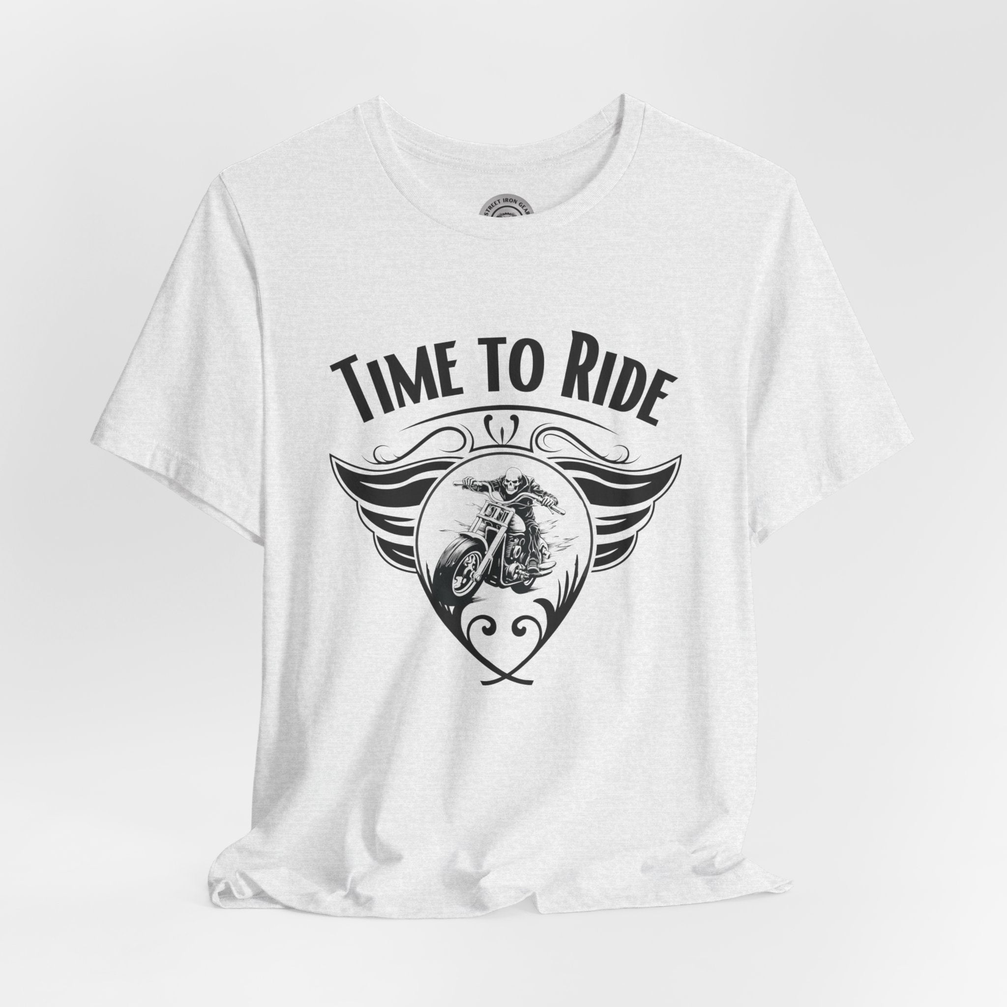 Gear up with our 'Time to Ride' T-shirt! With bold font and a striking Skeleton Ghost on a Motorcycle cruiser graphic, this men's Motorcycle T-shirt is the ultimate biker gift for yourself. Elevate your style and show your love for the open road with this must-have addition to your collection of motorcycle gifts.
