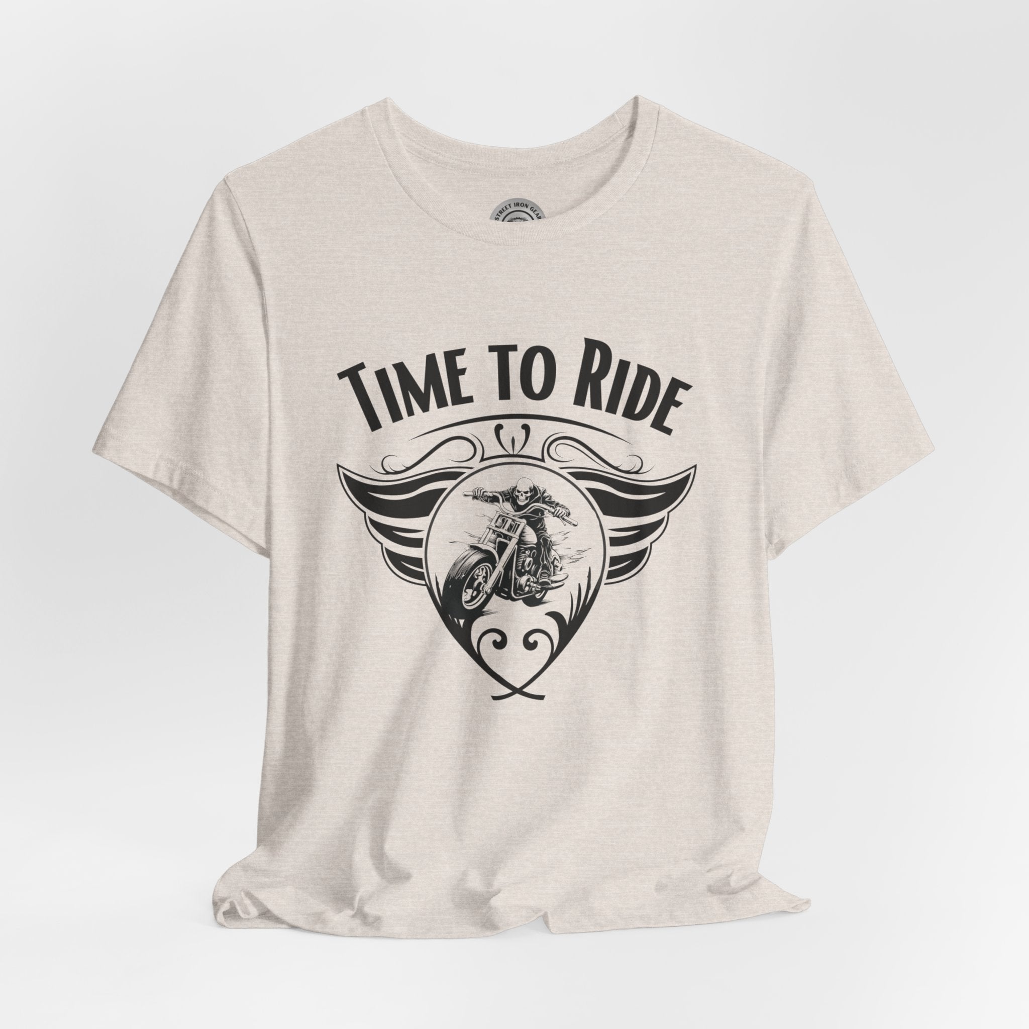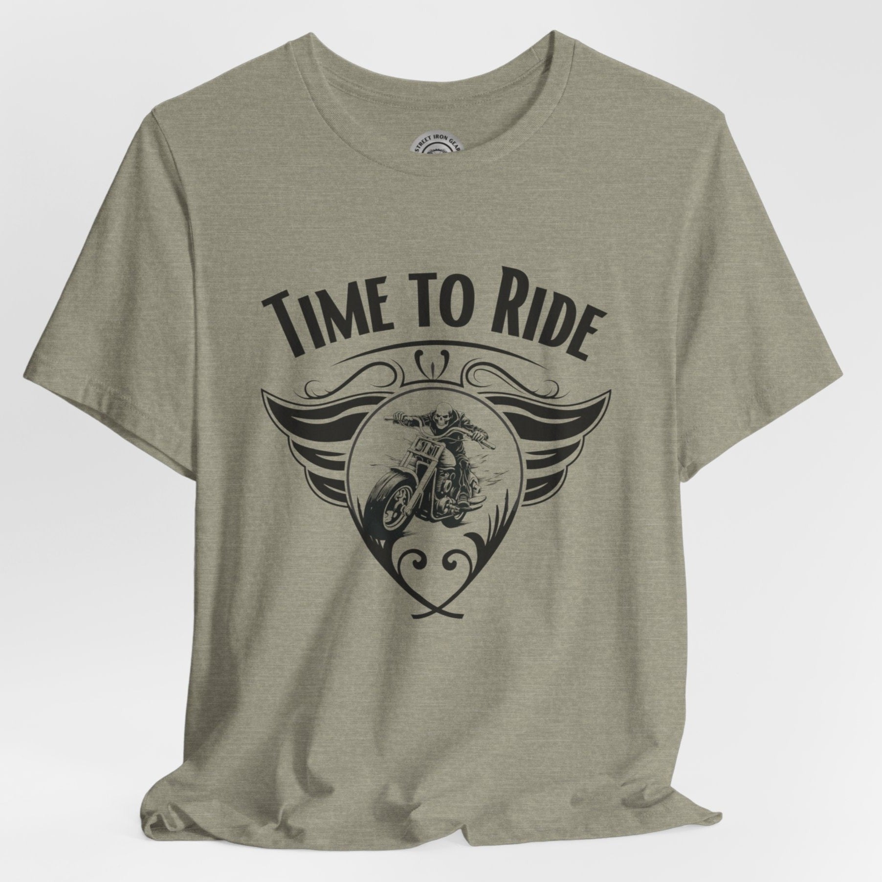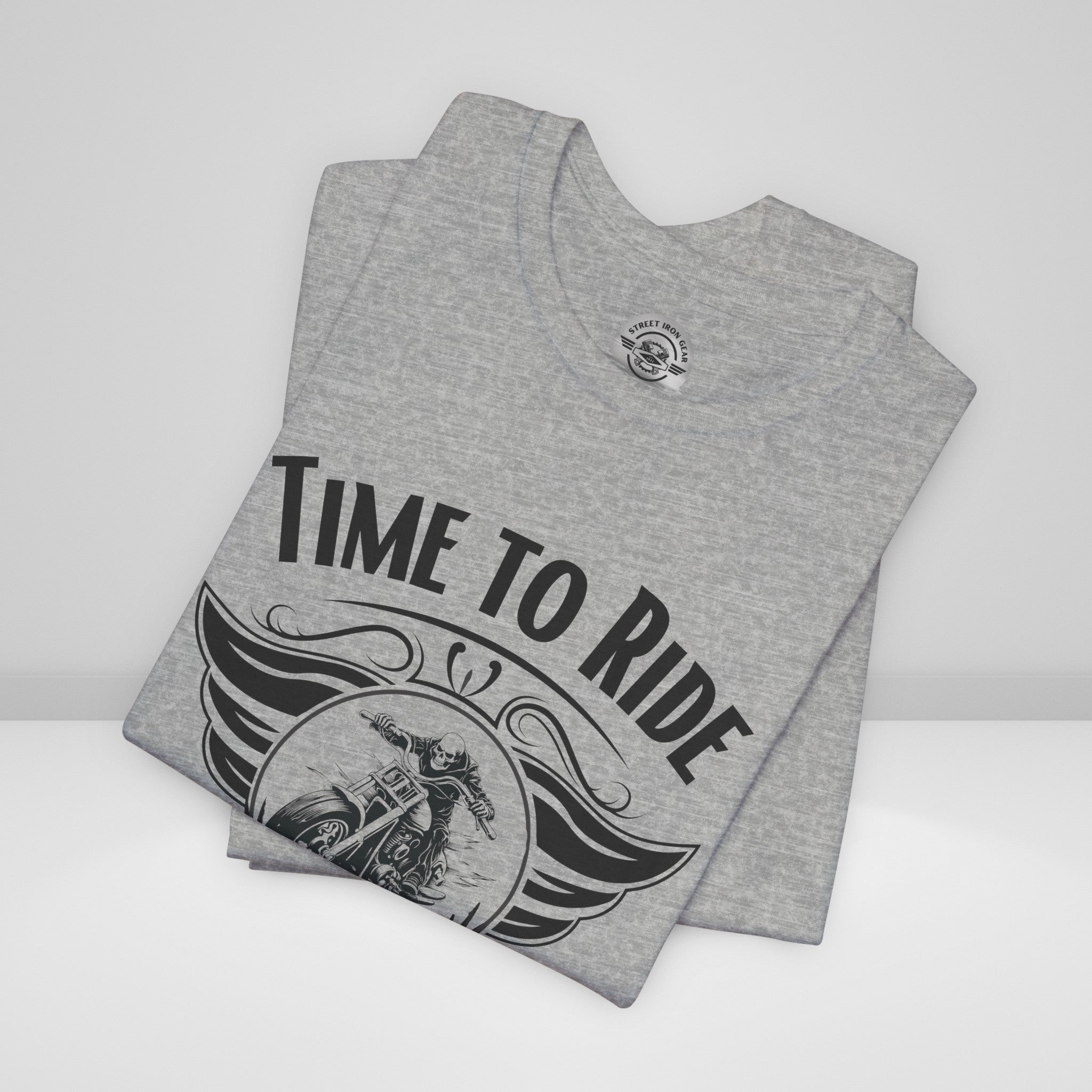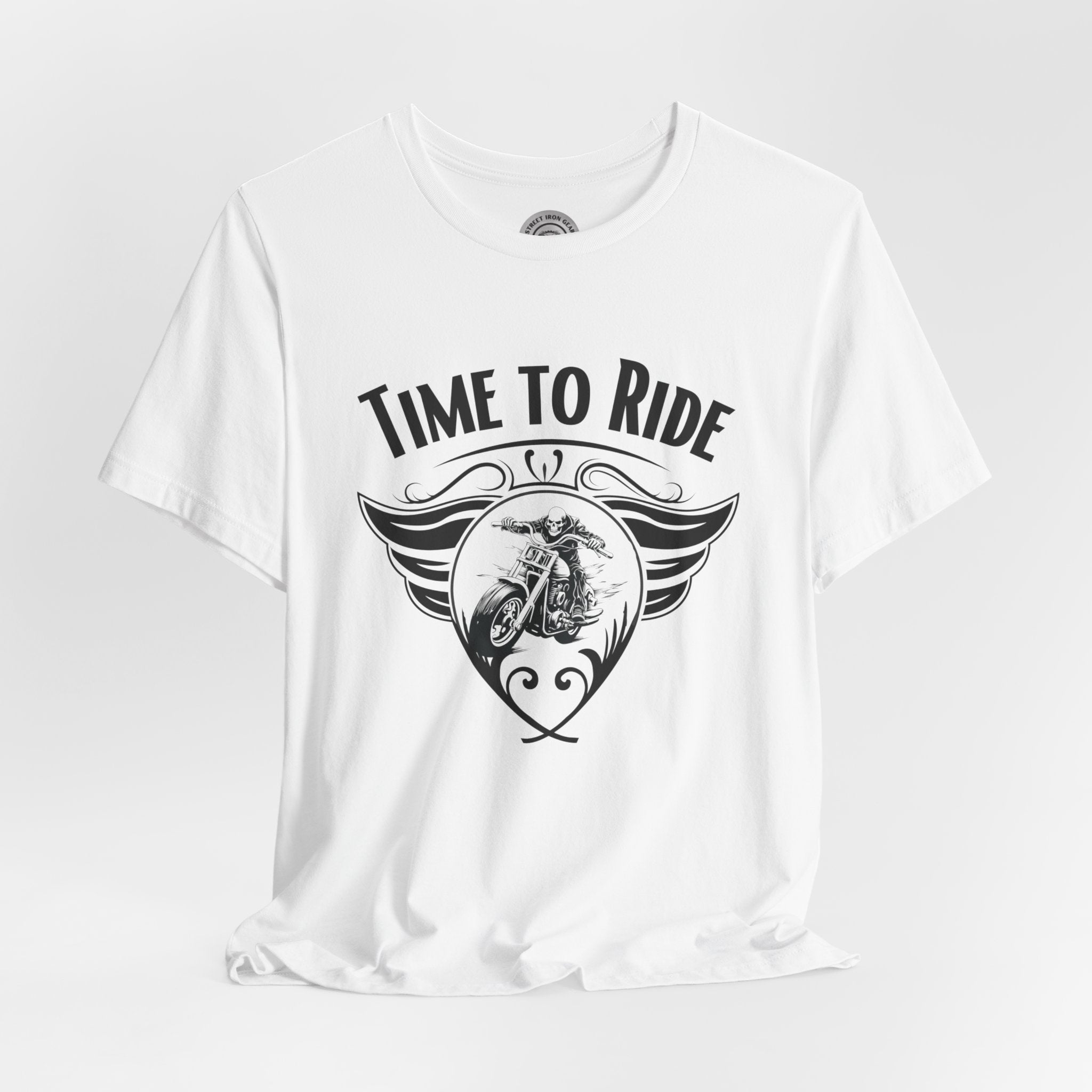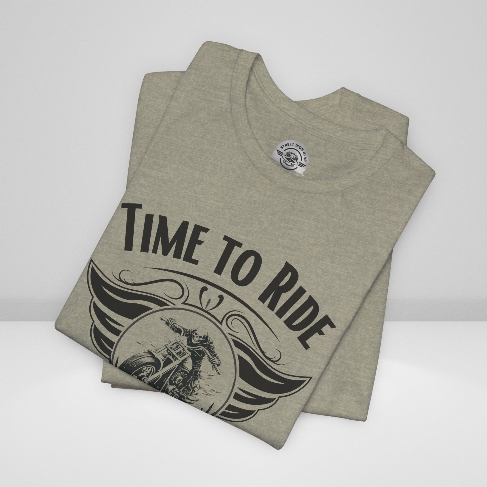 Gear up with our 'Time to Ride' T-shirt! With bold font and a striking Skeleton Ghost on a Motorcycle cruiser graphic, this men's Motorcycle T-shirt is the ultimate biker gift for yourself. Elevate your style and show your love for the open road with this must-have addition to your collection of motorcycle gifts.