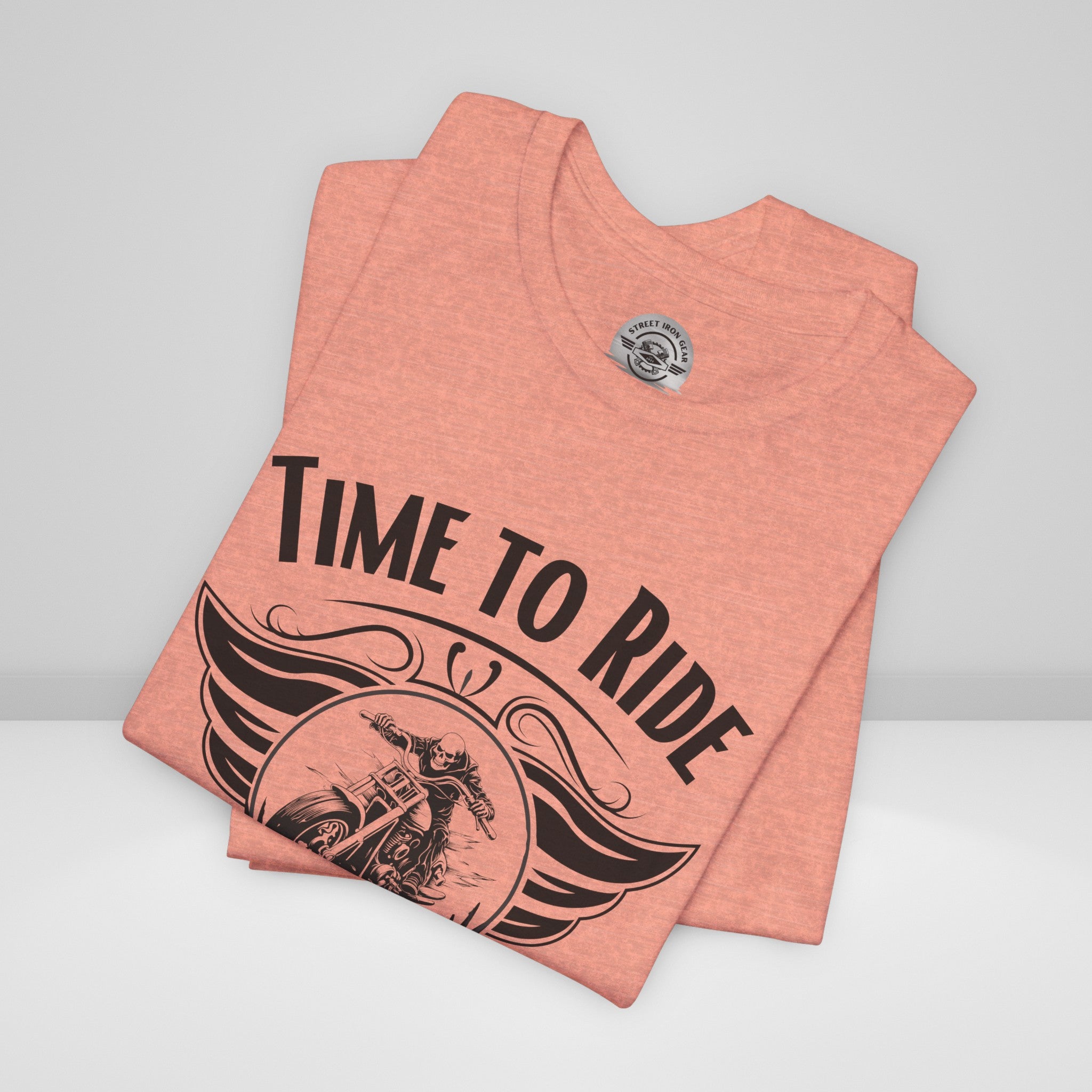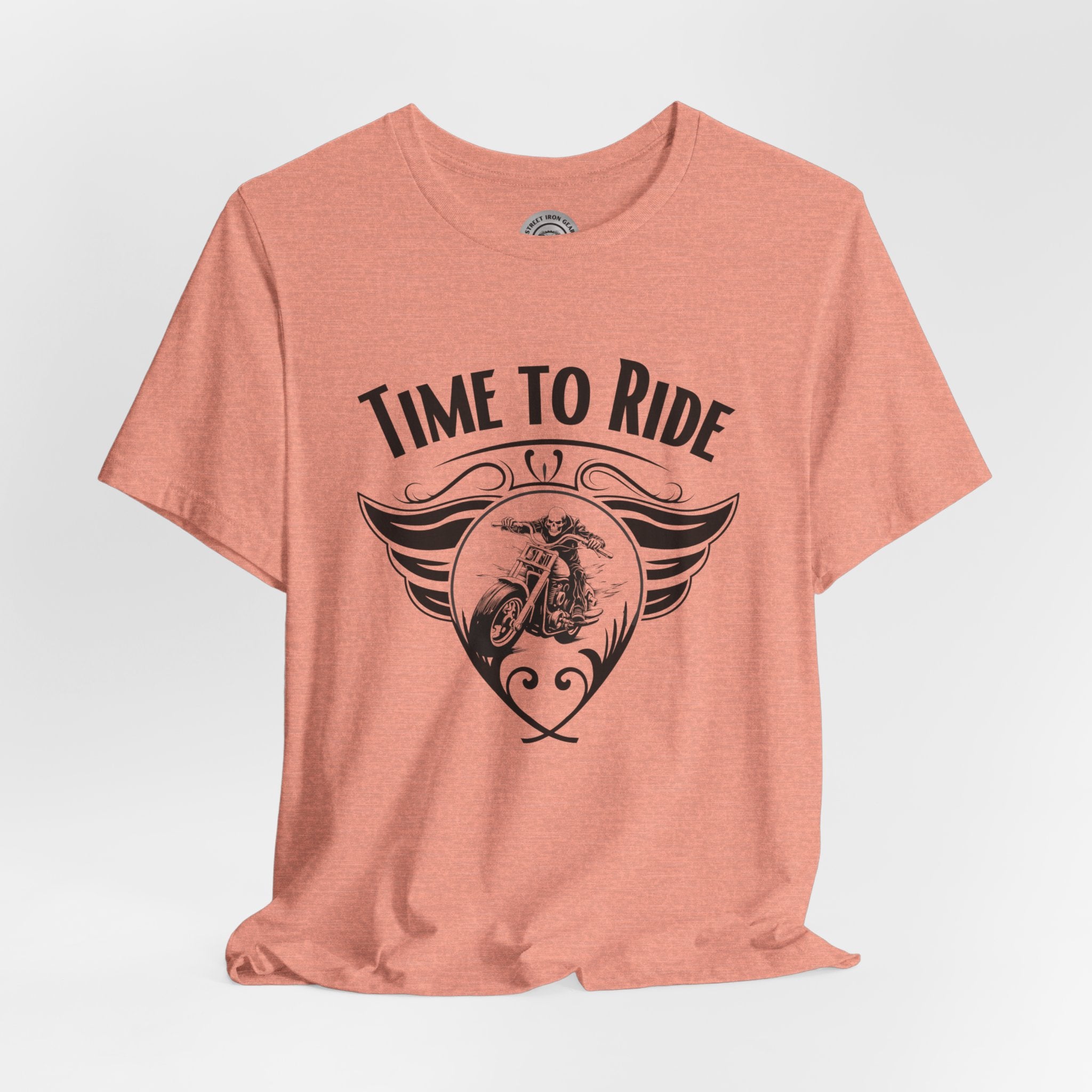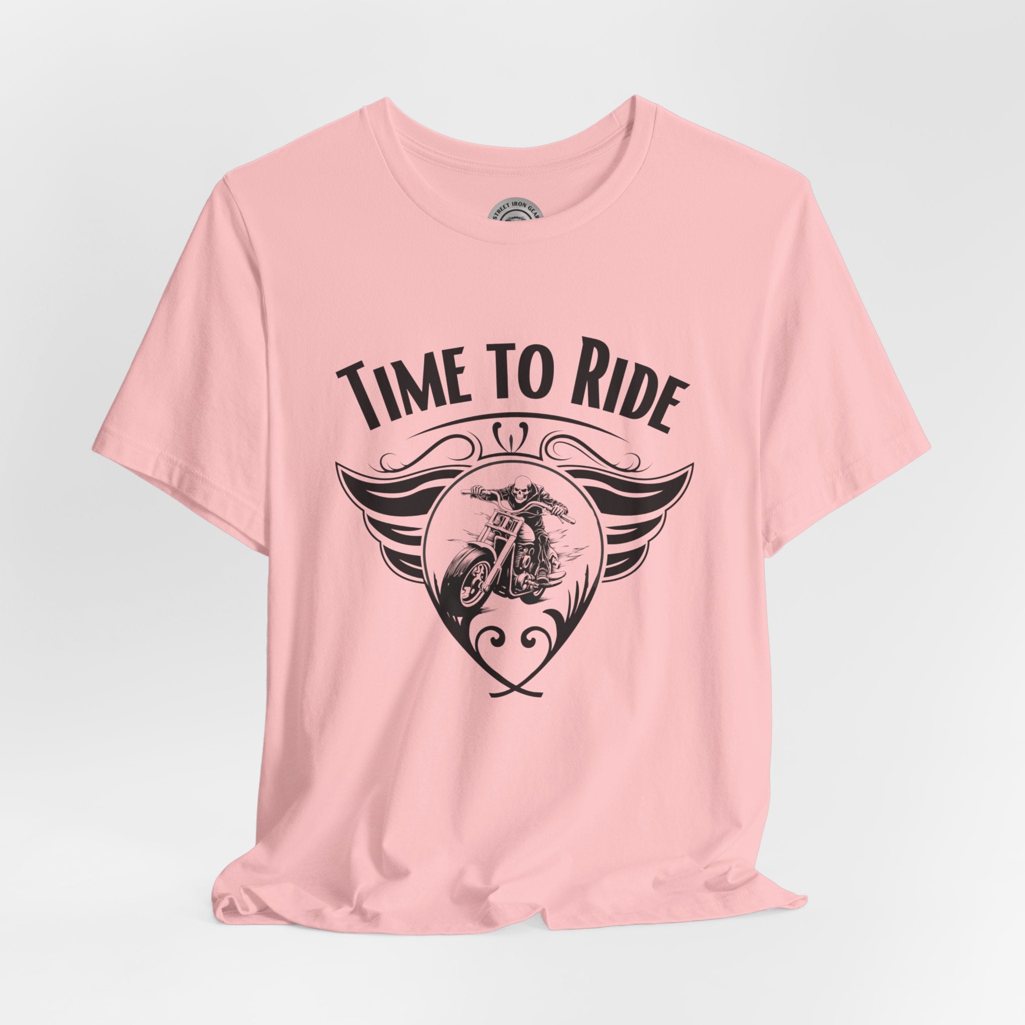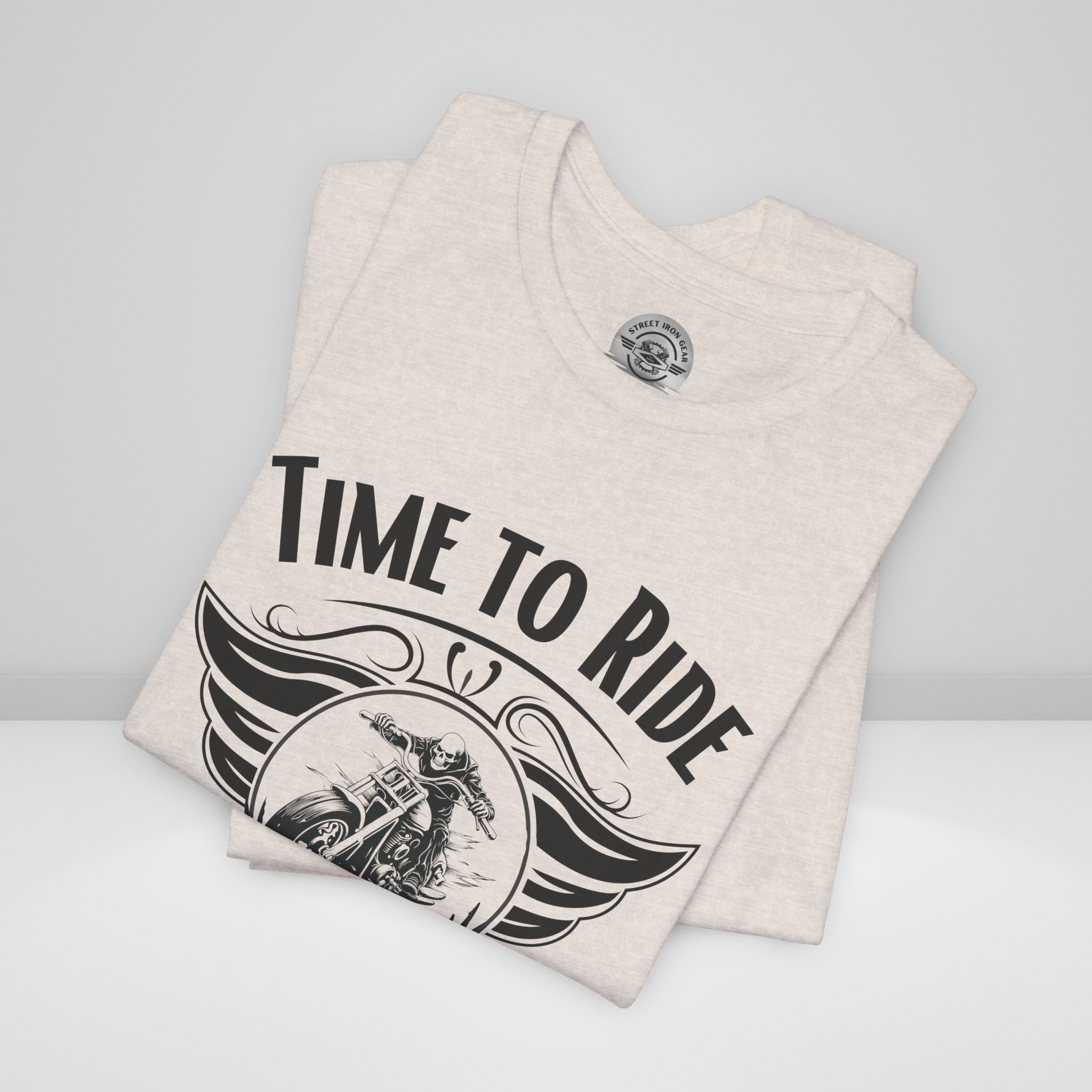 Gear up with our 'Time to Ride' T-shirt! With bold font and a striking Skeleton Ghost on a Motorcycle cruiser graphic, this men's Motorcycle T-shirt is the ultimate biker gift for yourself. Elevate your style and show your love for the open road with this must-have addition to your collection of motorcycle gifts.