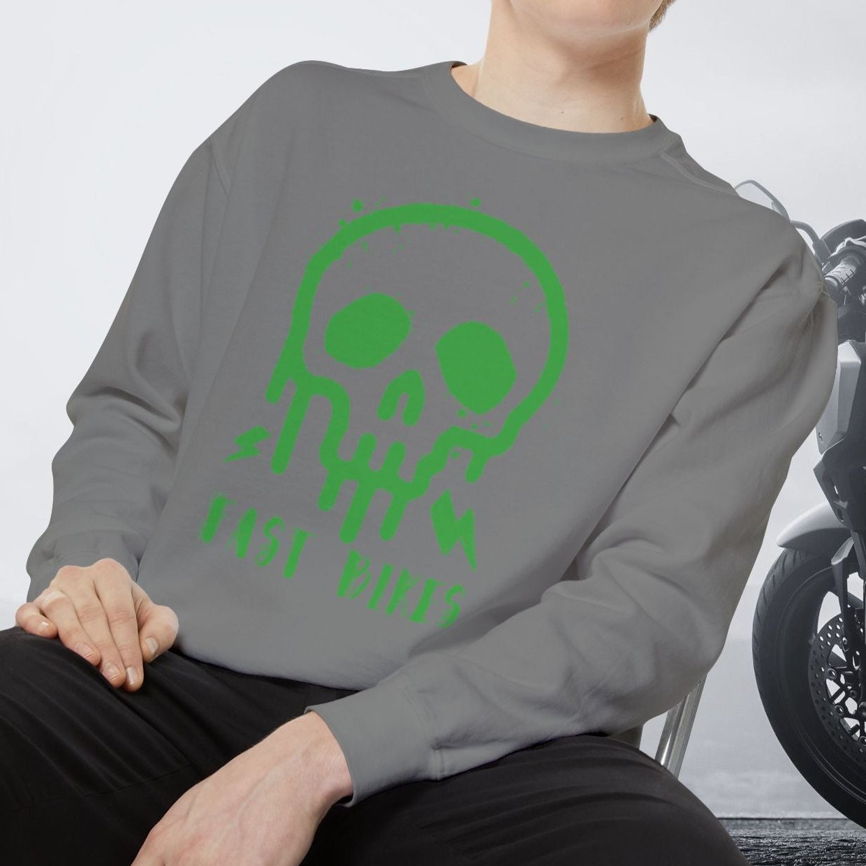 Rev up your style with our premium "Fast Bikes" sweatshirt, featuring a bold neon green skull graphic that embodies the thrill of the ride. Crafted from high-quality materials, this sweatshirt offers both comfort and durability, making it perfect for motorcycle enthusiasts who want to showcase their passion for speed and adventure. Whether you're hitting the road or hanging out with fellow riders, this eye-catching design is sure to turn heads. Ideal for those who love fast bikes and edgy, standout fashion, this sweatshirt is a must-have addition to your collection.