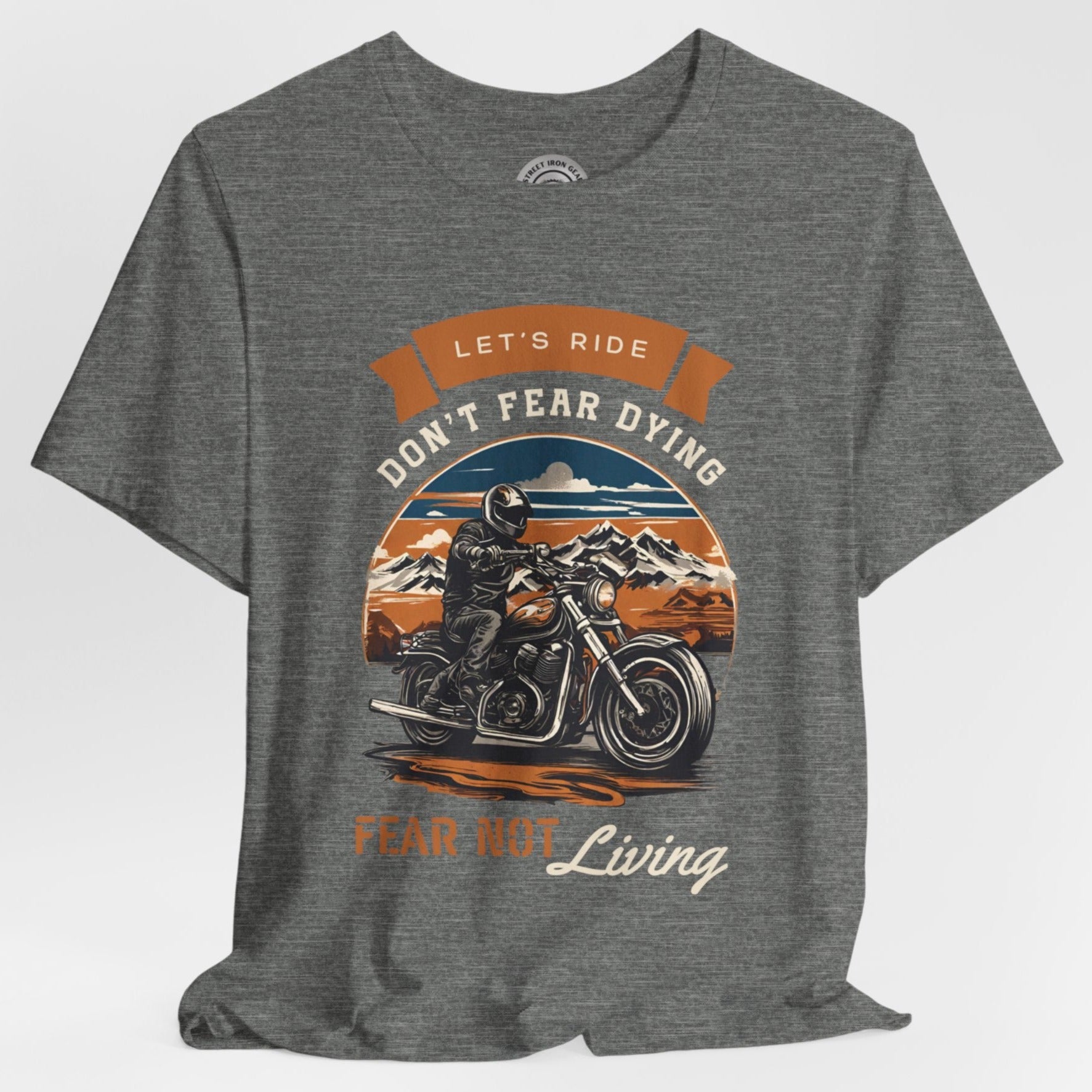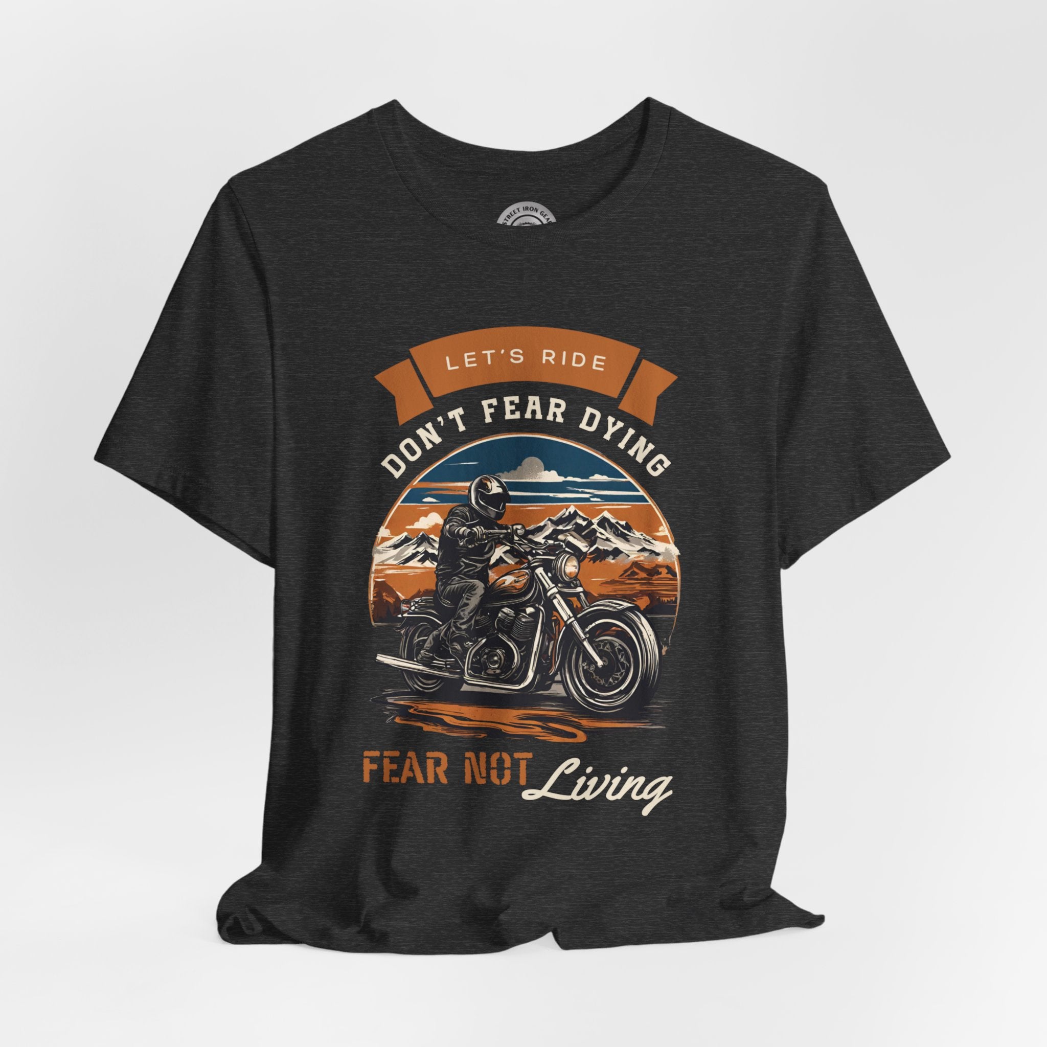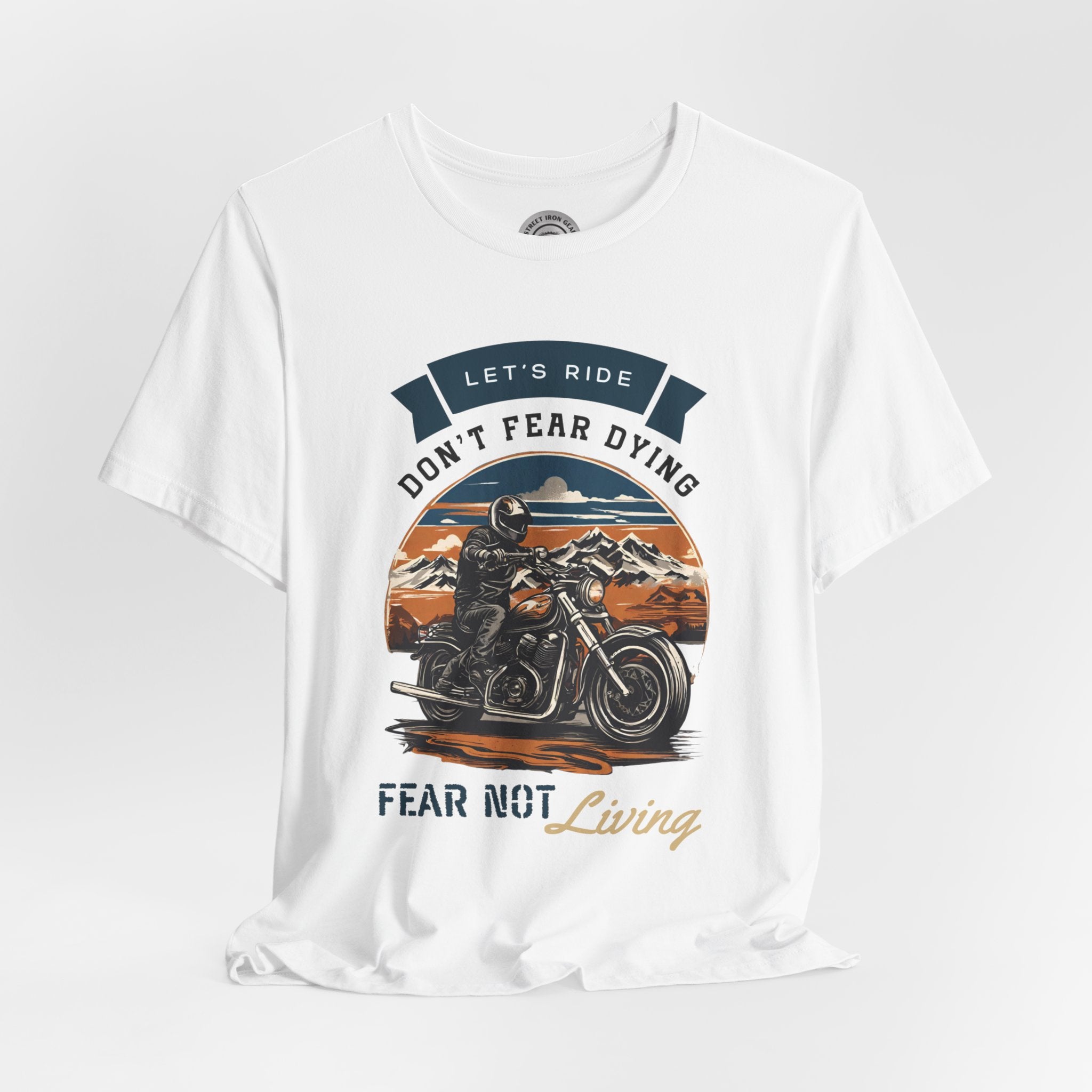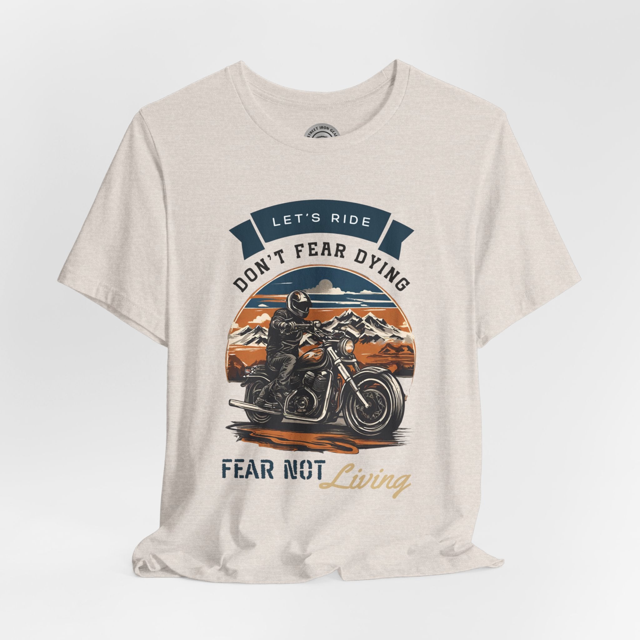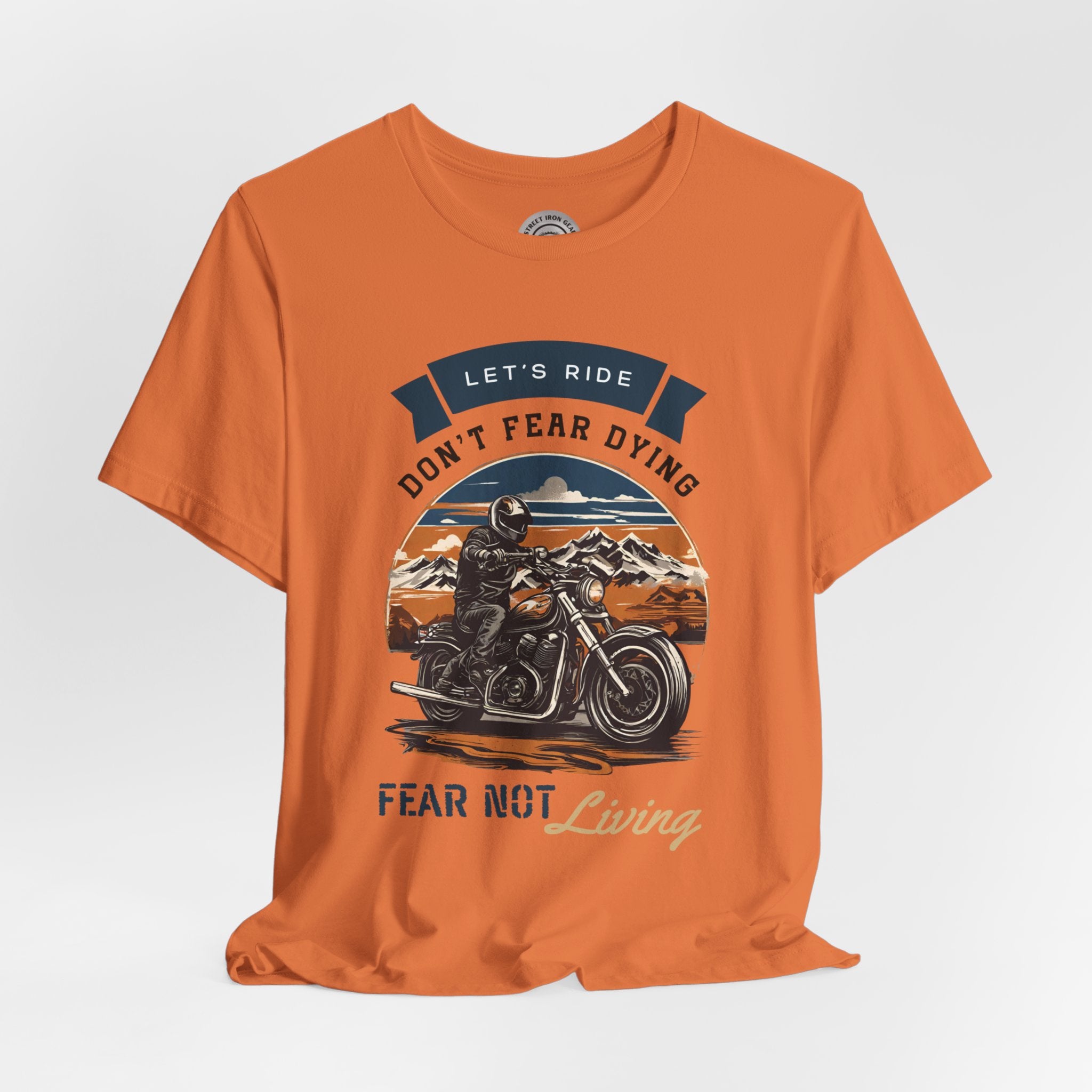 Seize the day and the open road with our "Don't fear Dying, Fear Not Living. Let's Ride." Motorcycle T-shirt. This bold tee features a biker on a cruiser motorcycle, bathed in the sun's warm embrace, symbolizing the fearless pursuit of life's adventures.