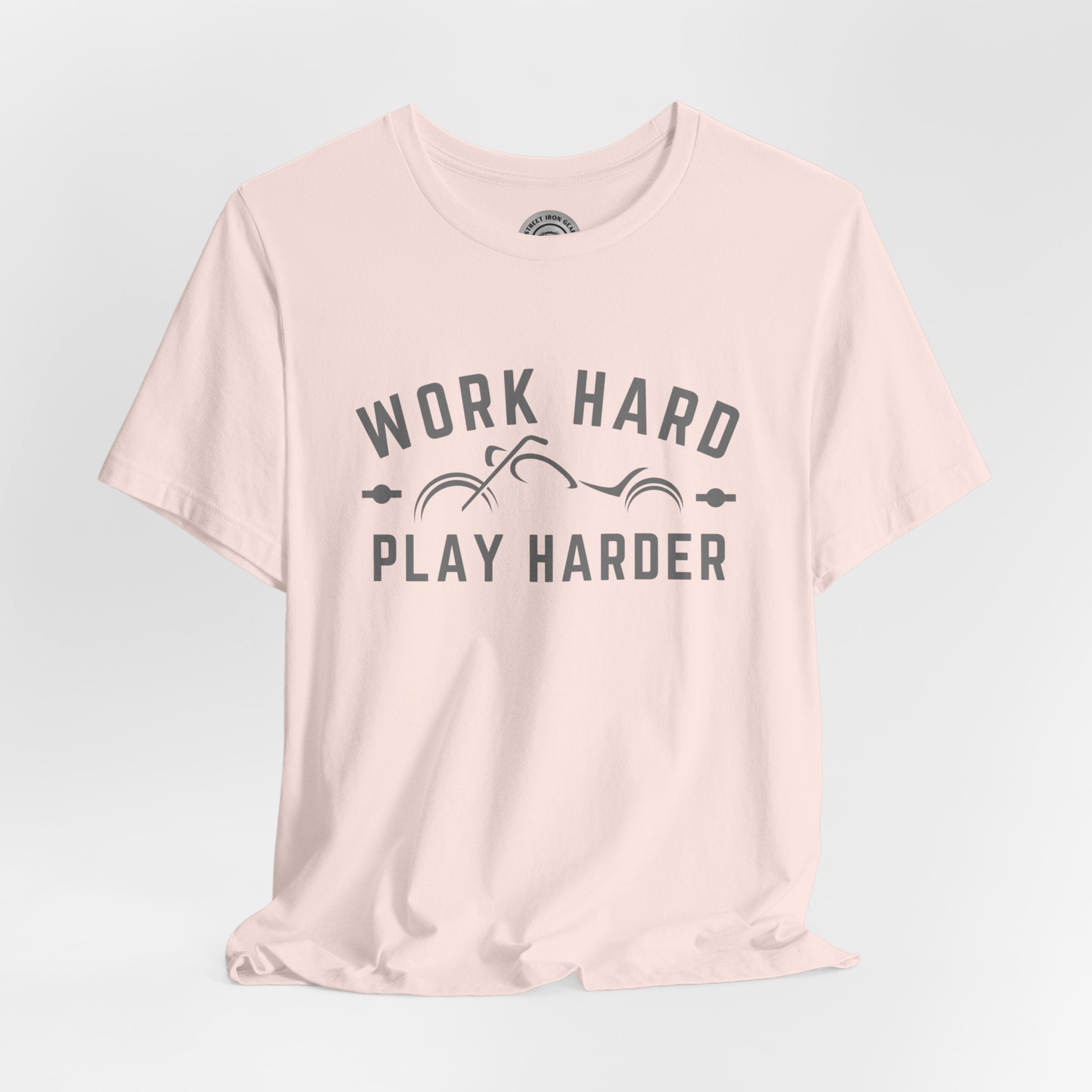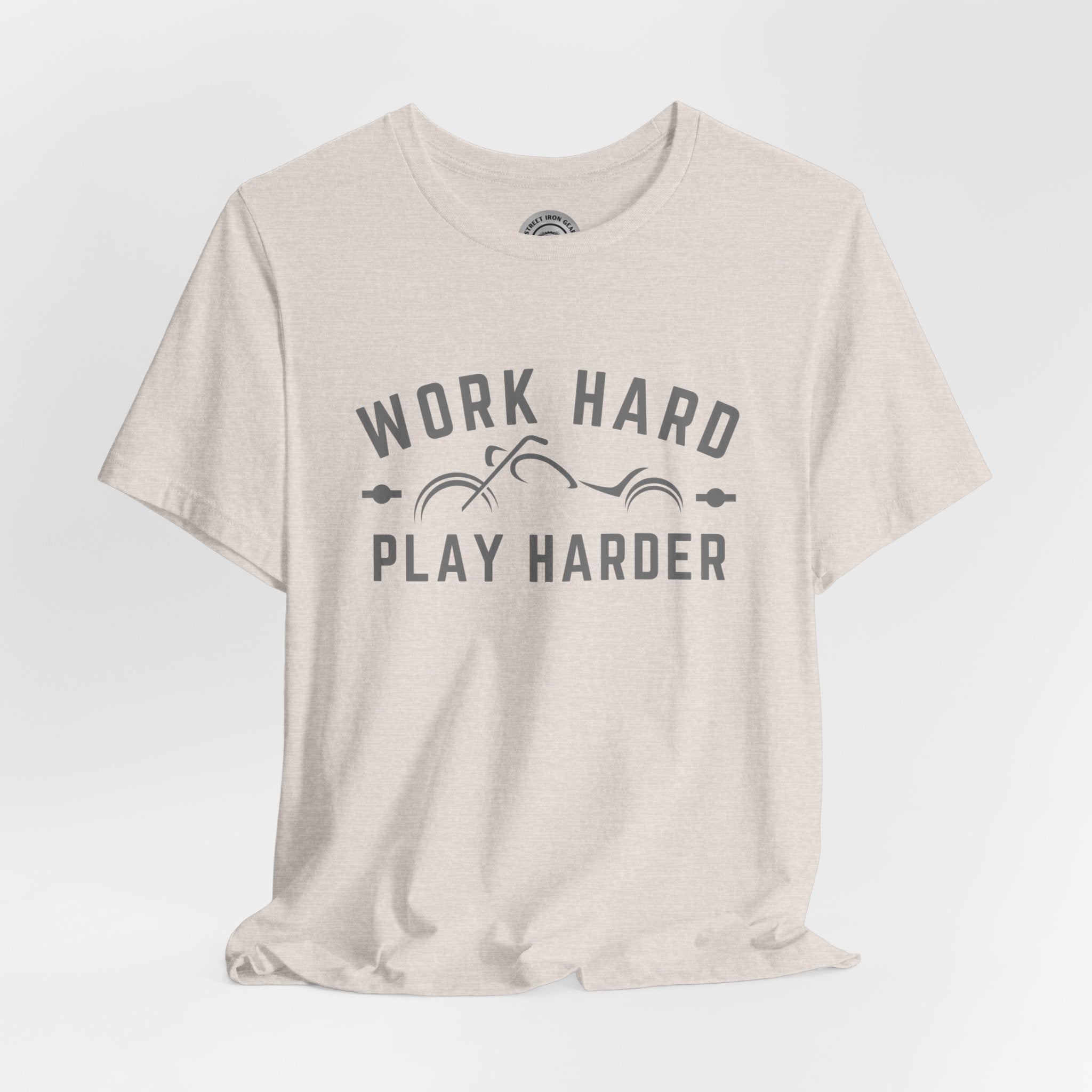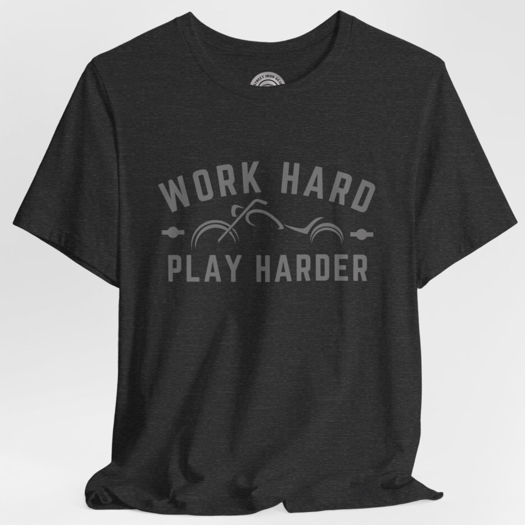 Embrace the perfect balance with our "Work Hard. Play Harder" T-shirt, featuring a sleek motorcycle outline that symbolizes freedom and adventure. Crafted from premium cotton, this tee offers unmatched comfort and durability for your active lifestyle. Ideal for motorcycle enthusiasts and those who live life to the fullest, this shirt is a must-have addition to your casual wardrobe.