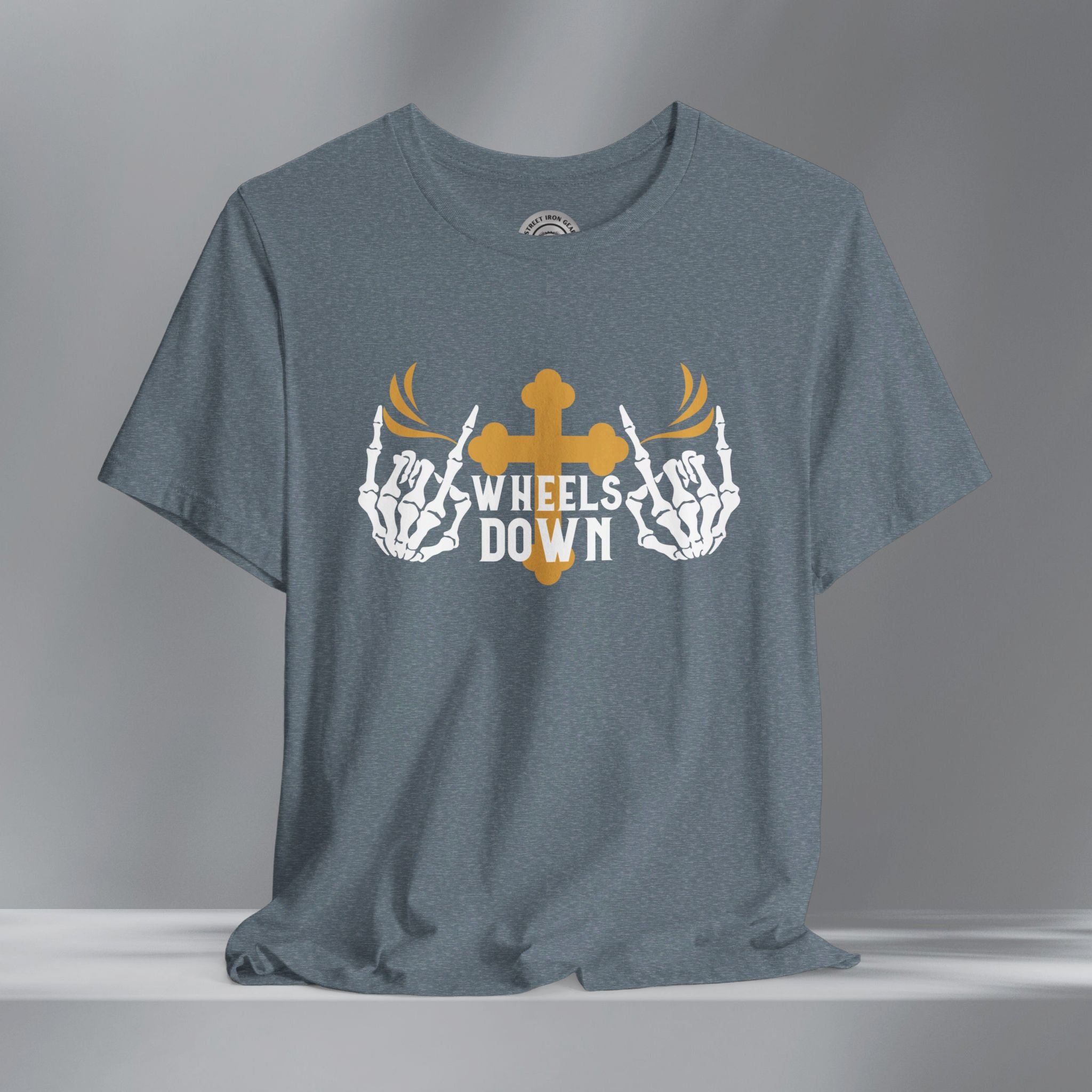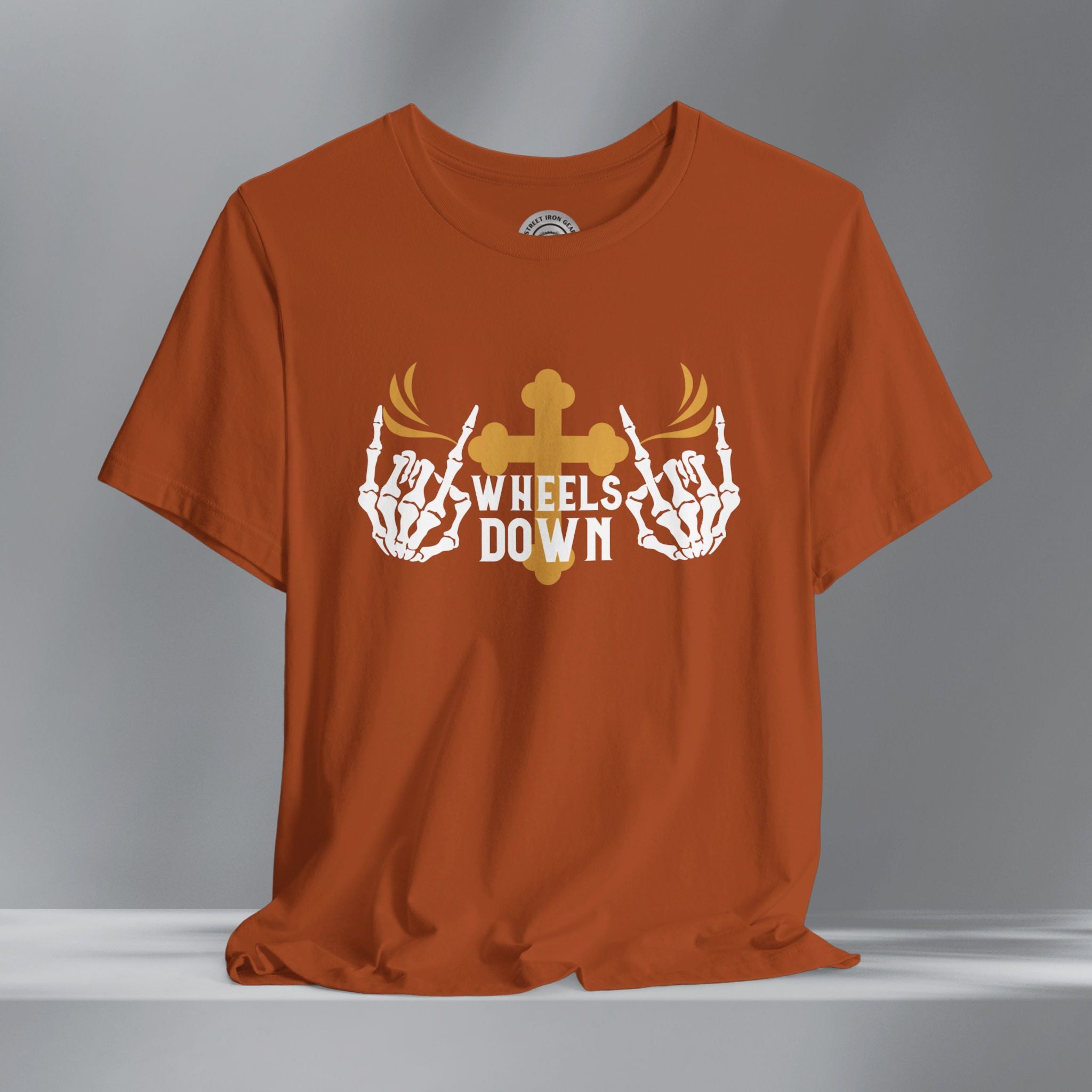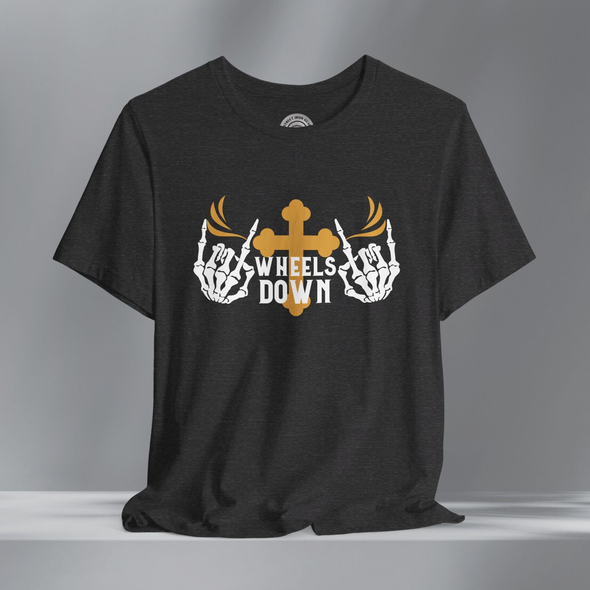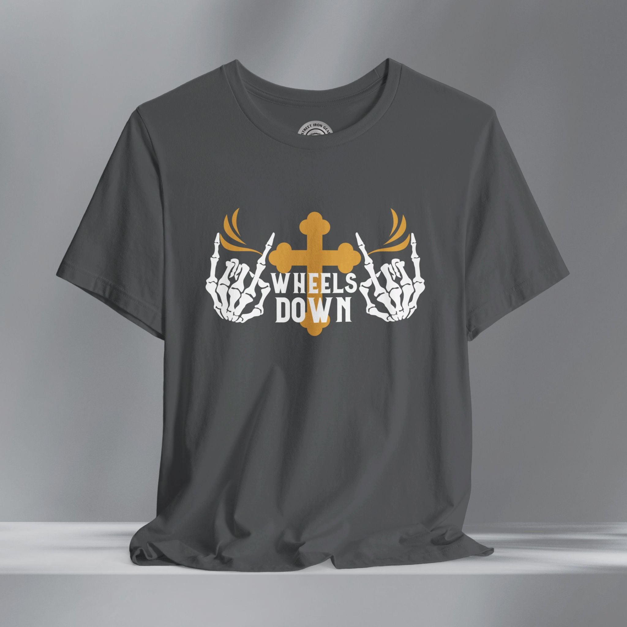 This super soft t-shirt features a bold design with a set of skeleton hands gripping a gold cross with wings, accompanied by the text Wheels Down. Perfect for motorcycle enthusiasts and those who love edgy, statement-making apparel, this shirt combines comfort with a striking graphic. Ideal for cooler rides or casual wear, it's a must-have for anyone looking to showcase their love for the open road in style.