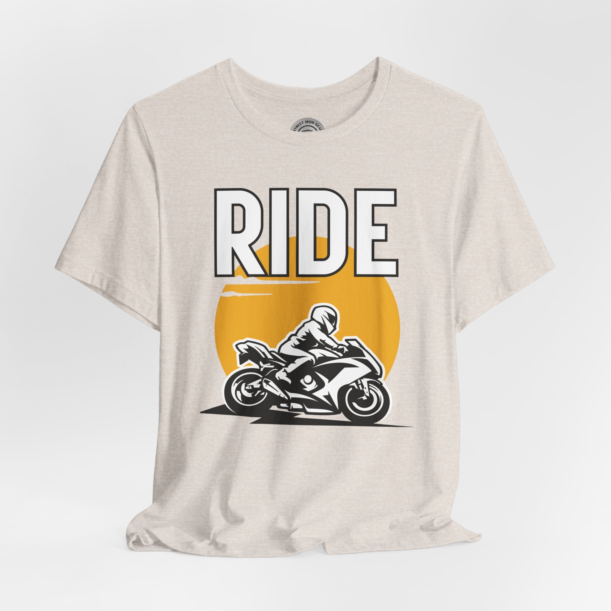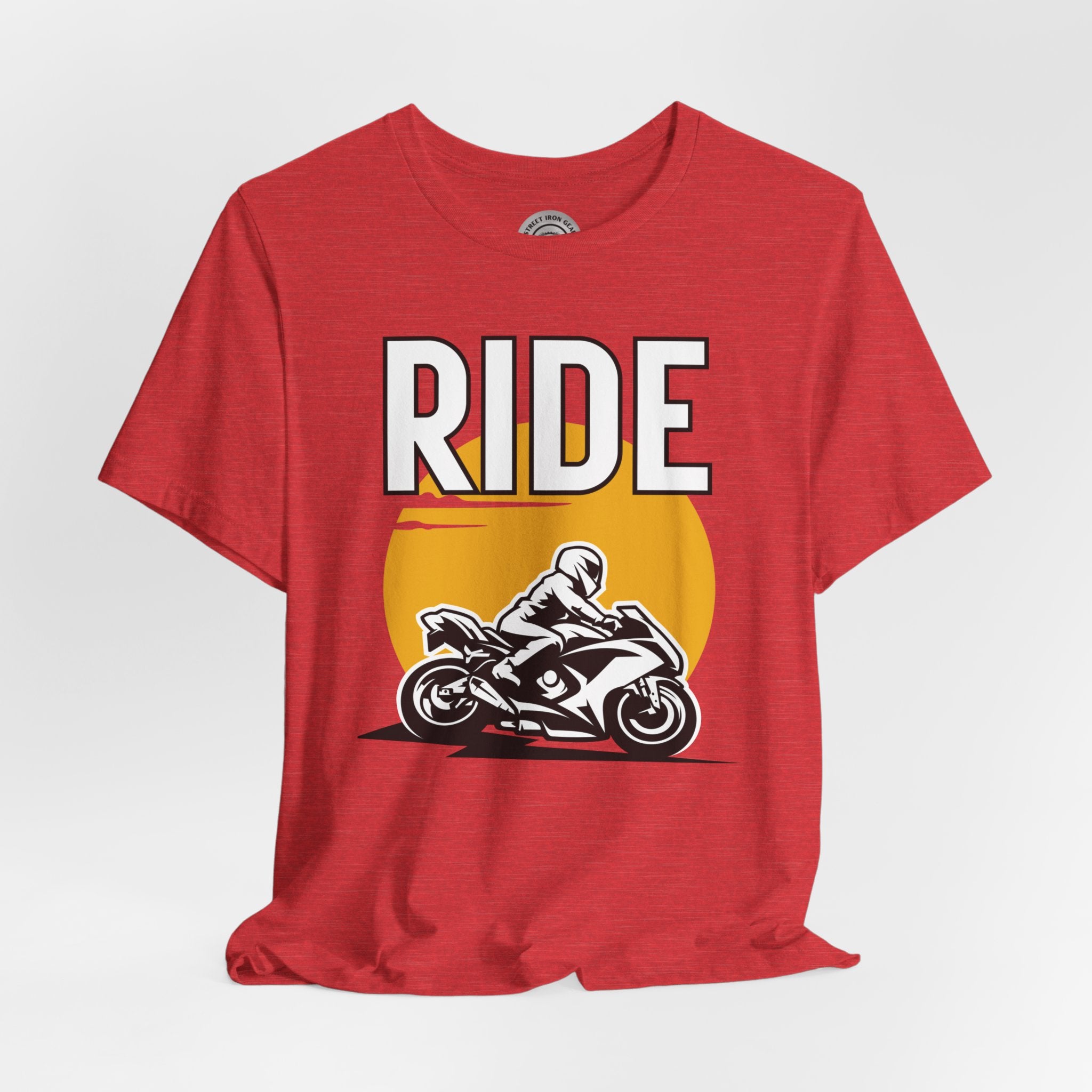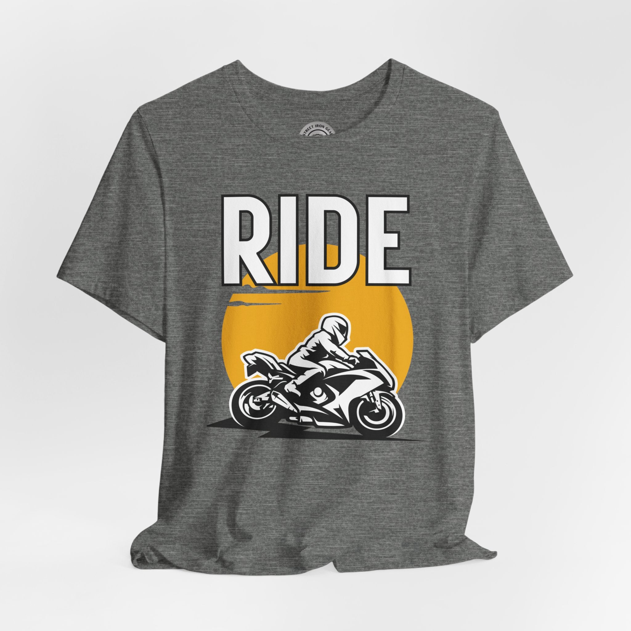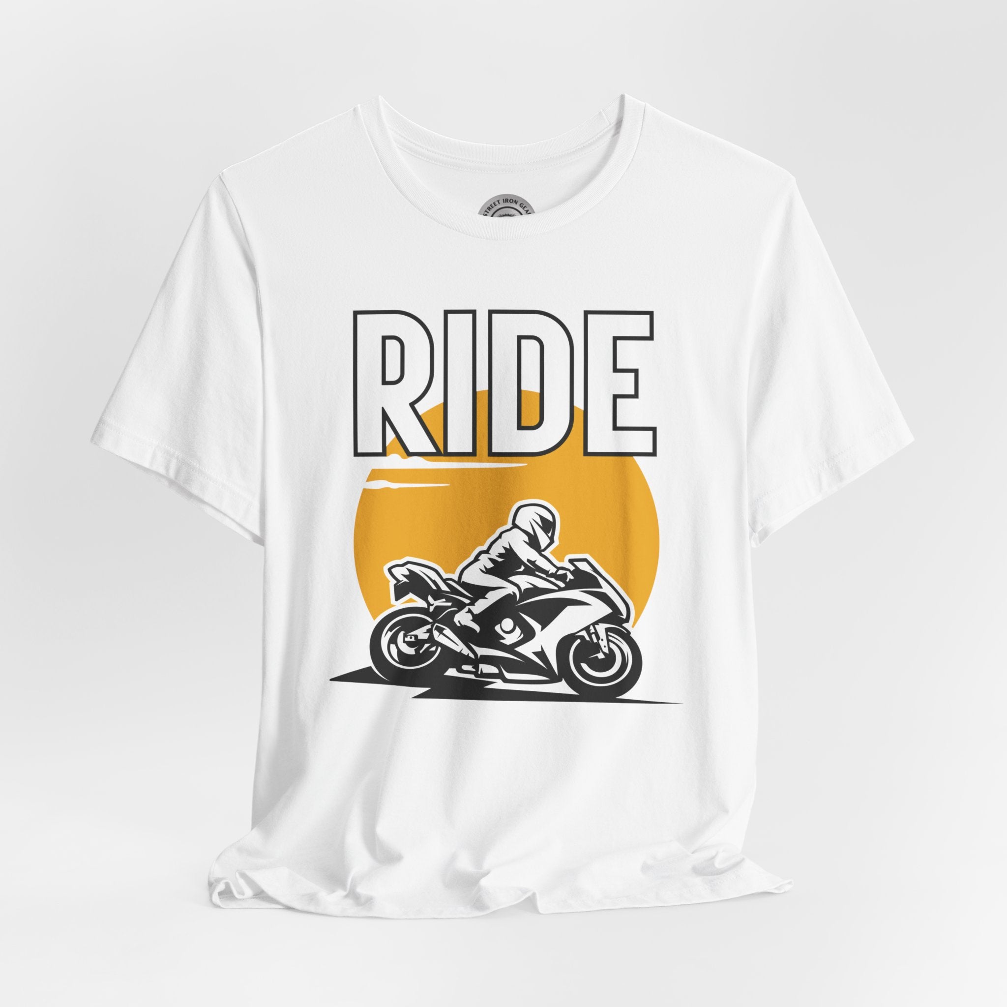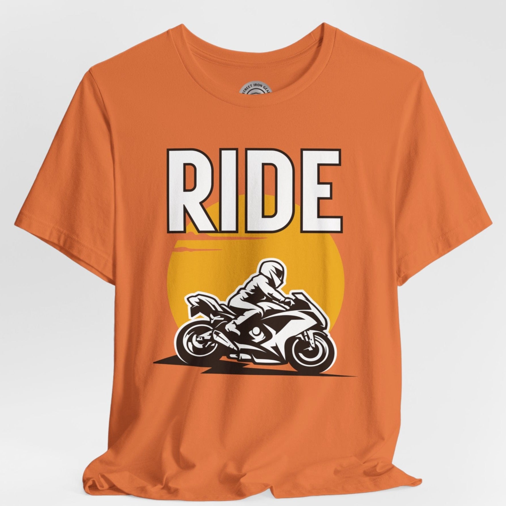 Unleash your passion with our 'RIDE' T-shirt. In bold font and featuring a large silhouette of a sports bike, this men's Motorcycle T-shirt is a must-have for every 'ride or die' enthusiast. It's the perfect addition to your collection of motorcycle gifts for yourself.