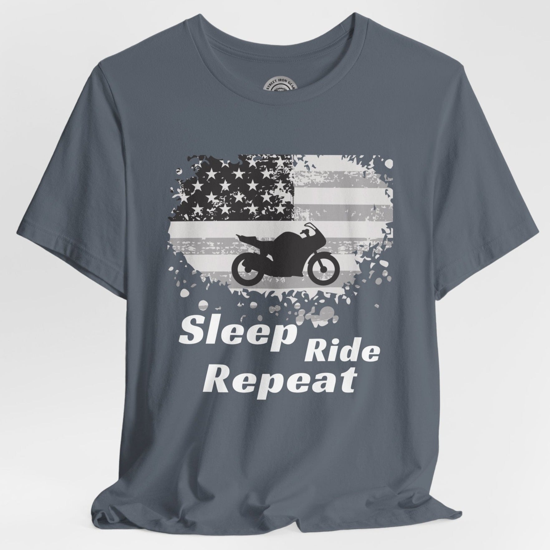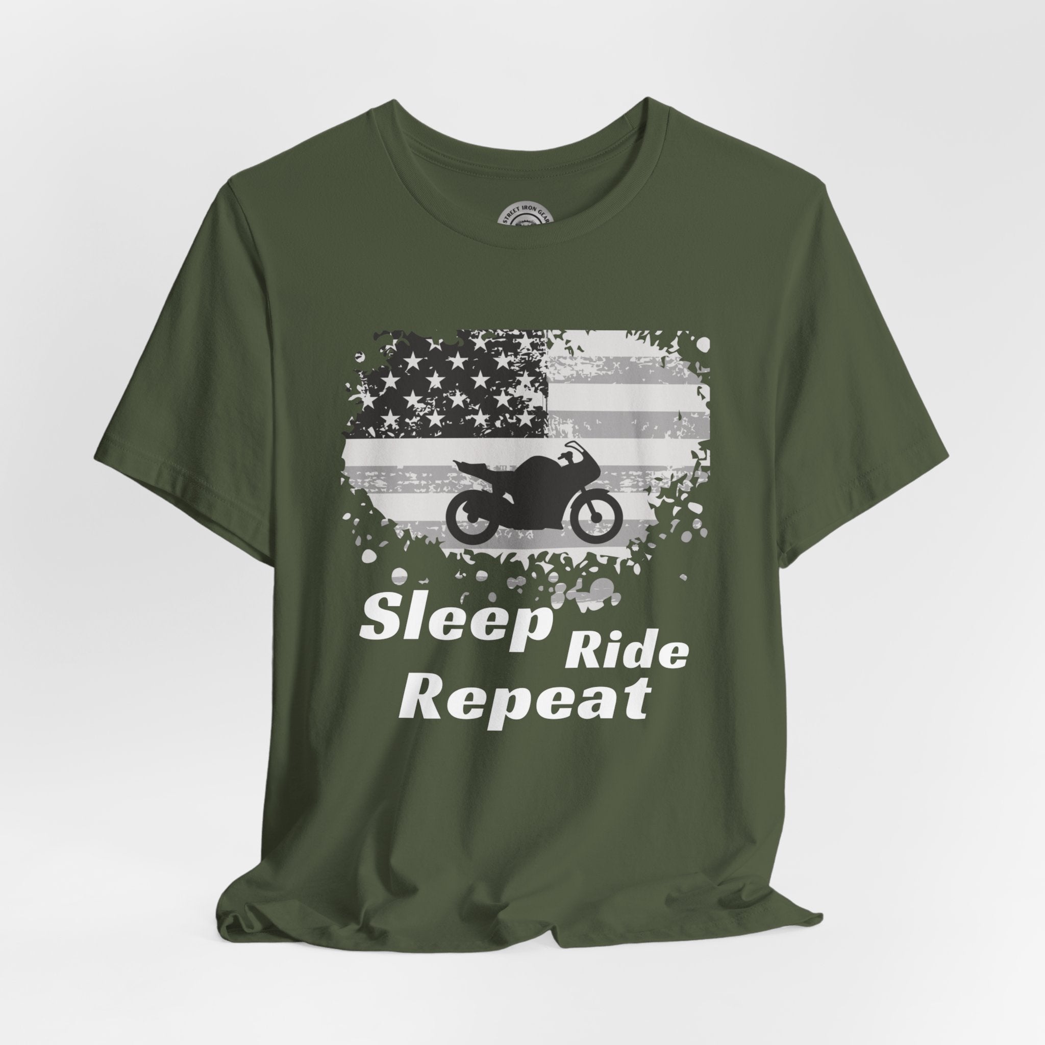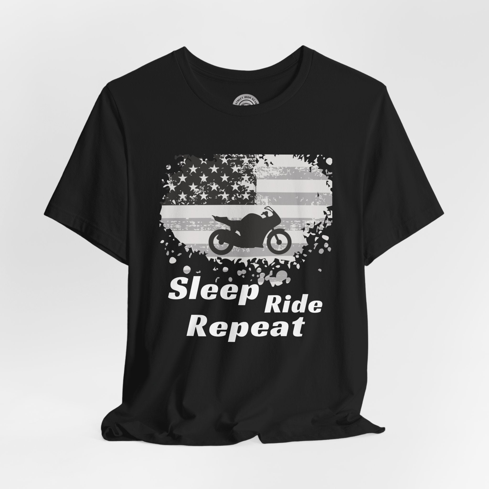 Elevate your biker style with our Sleep, Ride, Repeat T-shirt. Featuring a bold font and a weathered American flag backdrop with a sports bike silhouette, this men's Motorcycle T-shirt is the ultimate 'ride or die' gift for the passionate rider in your life.