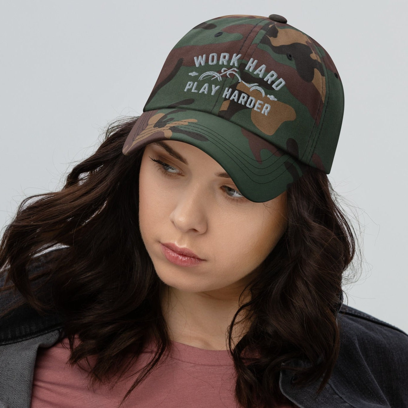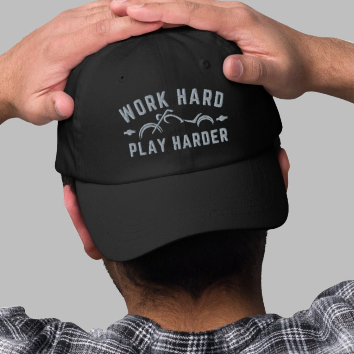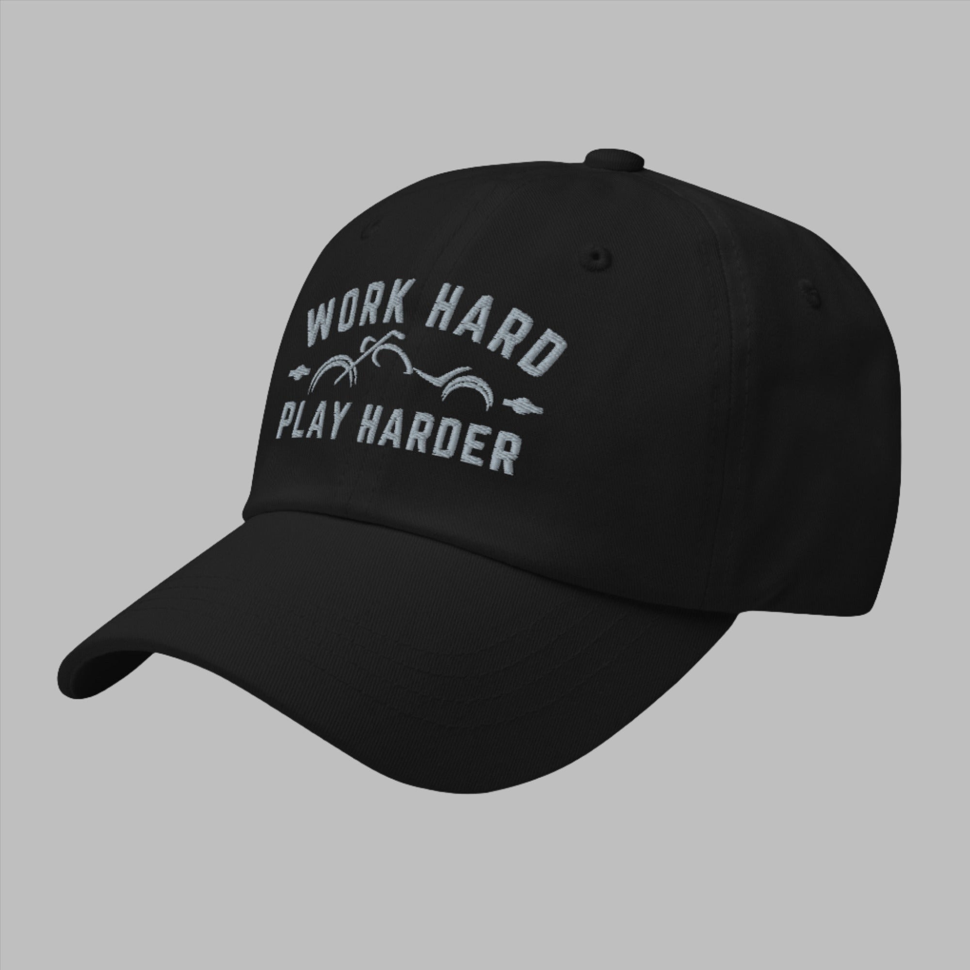 Elevate your casual style with our "Work Hard. Play Harder" embroidered Dad hat, featuring a sleek outline of a motorcycle. Perfect for motorcycle enthusiasts and adventure seekers, this hat combines comfort and a bold statement. Ideal for outdoor adventures, weekend rides, or just everyday wear, it’s a must-have accessory that captures the spirit of work-life balance.