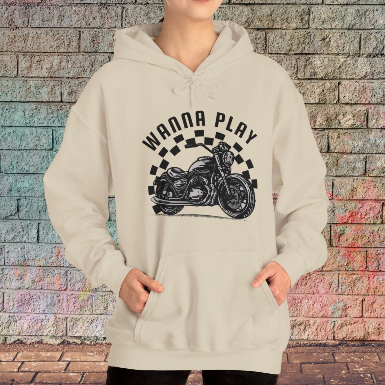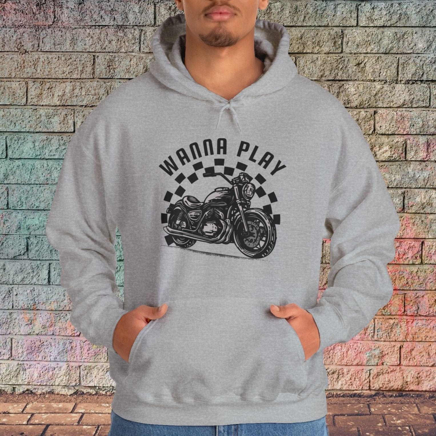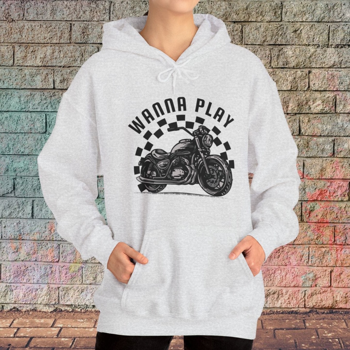 Rev up your style with our "Wanna Play" Motorcycle Culture Hooded Sweatshirt, featuring a bold design of a motorcycle encircled by a checkered flag ring. Perfect for bikers and motorcycle enthusiasts, this shirt blends a classic racing vibe with modern flair, making it a must-have for any rider's wardrobe. Crafted from premium cotton, it ensures comfort and durability for all your adventures on and off the road.