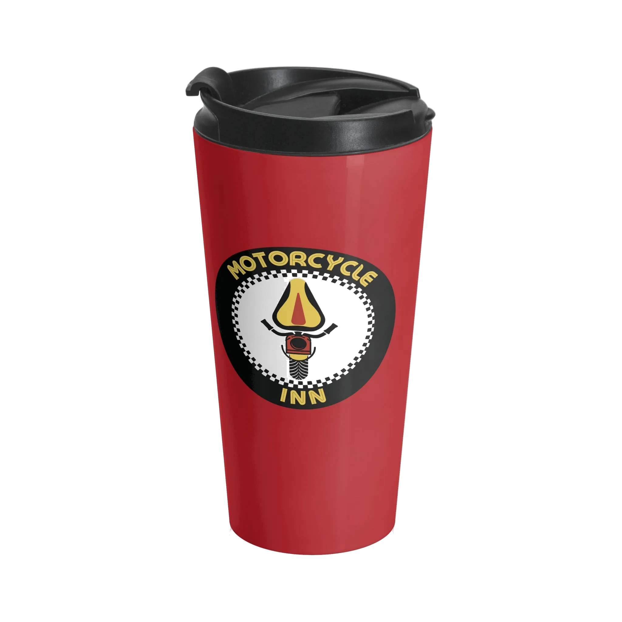 Keep your coffee hot and your drinks cold on the road with this durable Motorcycle Inn insulated travel mug! This high-quality, 15 oz. tumbler is a perfect piece of motorcycle memorabilia for every rider. Featuring the official Motorcycle Inn logo on one side, the mug also displays the humorous and welcoming tagline: "A motel so cool, even your motorbike will want to stay longer" on the reverse. Adding a unique touch to this biker gift, the base of the tumbler is encircled by a cool graphic of motorcycle tire tracks. This sturdy travel mug is essential biker gear for long road trips and everyday commutes, making it an ideal choice for any motorcycle enthusiast or traveler looking for functional motorcycle accessories.