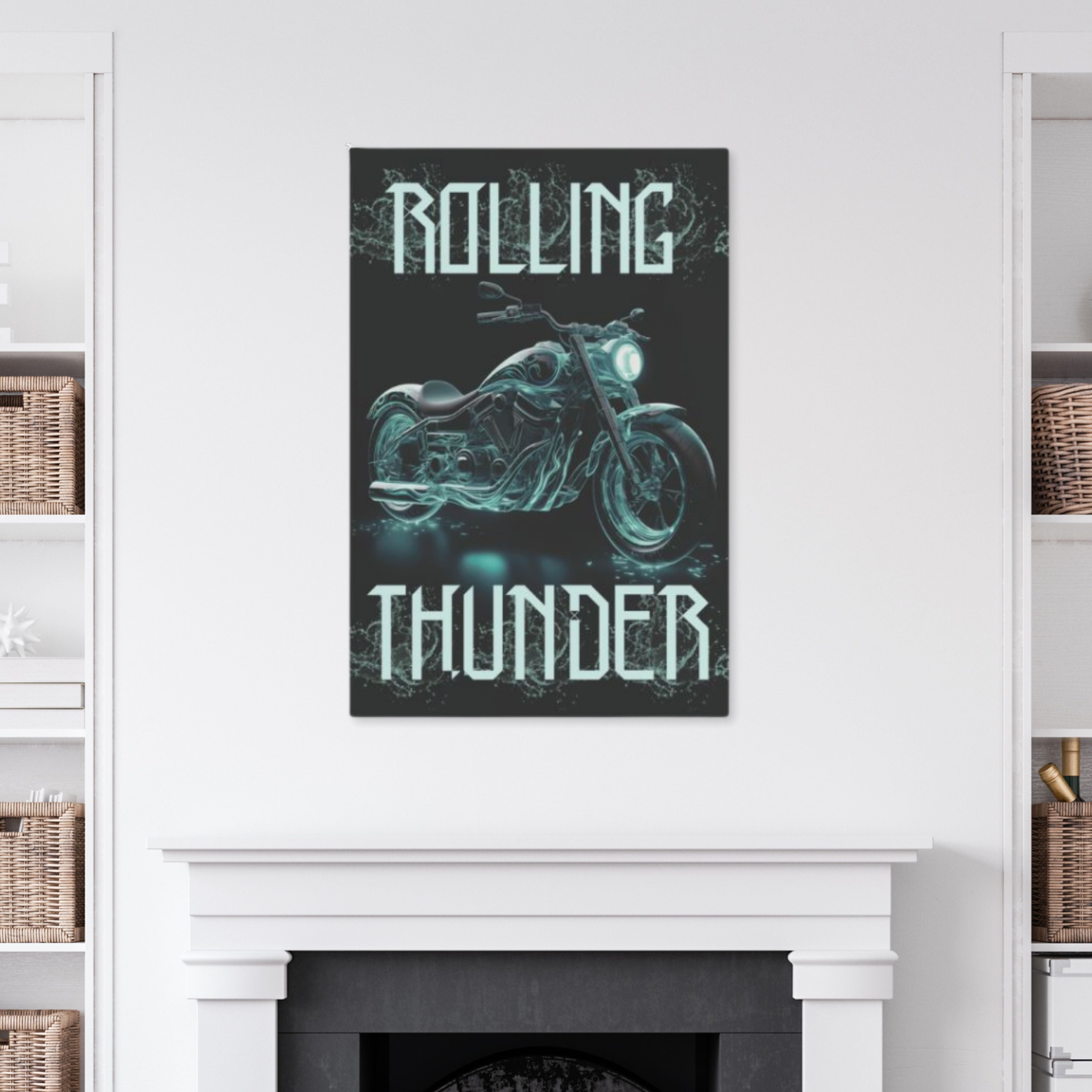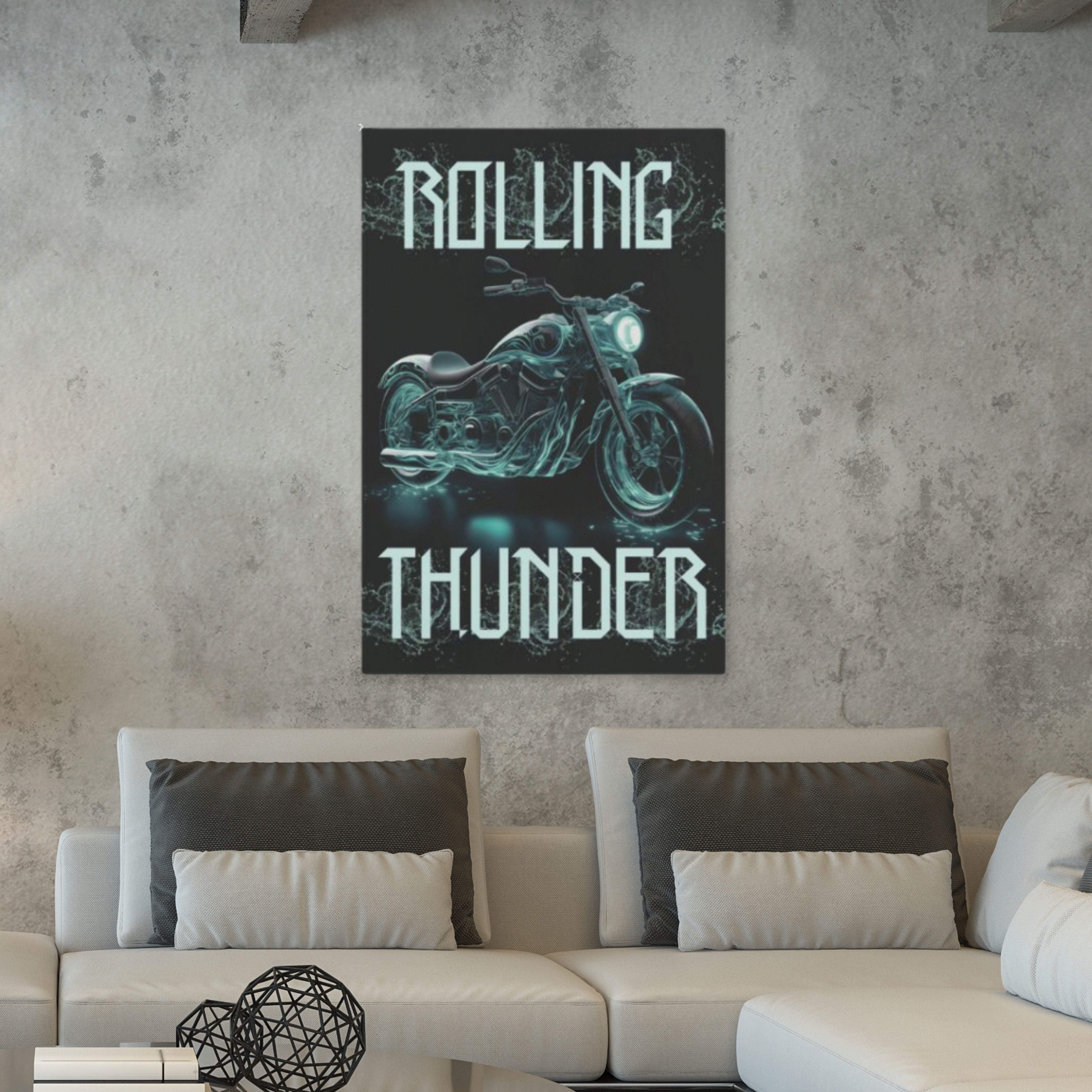 Rev up your decor with this striking metal poster sign, perfect for motorcycle enthusiasts. It features a vibrant neon cruiser against a sleek black backdrop, emblazoned with the bold phrase 'Rolling Thunder', making it an ideal statement piece for any biker's space.