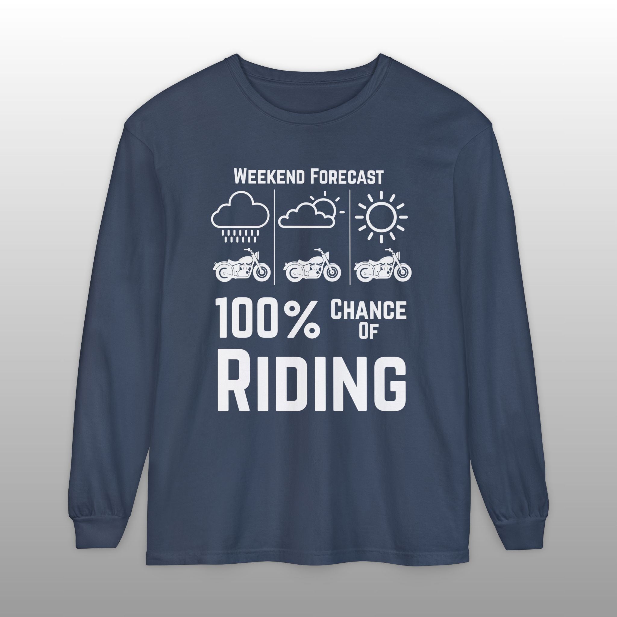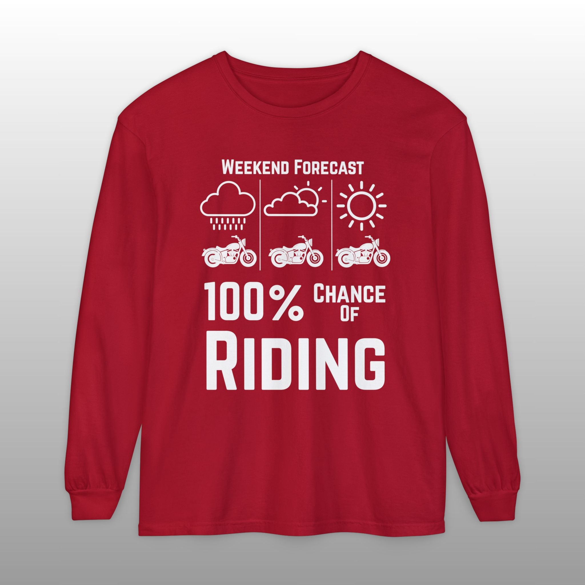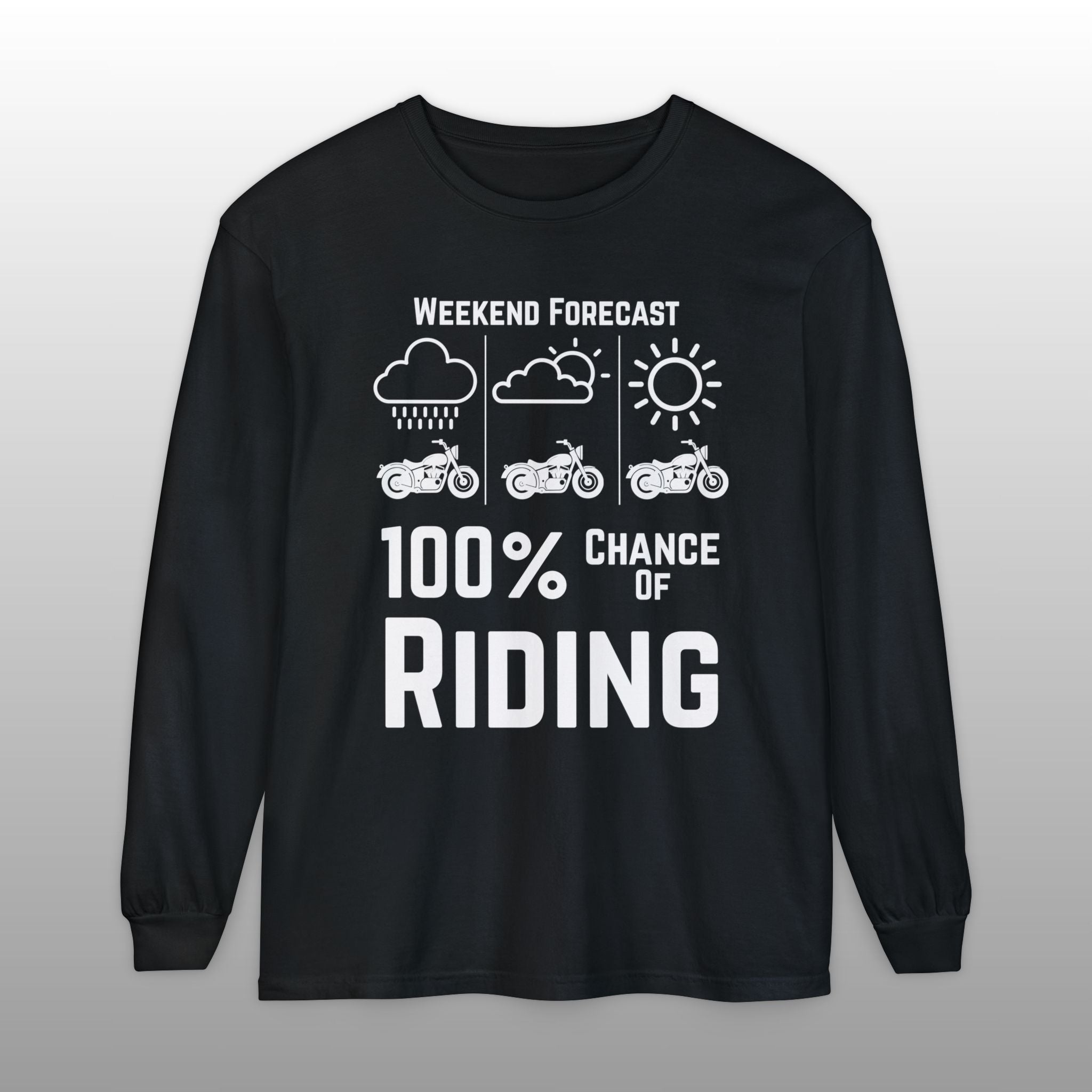 For every rider whose mind is always on the open road, our motorcycle long sleeve tee is the perfect fit. This comfortable shirt features a clever and humorous graphic that speaks directly to the motorcycle enthusiast's heart. The design presents a witty take on a weather report, with a bold silhouette of a bike and the clear message: "Weekend Forecast: 100% Chance of Riding." This graphic is a lighthearted way to show your dedication to the road, no matter the conditions. Made from a soft, high-quality fabric, this biker long sleeve shirt is great for layering on cooler days or wearing as a comfortable casual top. It makes a perfect motorcycle gift and is a must-have for any rider who lives for the weekend ride.