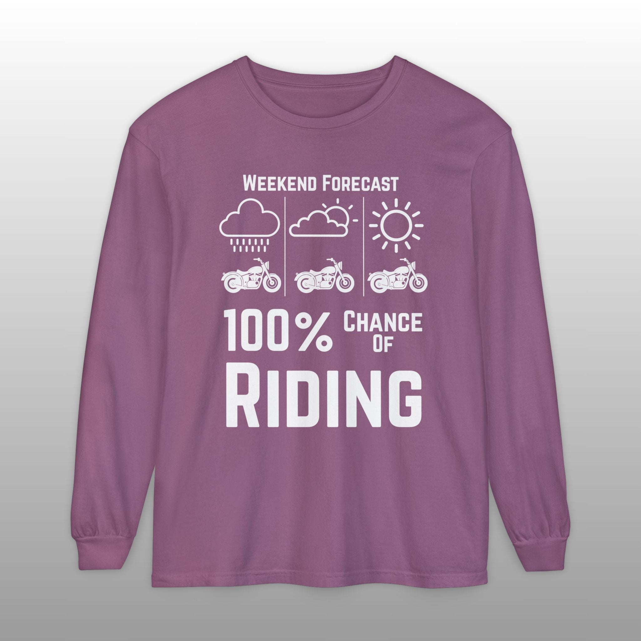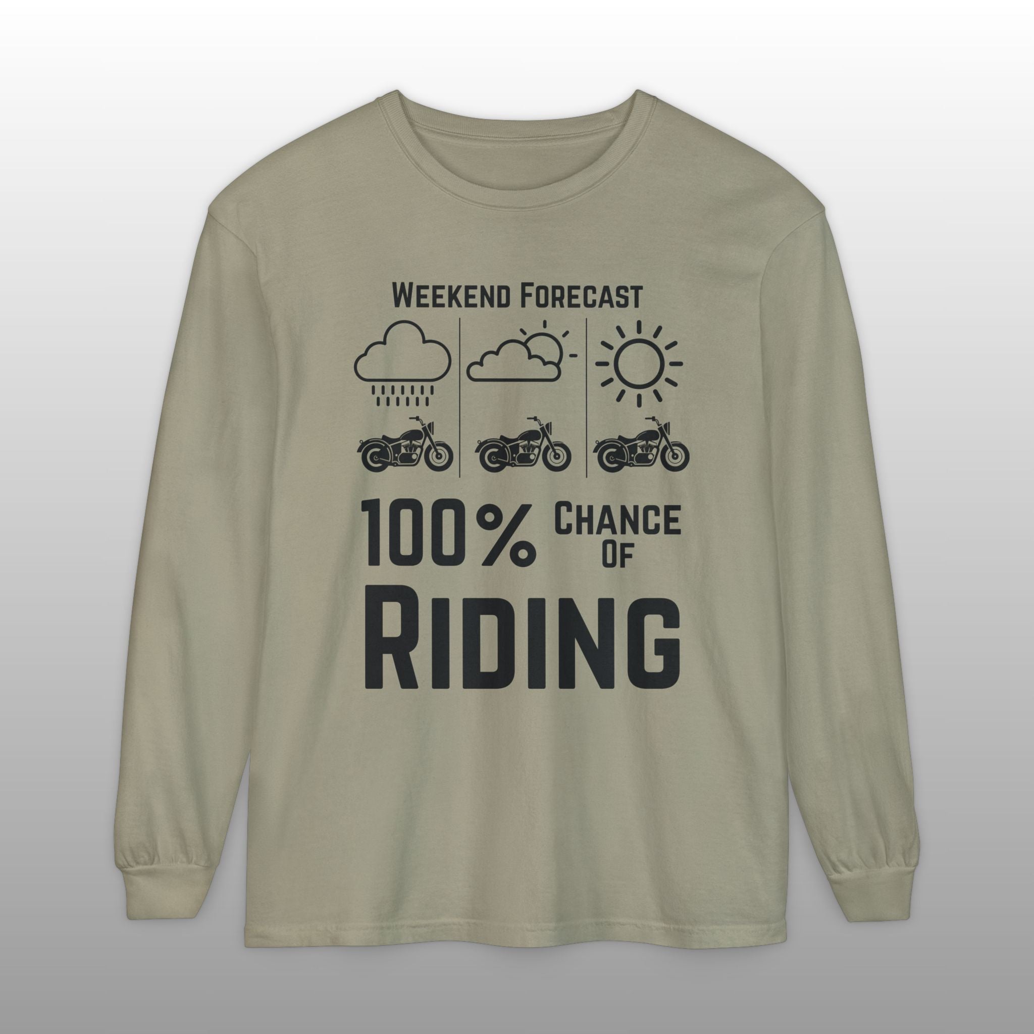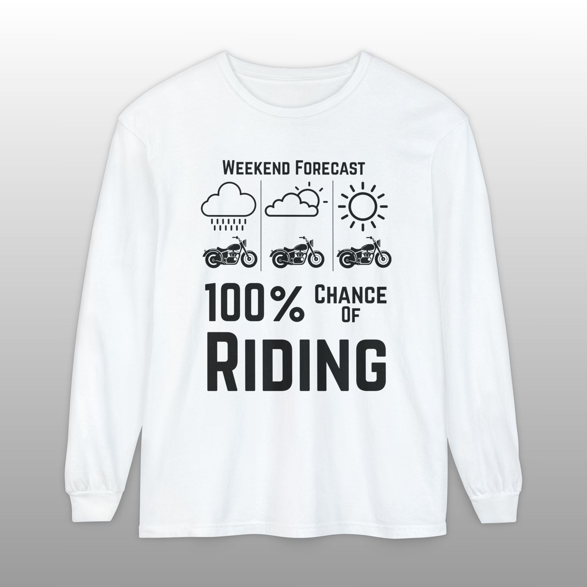 For every rider whose mind is always on the open road, our motorcycle long sleeve tee is the perfect fit. This comfortable shirt features a clever and humorous graphic that speaks directly to the motorcycle enthusiast's heart. The design presents a witty take on a weather report, with a bold silhouette of a bike and the clear message: "Weekend Forecast: 100% Chance of Riding." This graphic is a lighthearted way to show your dedication to the road, no matter the conditions. Made from a soft, high-quality fabric, this biker long sleeve shirt is great for layering on cooler days or wearing as a comfortable casual top. It makes a perfect motorcycle gift and is a must-have for any rider who lives for the weekend ride.