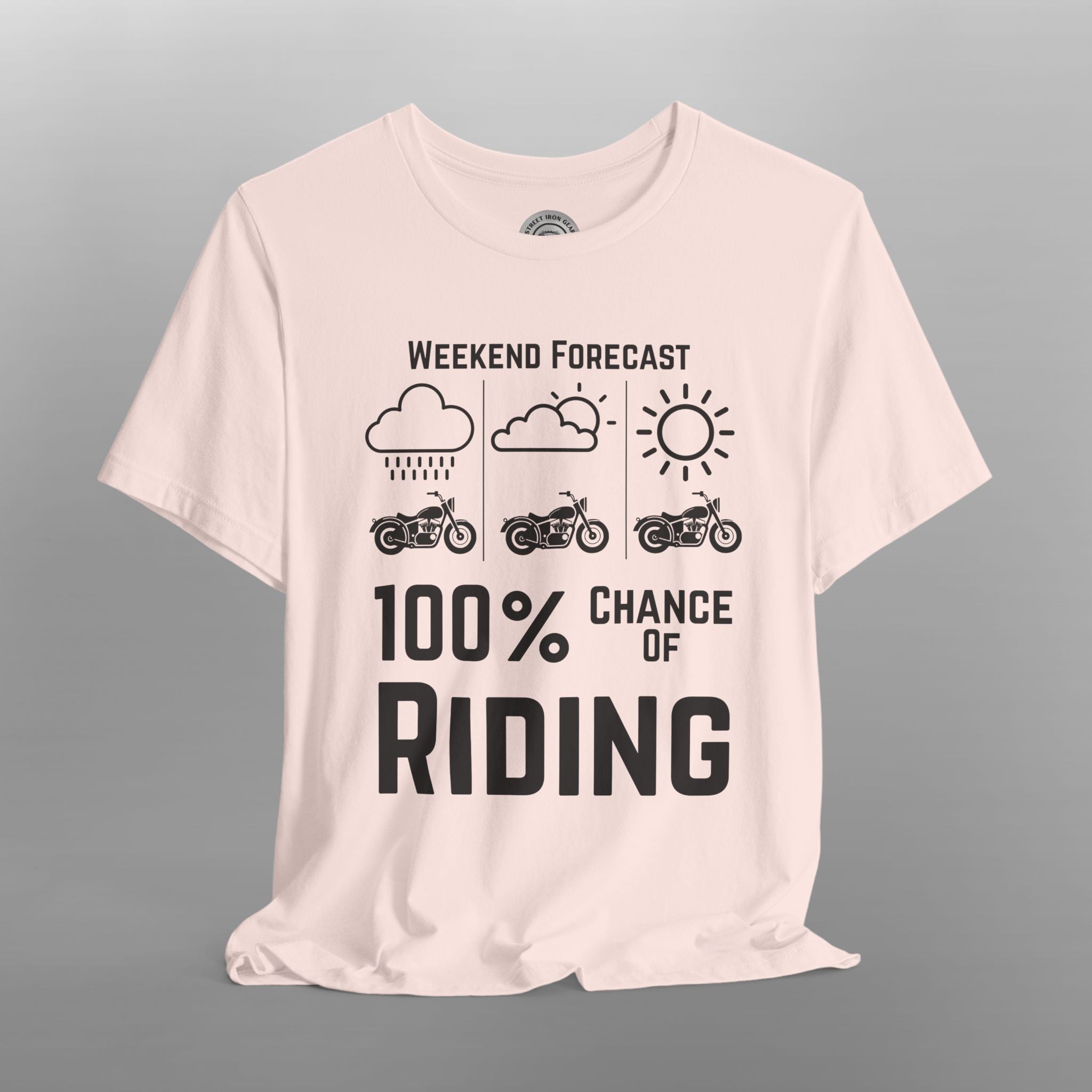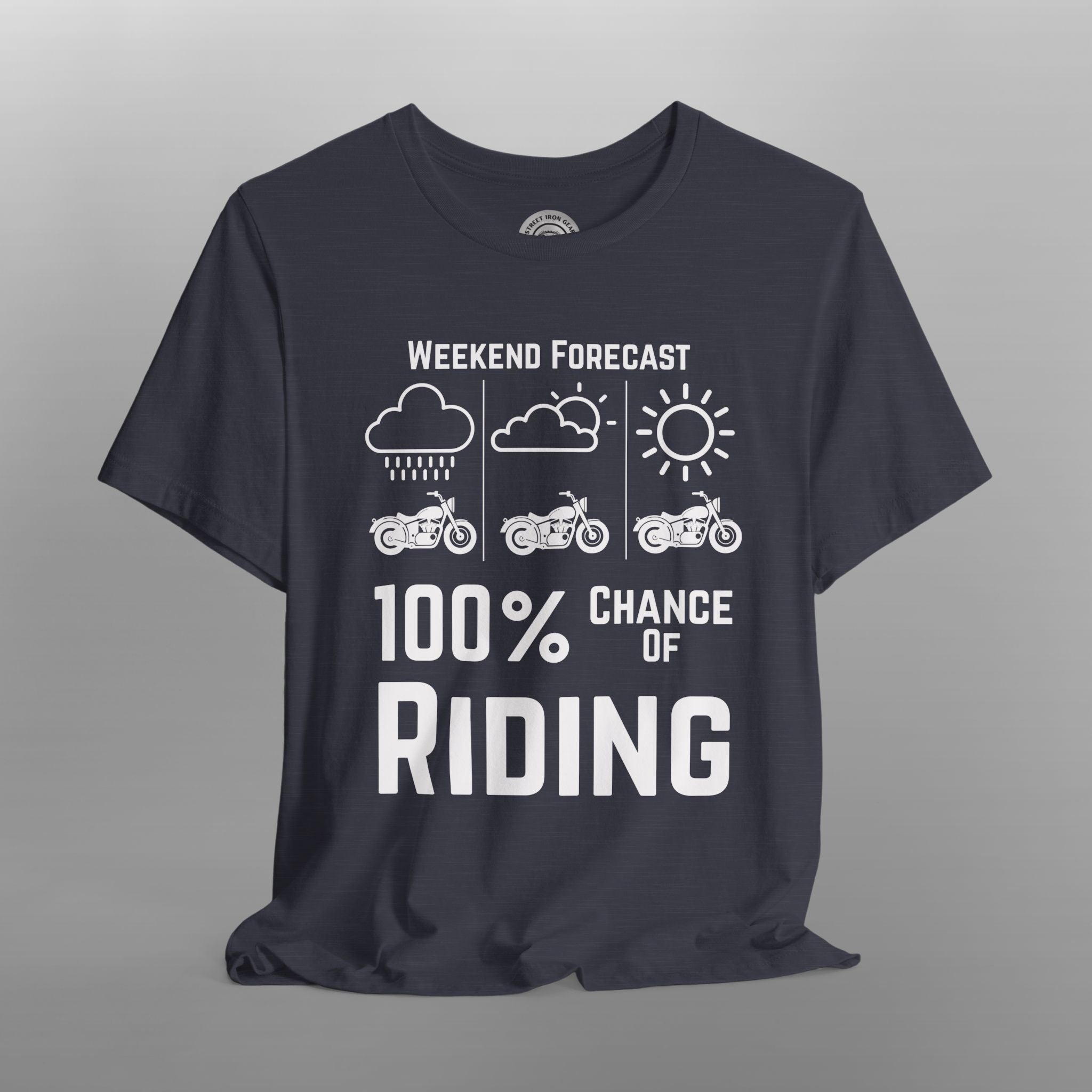 For every rider whose mind is always on the open road, our motorcycle crew neck tee is the perfect fit. This comfortable shirt features a clever and humorous graphic that speaks directly to the motorcycle enthusiast's heart. The design presents a witty take on a weather report, with a bold silhouette of a bike and the clear message: "Weekend Forecast: 100% Chance of Riding." This graphic is a lighthearted way to show your dedication to the road, no matter the conditions. Made from a soft, high-quality fabric, this biker shirt is great for layering on cooler days or wearing as a comfortable casual summer top. It makes a perfect motorcycle gift and is a must-have for any rider who lives for the weekend ride.