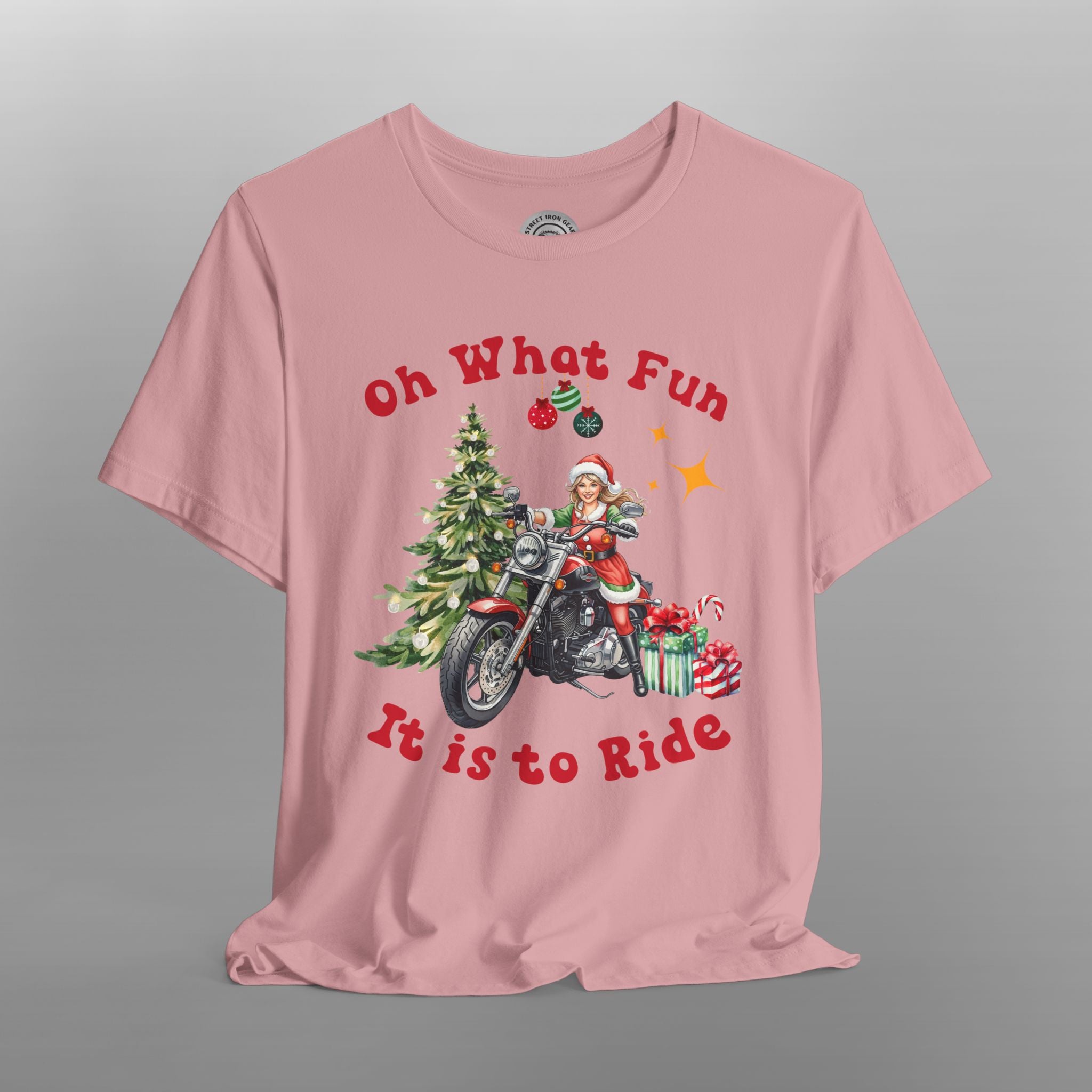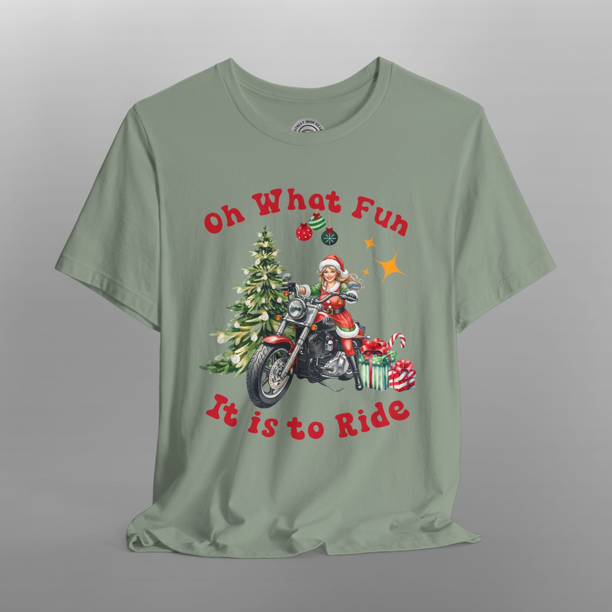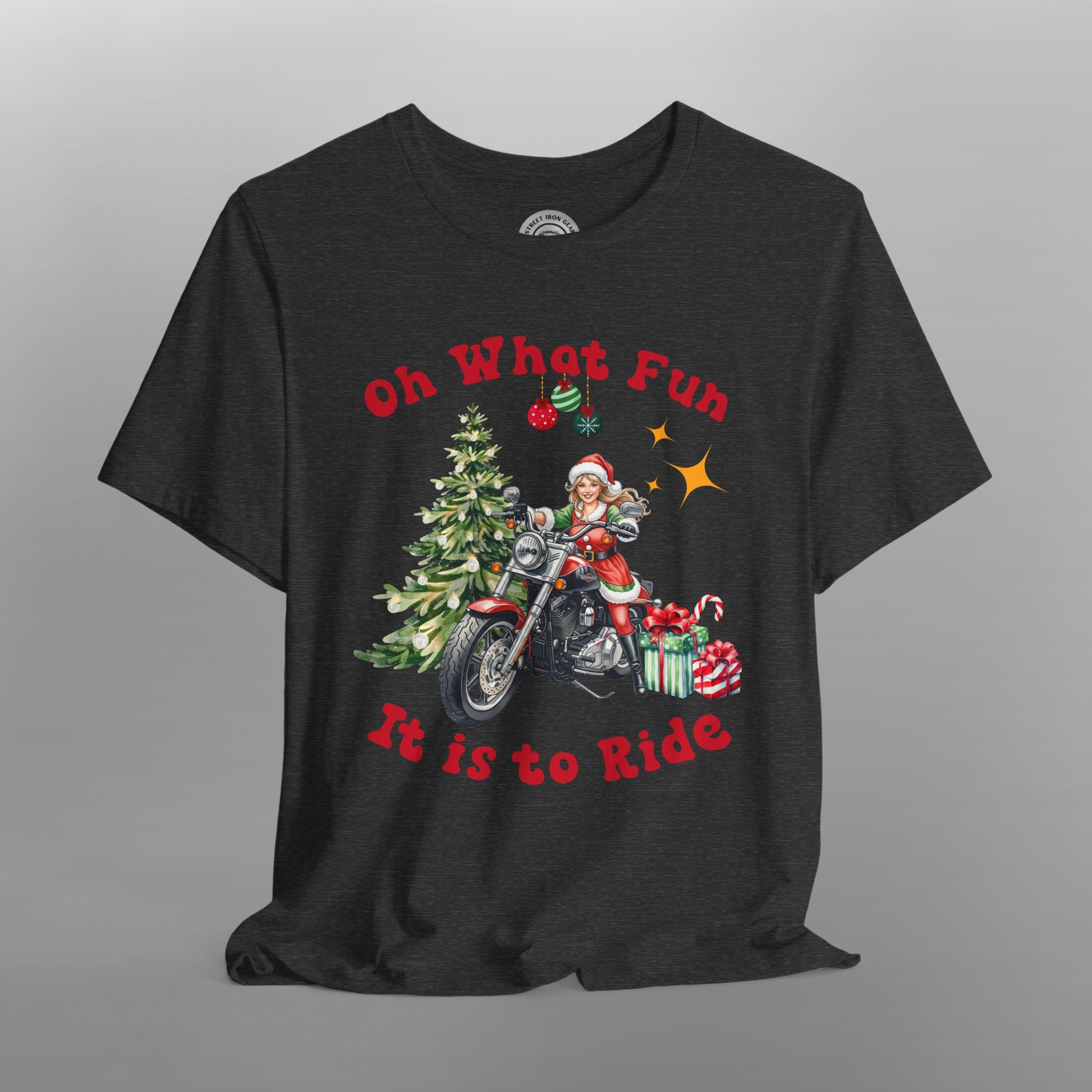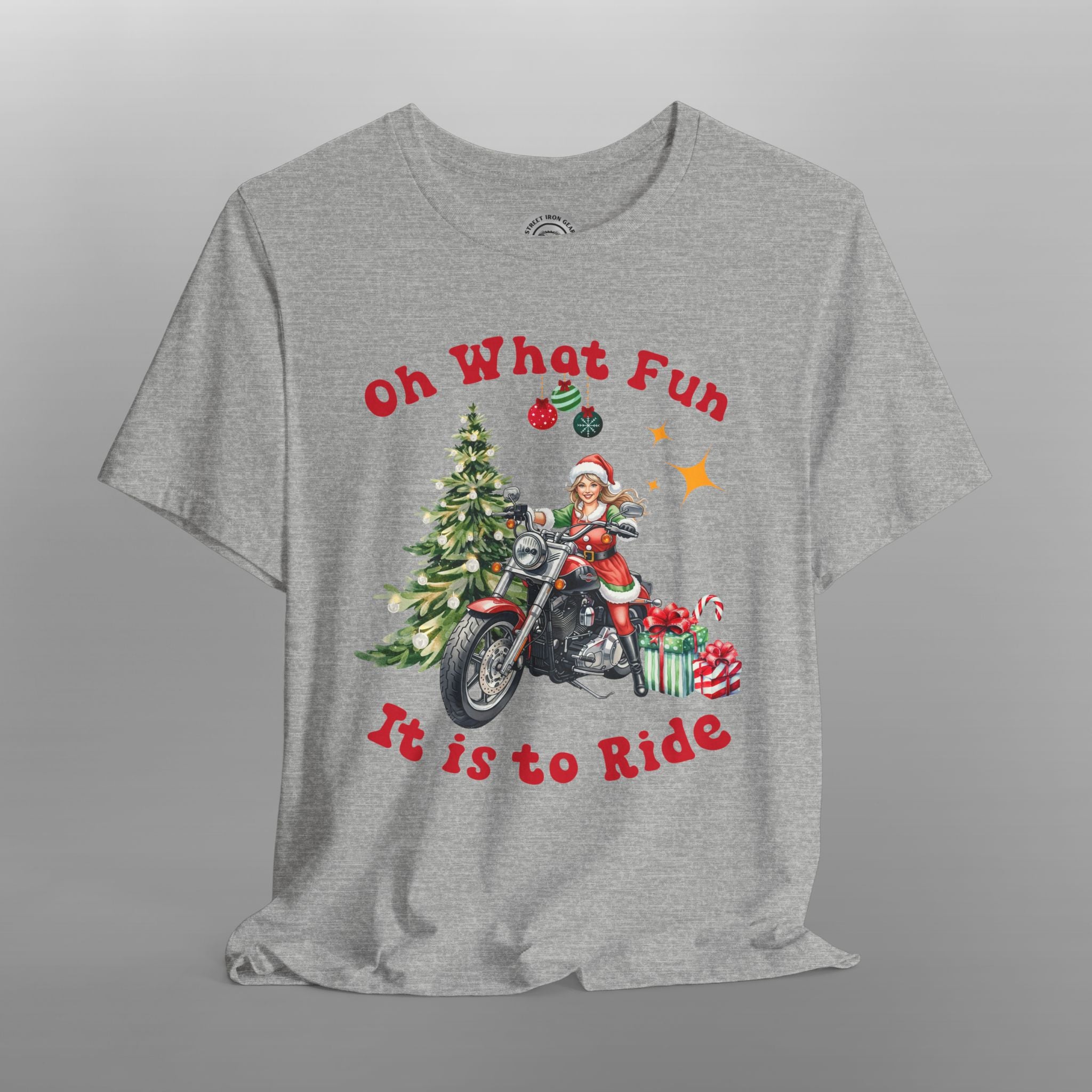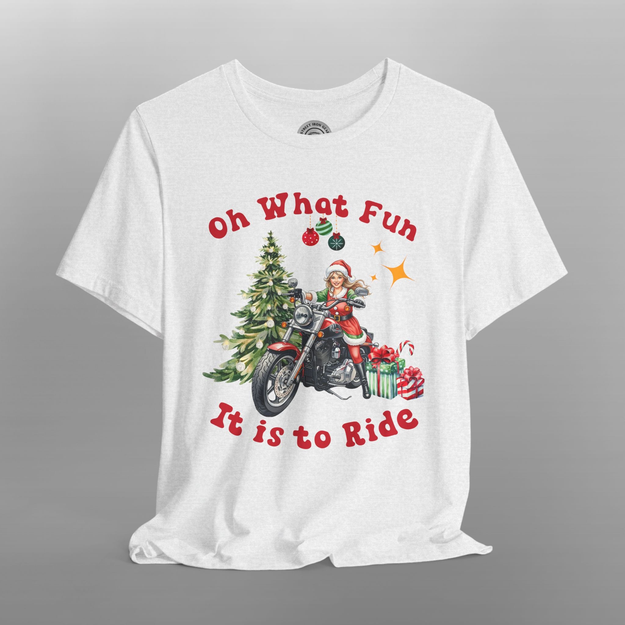 Hit the road and spread some holiday cheer with this exclusive Christmas t-shirt for lady bikers! This cute tee is the perfect way to show off your love for riding and celebrate the season in style. The unique design features a festive female rider on her motorcycle, with a spirited holiday scene in the background. With the playful slogan, "Oh What Fun It is to Ride," this graphic captures the joy of the open road and the magic of Christmas. Made from a soft, comfortable fabric, this motorcycle holiday shirt is ideal for cool-weather rides, biker gatherings, or any Christmas party. It’s a fantastic motorcycle Christmas gift for any woman who loves to ride.