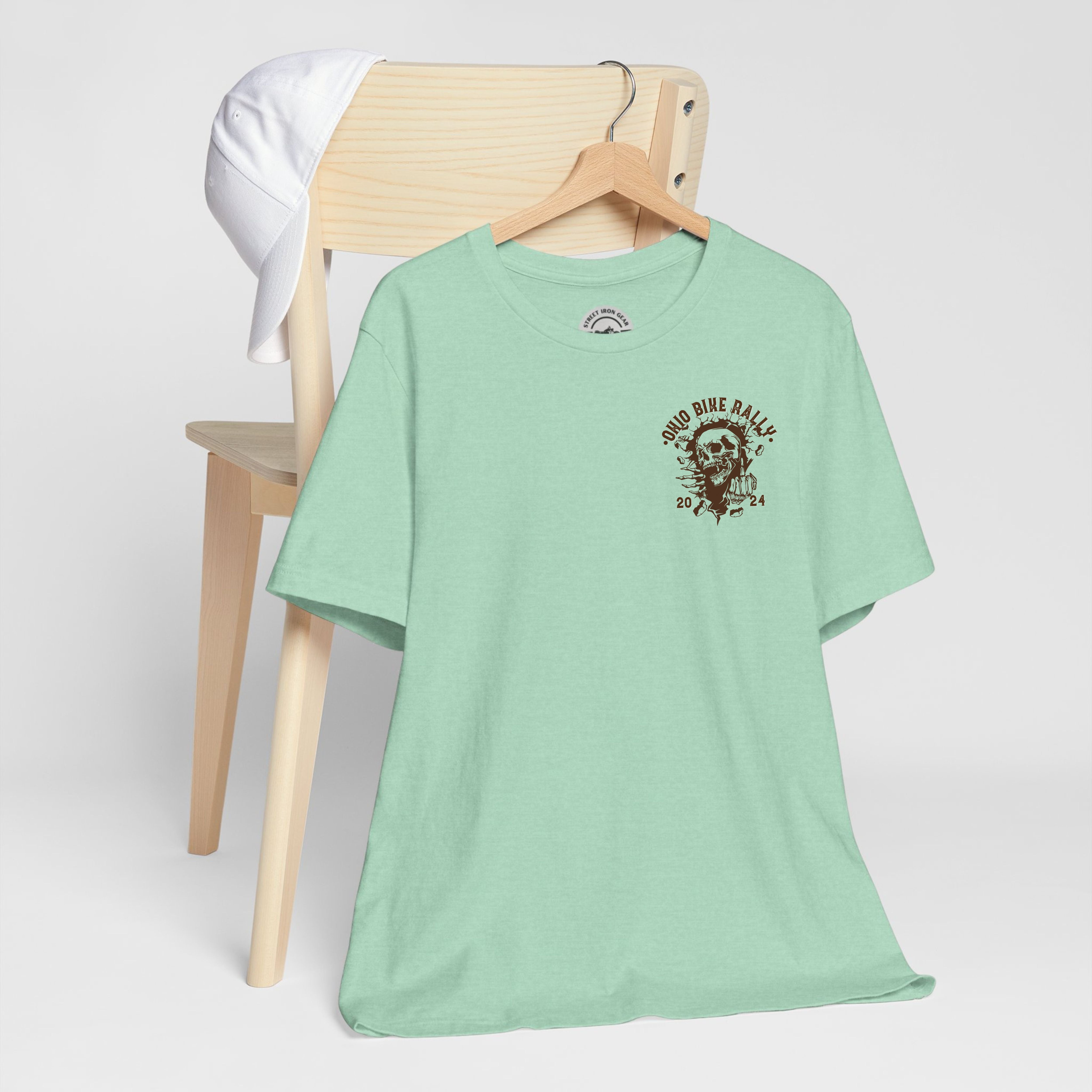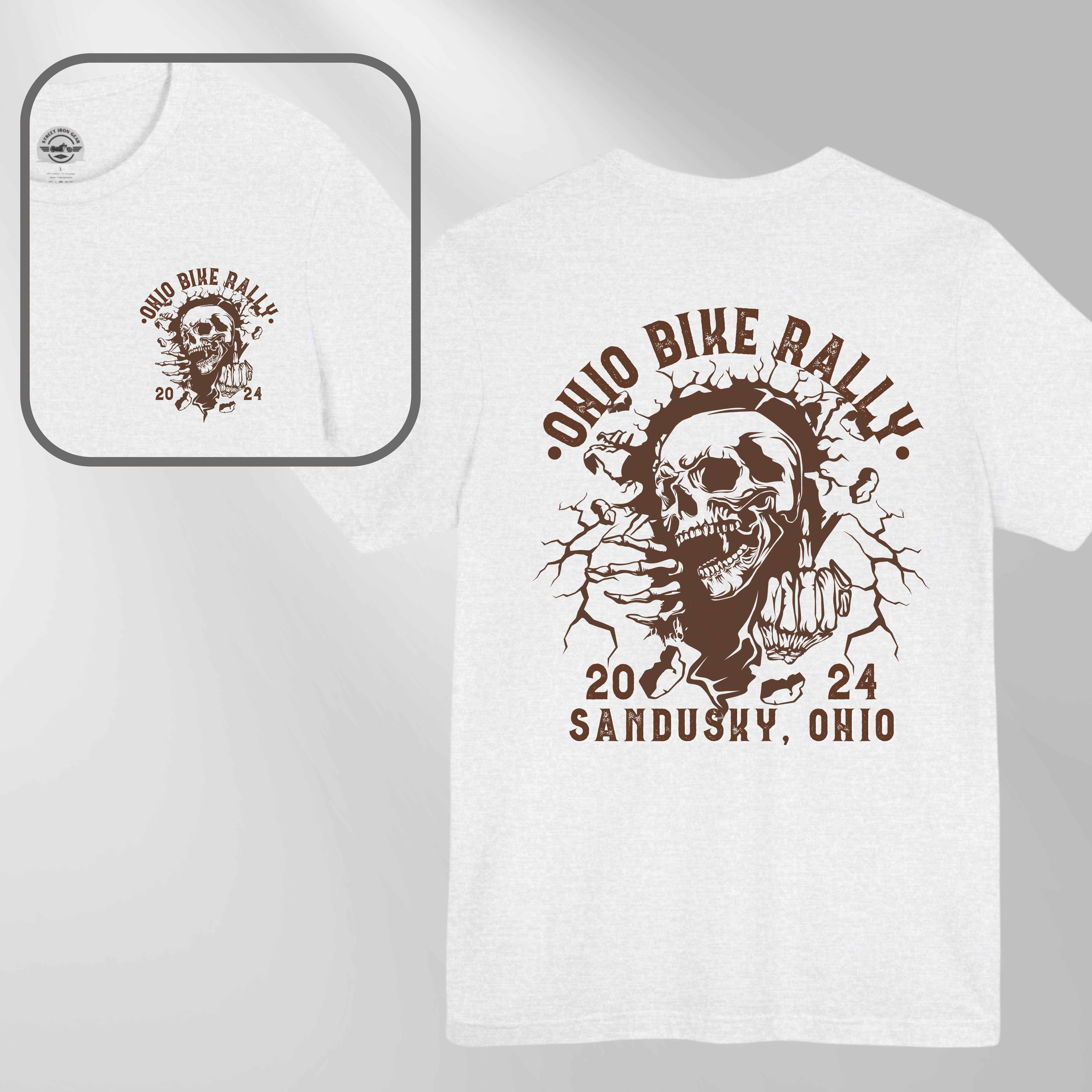 Step into the wild heart of biking culture with Street Iron Gear's Ohio Bike Rally 2024 T-Shirt, where a monochrome skull tears through the fabric amidst a backdrop of dynamic cracks, boldly declaring the Ohio Bike Rally in Sandusky, Ohio. This arresting two-sided print design captures the essence of thrill and freedom, featuring a streamlined version on the front pocket for a touch of subtlety. Perfect for those who live for the roar of engines and the call of the open road, this tee is your ticket to standing out at Ohio's premier motorcycle event.