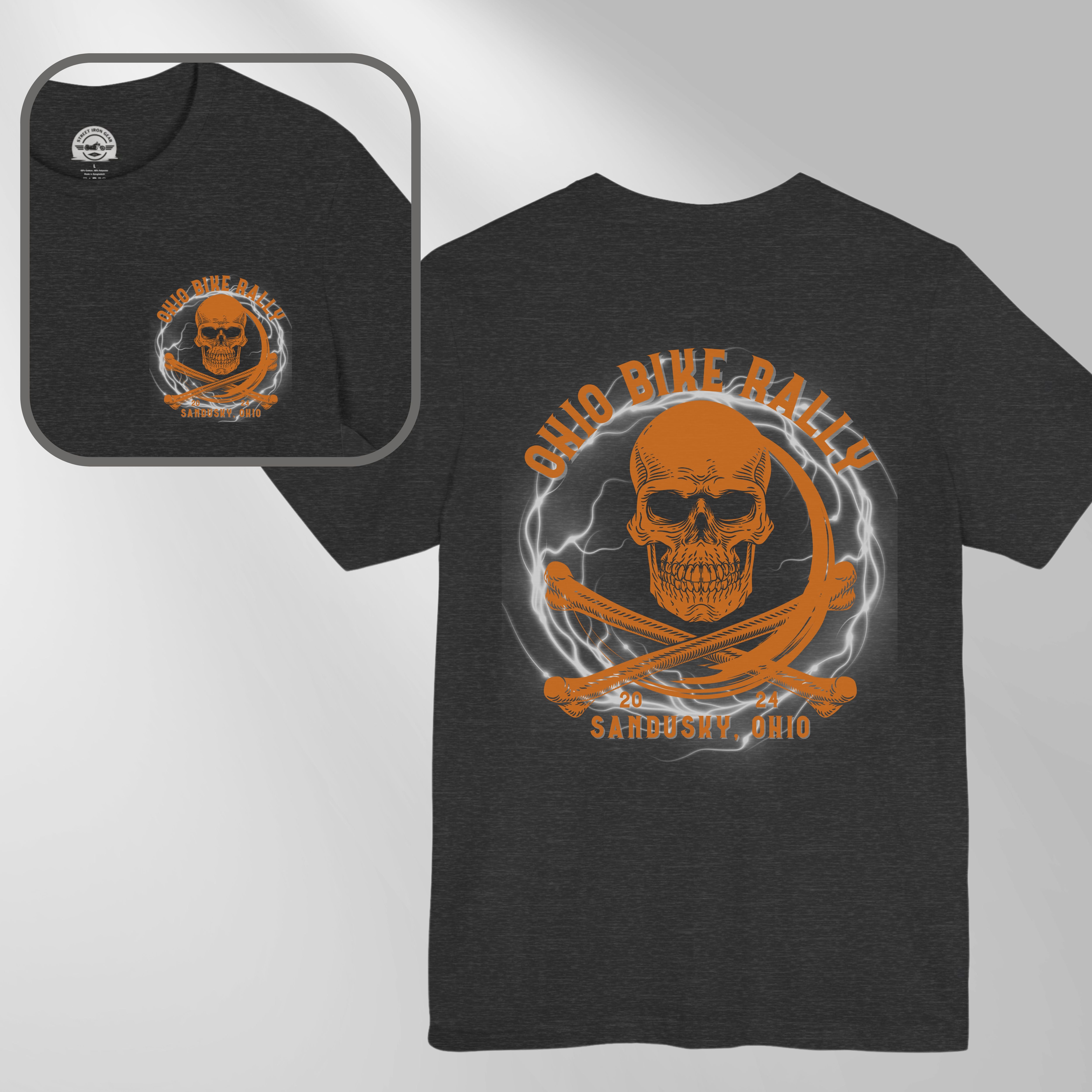 Elevate your ride with Street Iron Gear's Ohio Bike Rally 2024 T-Shirt, featuring a captivating organ skull and crossbones design encircled by a dynamic lightning motif, symbolizing the electrifying energy of Sandusky, Ohio's premier motorcycle event. With "Ohio Bike Week Sandusky, Ohio" emblazoned on the back, this two-sided print masterpiece captures the essence of motorcycle culture and camaraderie. The front pocket sports a streamlined version of the design, making it an ideal pick for bikers seeking to showcase their passion and spirit for adventure. This T-shirt is a must-have for attendees and enthusiasts looking to make a statement at Ohio Bike Week and beyond, blending style with the thrill of the open road.