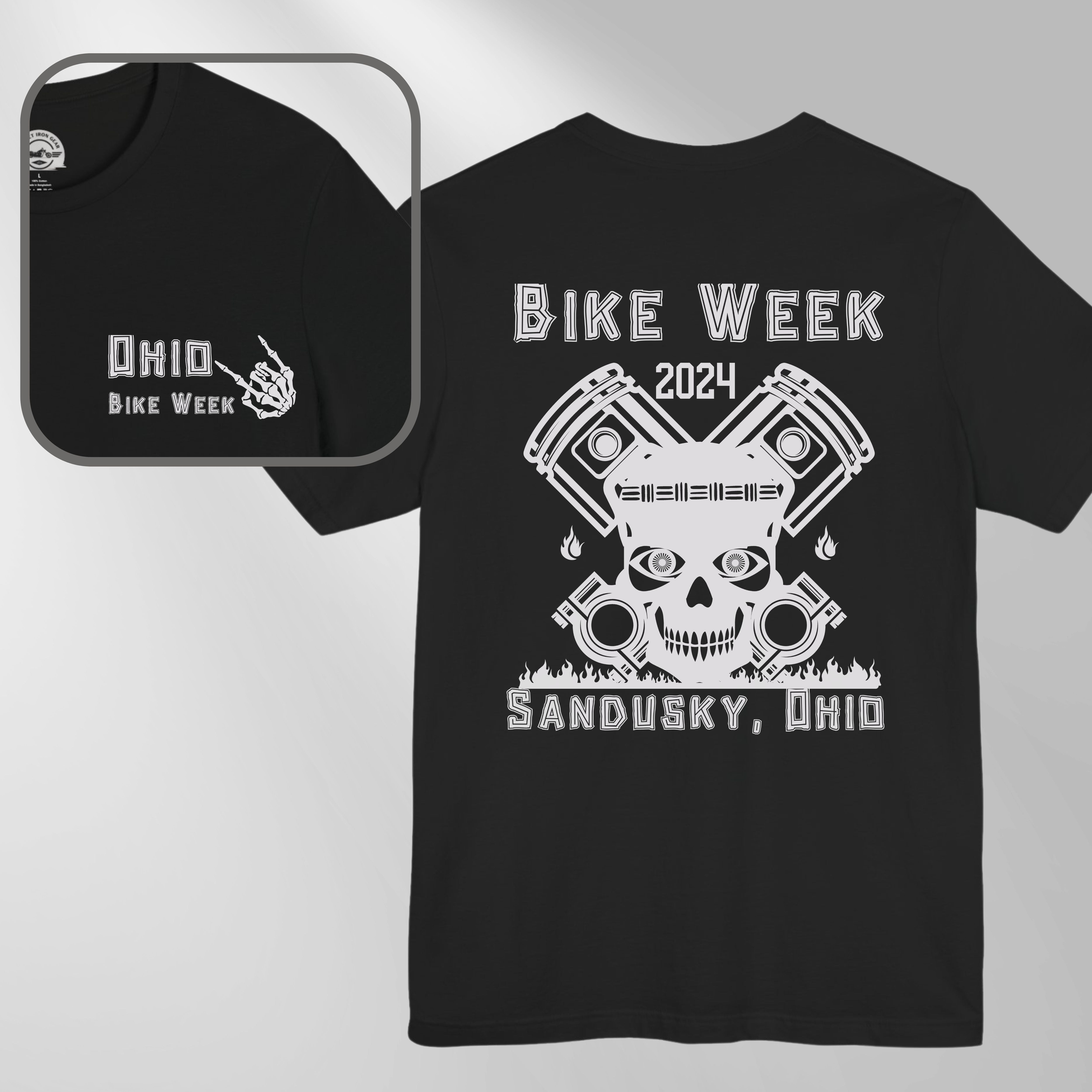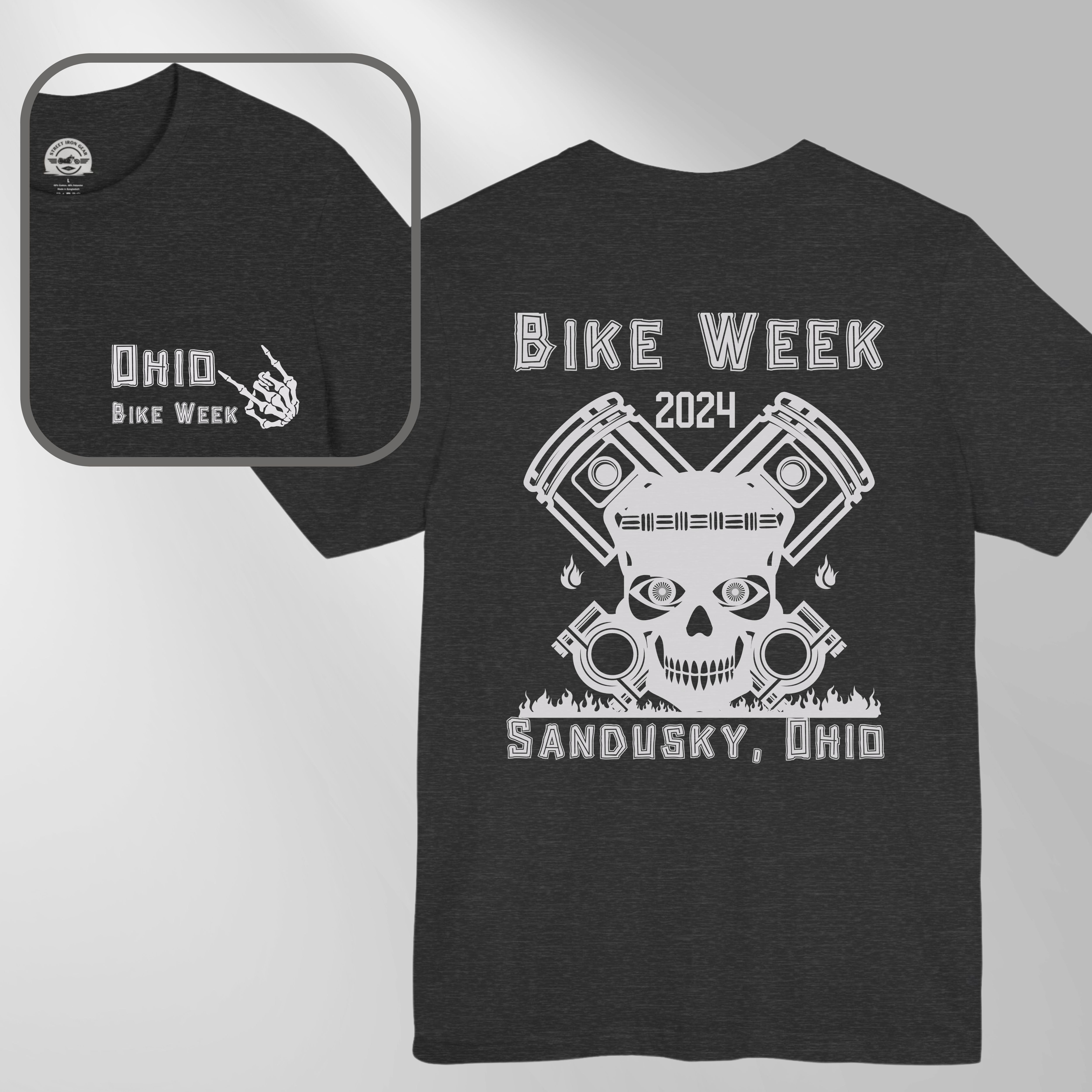 Embrace the spirit of the open road with Street Iron Gear's Ohio Bike Rally 2024 T-Shirt, crafted for motorcycle enthusiasts and adventure seekers alike. This exclusive design showcases a bold Tiki Skull over crossed pistons with flames on the back, paired with a refined version on the front pocket, making it a standout addition to any biker's wardrobe. Ideal for Ohio Bike Week attendees or anyone who celebrates the biker lifestyle, this dual-sided print tee combines comfort with the rebellion and adventure of motorcycle culture. Secure yours today and make a statement at Ohio's premier motorcycle rally in unmatched style and comfort.