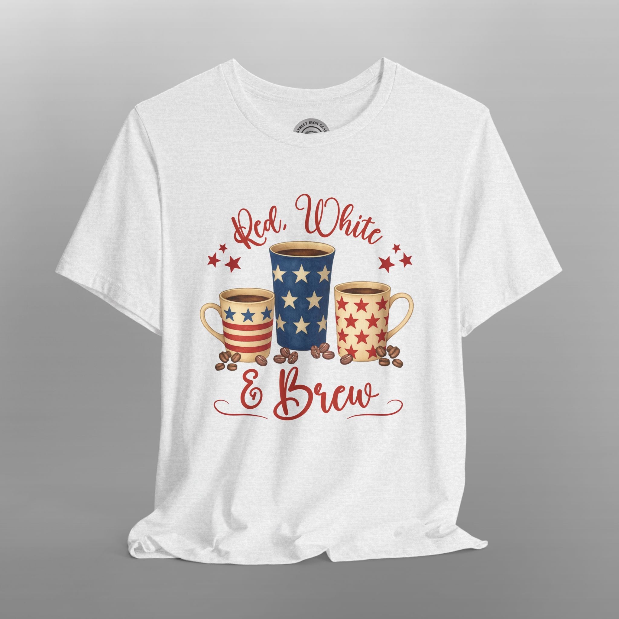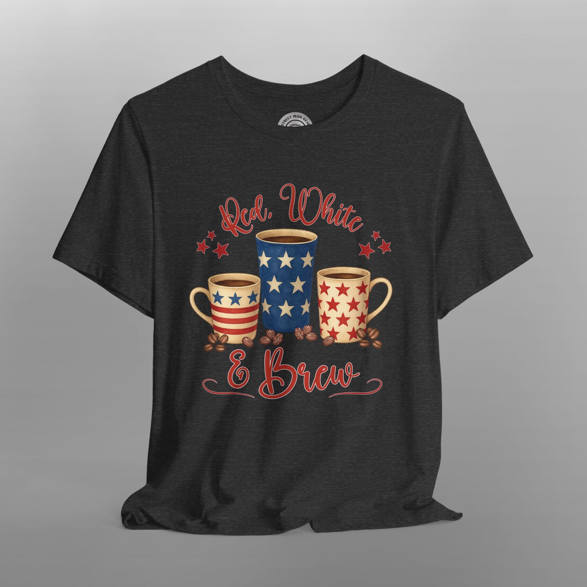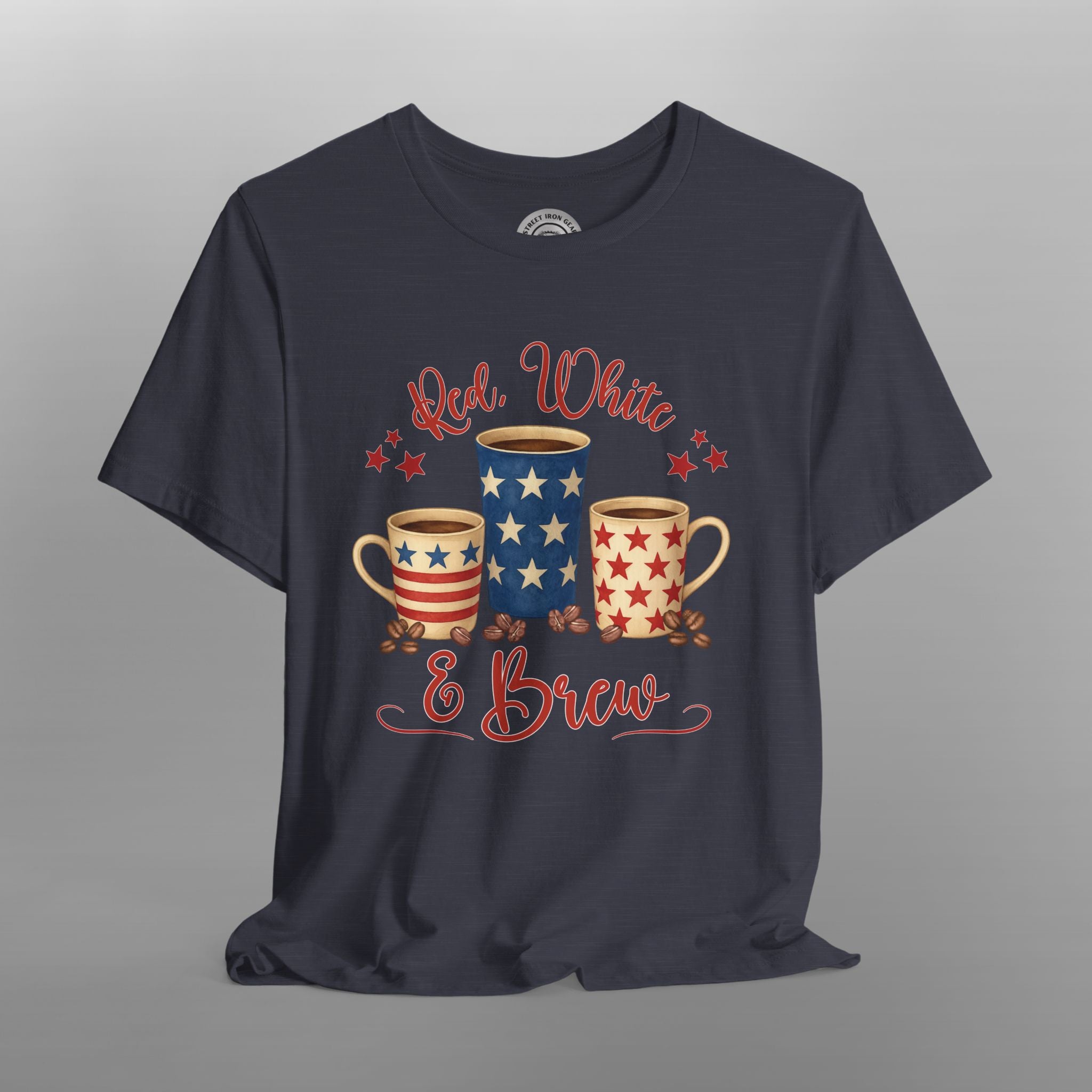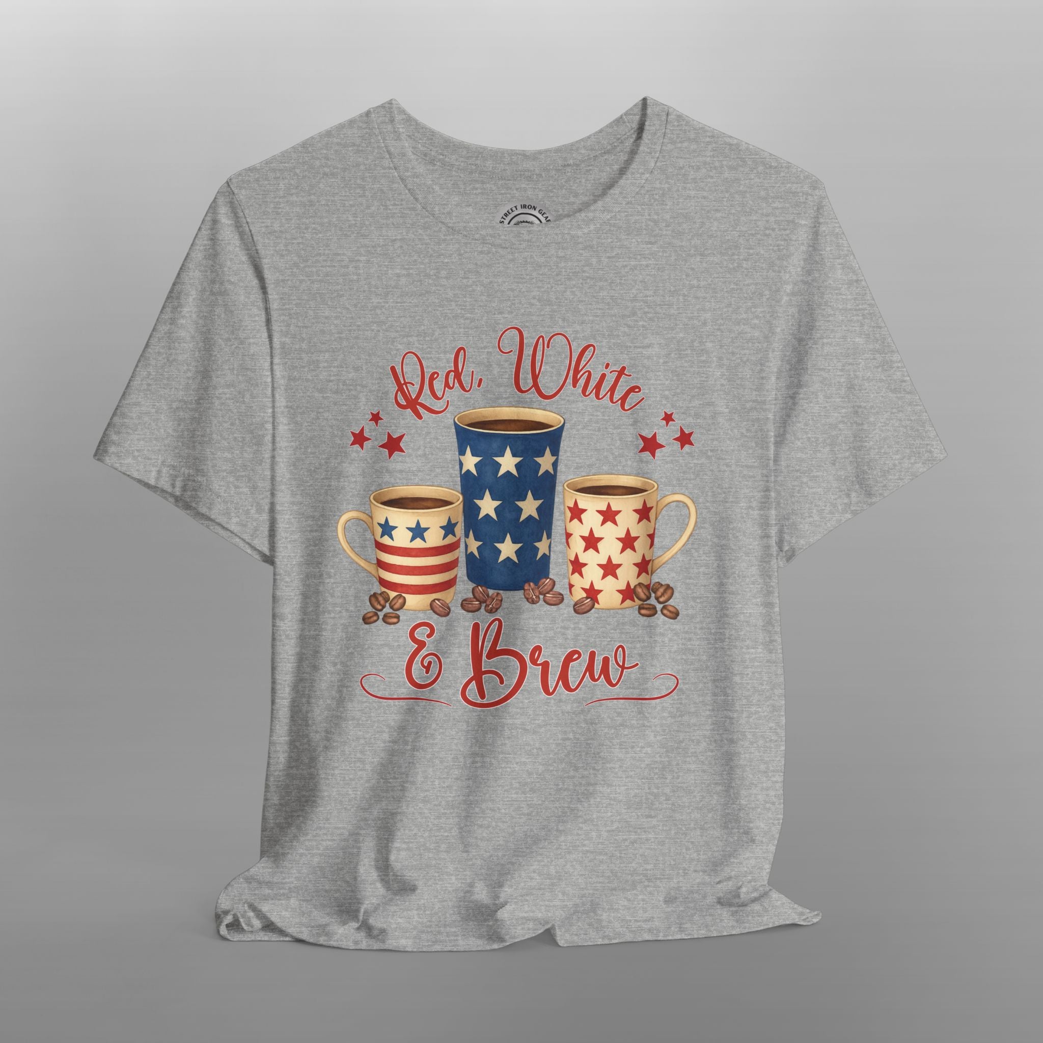 Start your day the American way with our "Red White and Brew" t-shirt! This unique and whimsical tee is the perfect way for any patriot and coffee lover to show their spirit. The design features a charming trio of coffee mugs, each decorated with a classic American pattern of stars and stripes, all centered around the clever pun "Red White and Brew." This fun graphic is a subtle yet powerful nod to your two great loves: freedom and caffeine. Made with a soft, comfortable fabric and a classic unisex fit, this patriotic t-shirt is ideal for celebrating the Fourth of July, a weekend barbecue, or simply enjoying your morning cup of joe. It's a great American flag shirt and makes a fantastic gift for men or women who are proud of the USA.