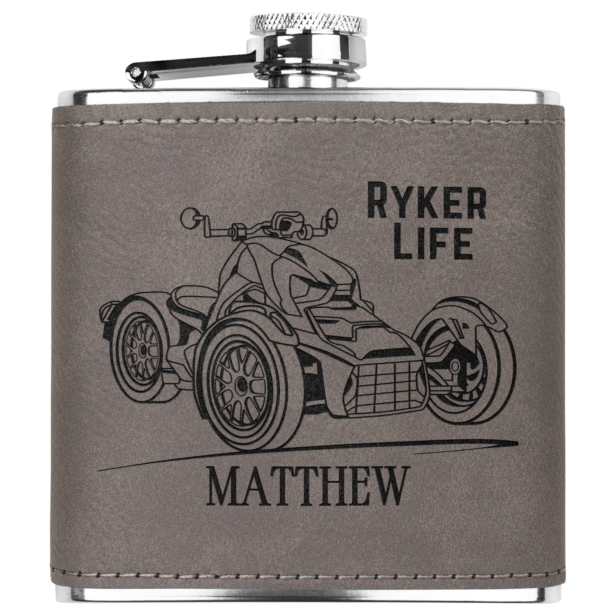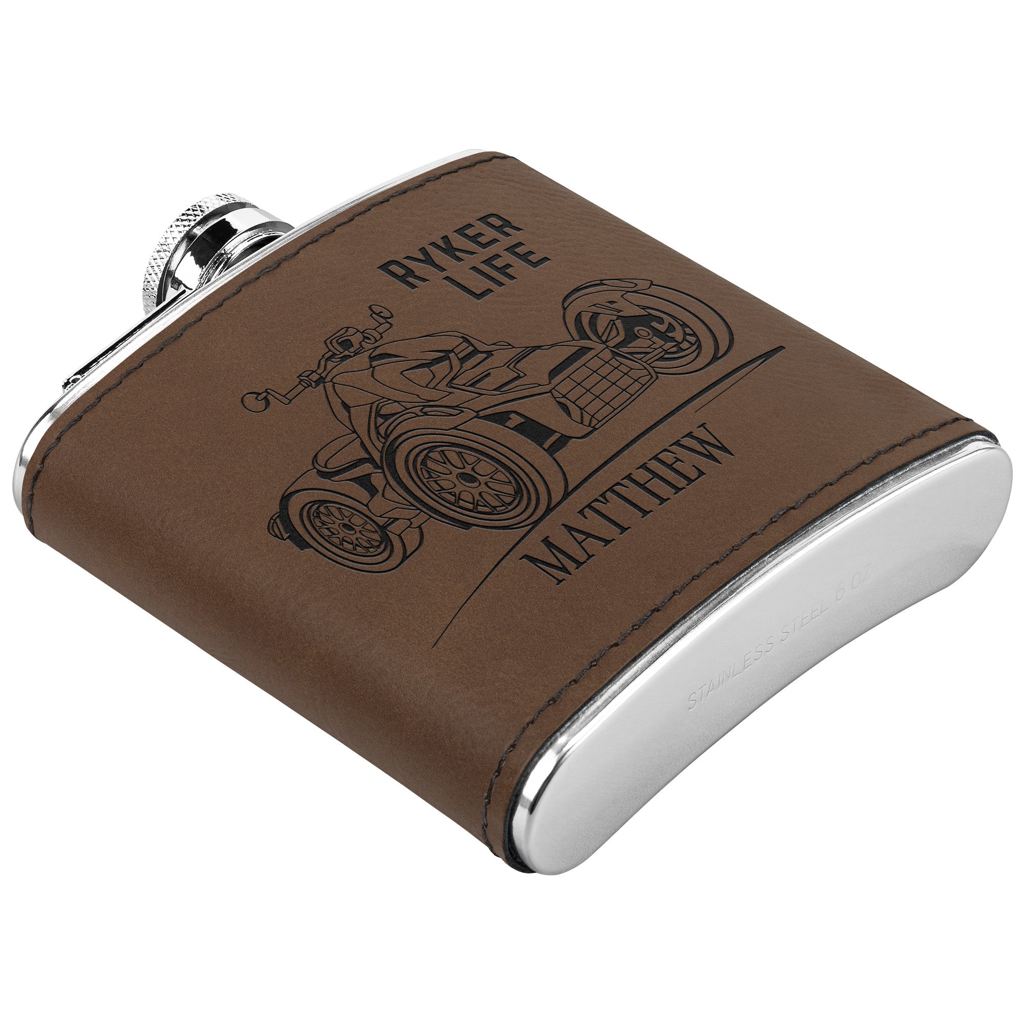 Elevate your riding experience with our personalized Can-Am Spyder themed laser engraved leather covered flask. Perfect for Ryker motorcycle enthusiasts, this stylish and durable flask makes an ideal gift, combining rugged charm with practical functionality for your adventures on the open road.