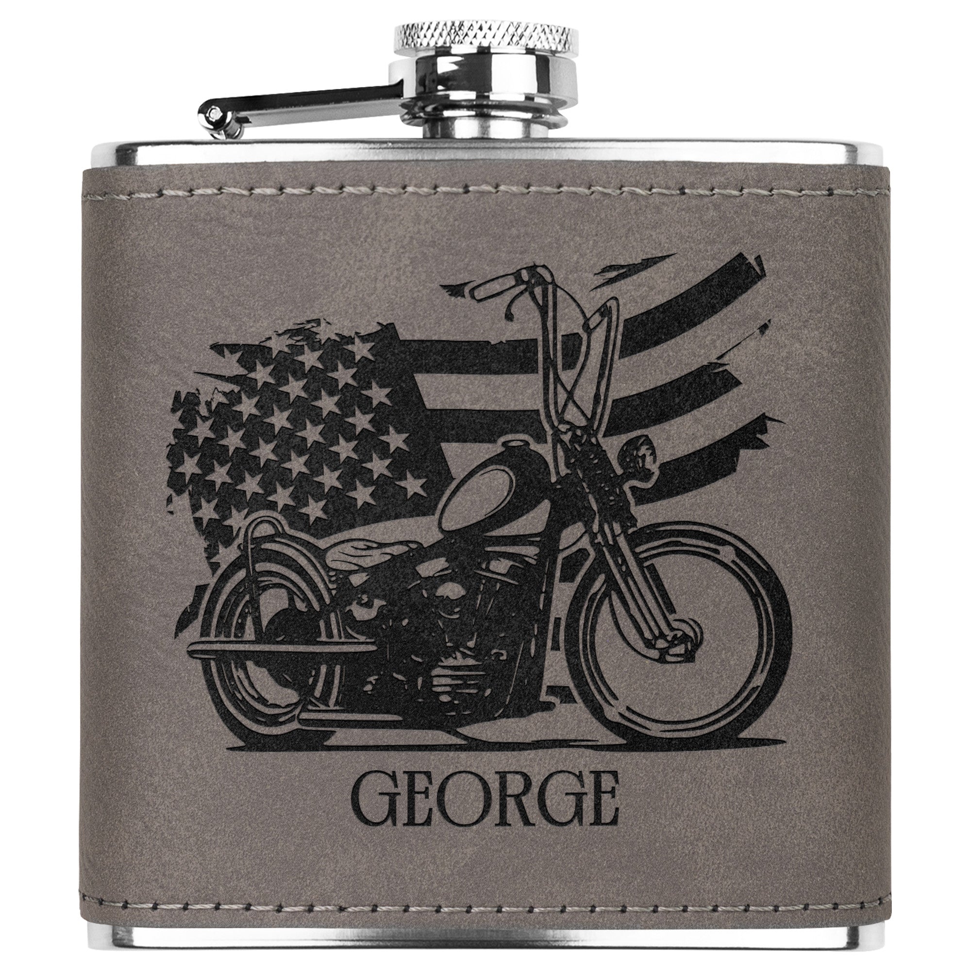 Elevate your riding experience with our Patriotic Biker themed laser engraved leather covered flask. Perfect for motorcycle enthusiasts, this stylish and durable flask makes an ideal gift, combining American Pride and love of country with practical functionality for your adventures on the open road.