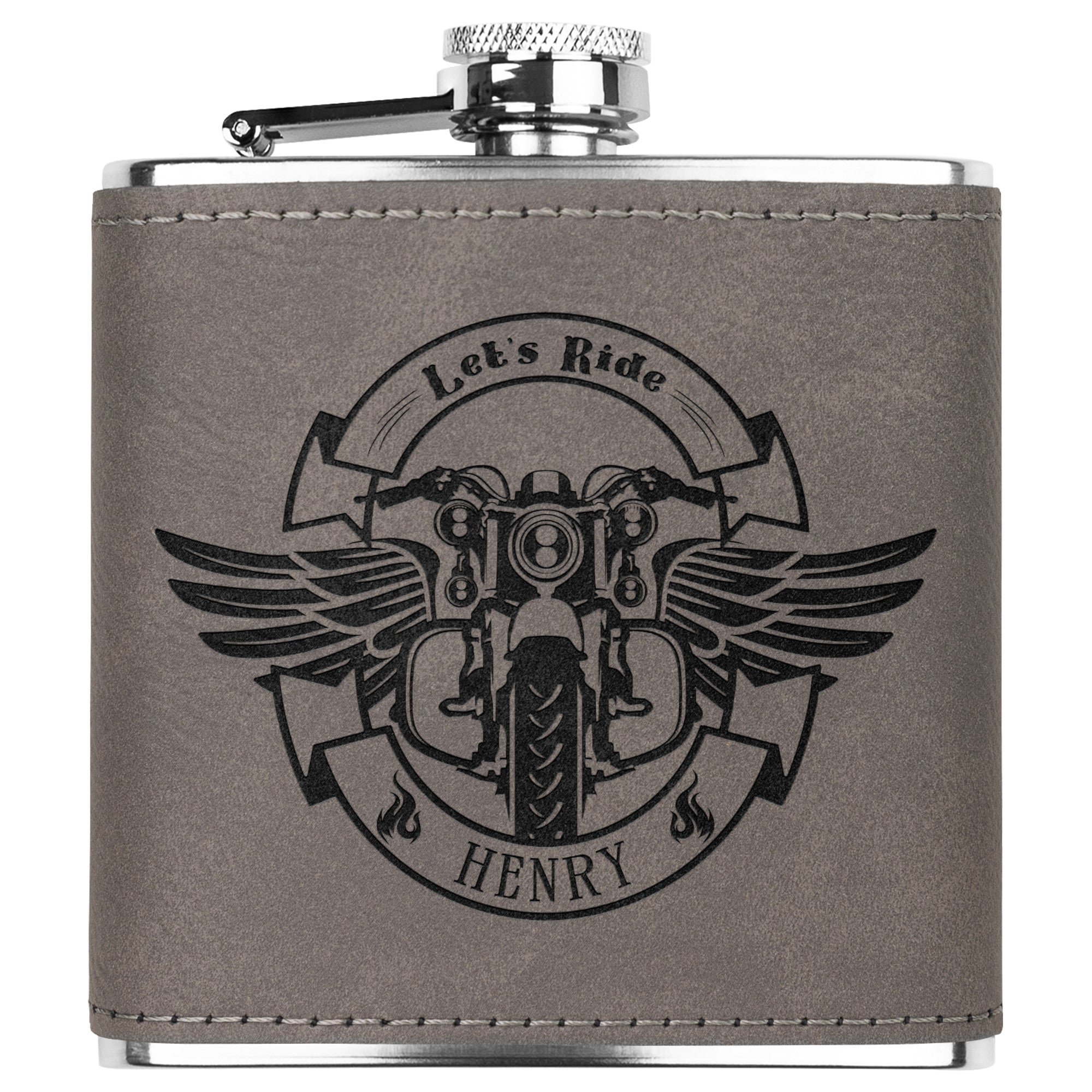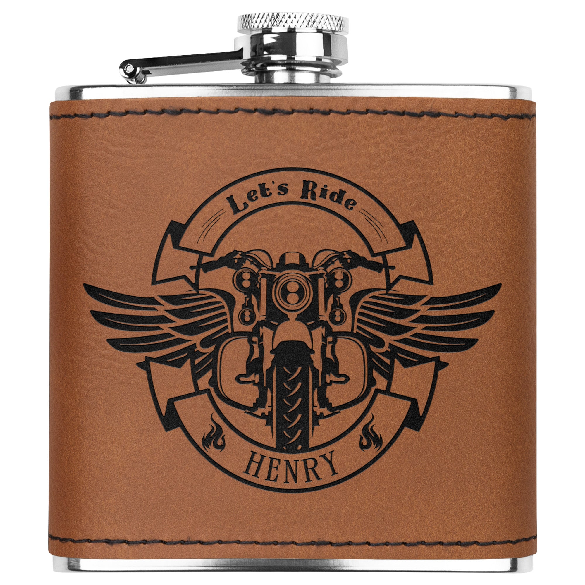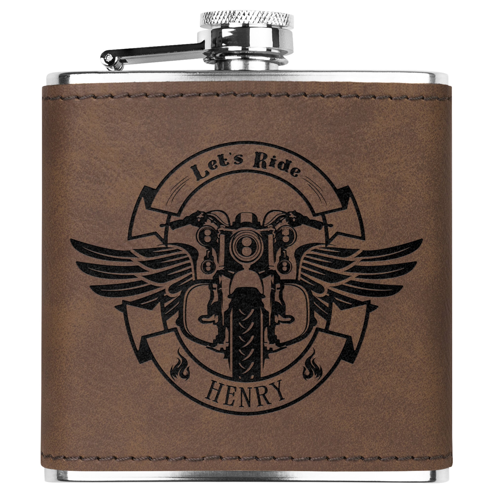 Elevate your riding experience with our personalized biker themed laser engraved leather covered flask. Perfect for motorcycle enthusiasts, this stylish and durable flask makes an ideal gift, combining rugged charm with practical functionality for your adventures on the open road.