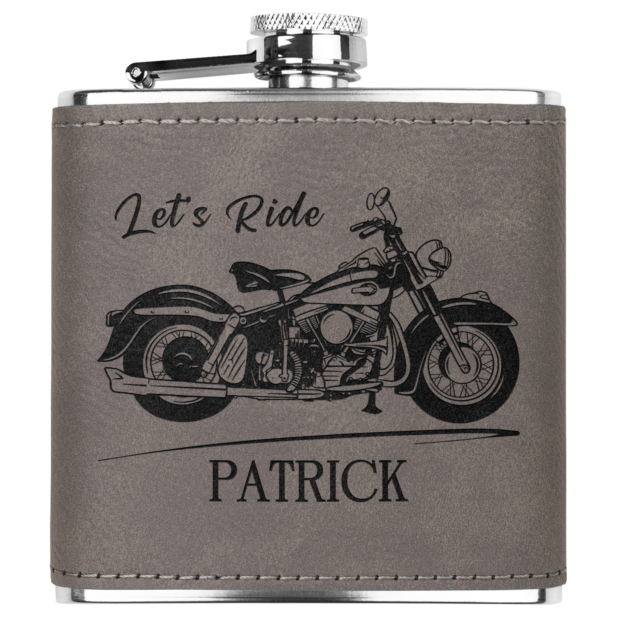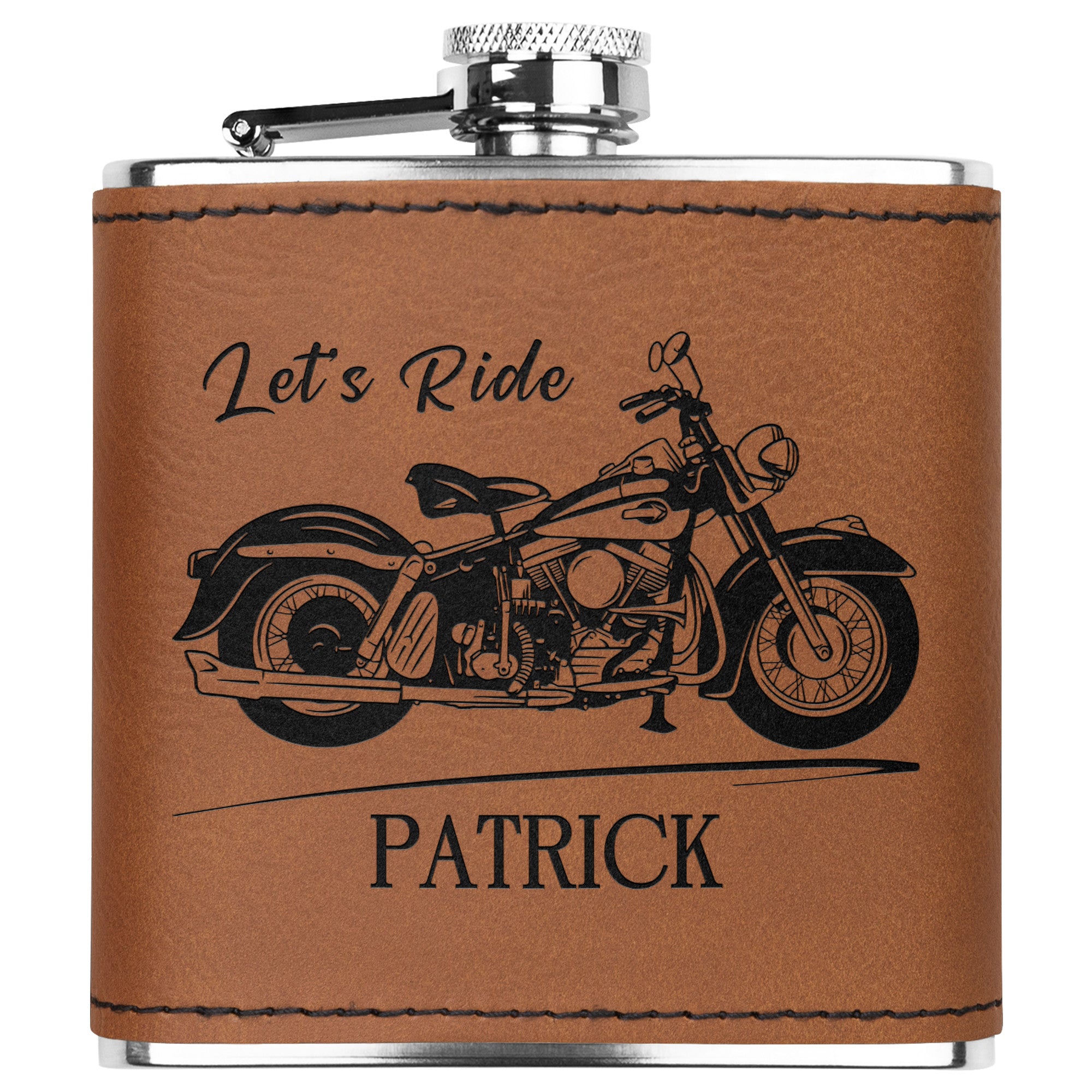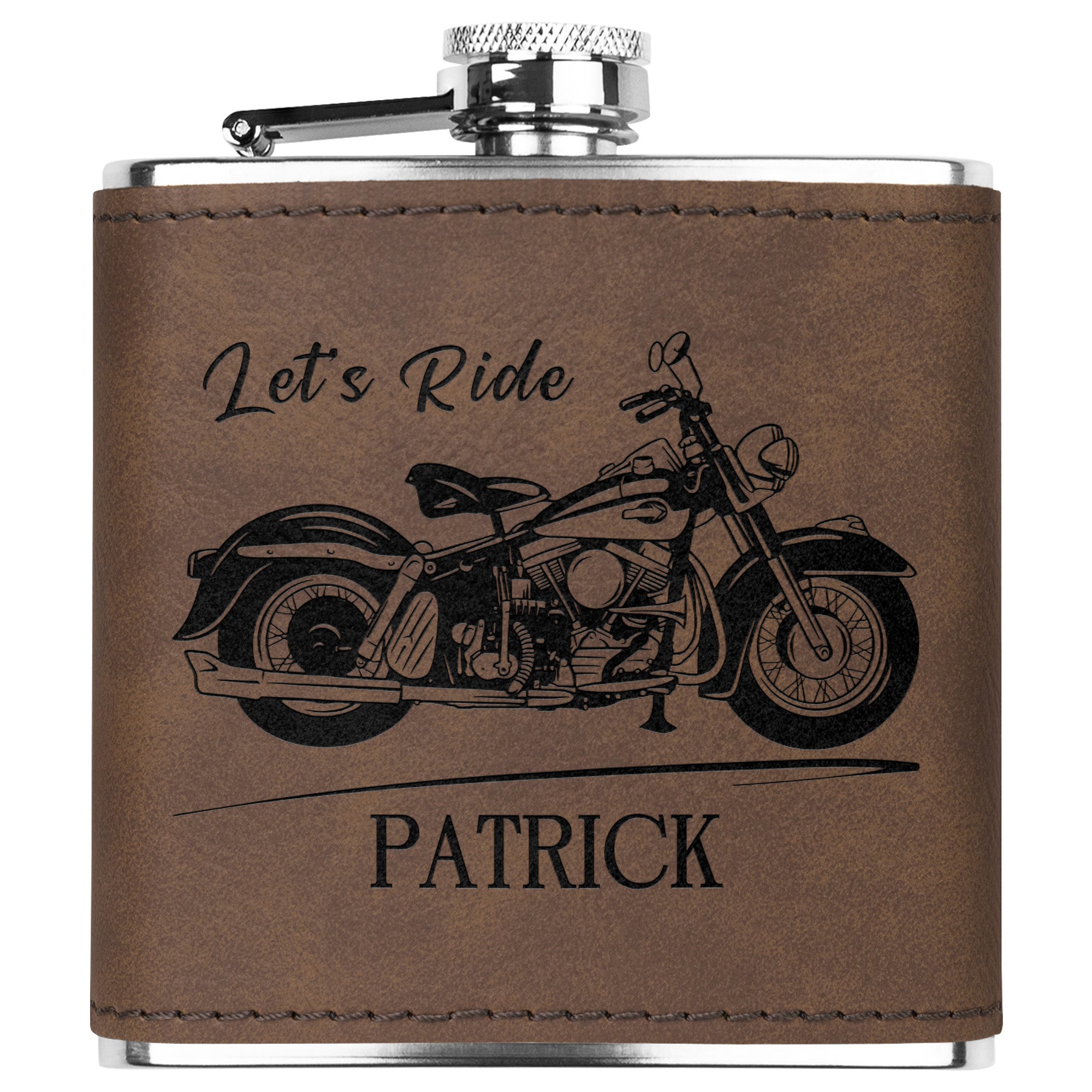 Elevate your riding experience with our personalized biker themed laser engraved leather covered flask. Perfect for motorcycle enthusiasts, this stylish and durable flask makes an ideal gift, combining rugged charm with practical functionality for your adventures on the open road.