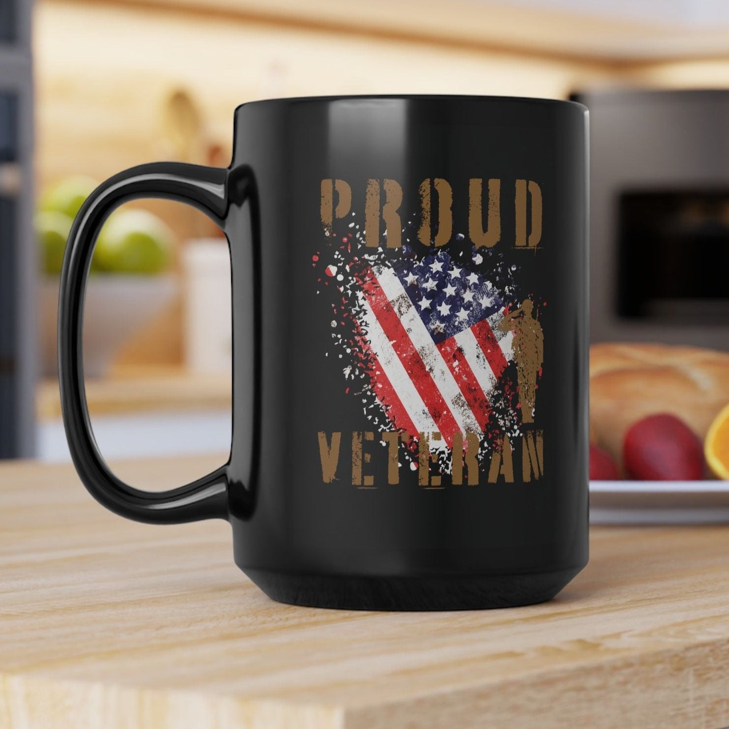 Show your pride with our 15 oz American Veteran Black Coffee Mug, featuring a bold distressed American Flag and a saluting soldier on a striking black background. The words "Proud Veteran" are displayed in grunge-style goldish block font, making it the perfect gift for military veterans or patriotic coffee lovers. Crafted from durable ceramic, this mug is ideal for daily use and a great addition to any home or office.