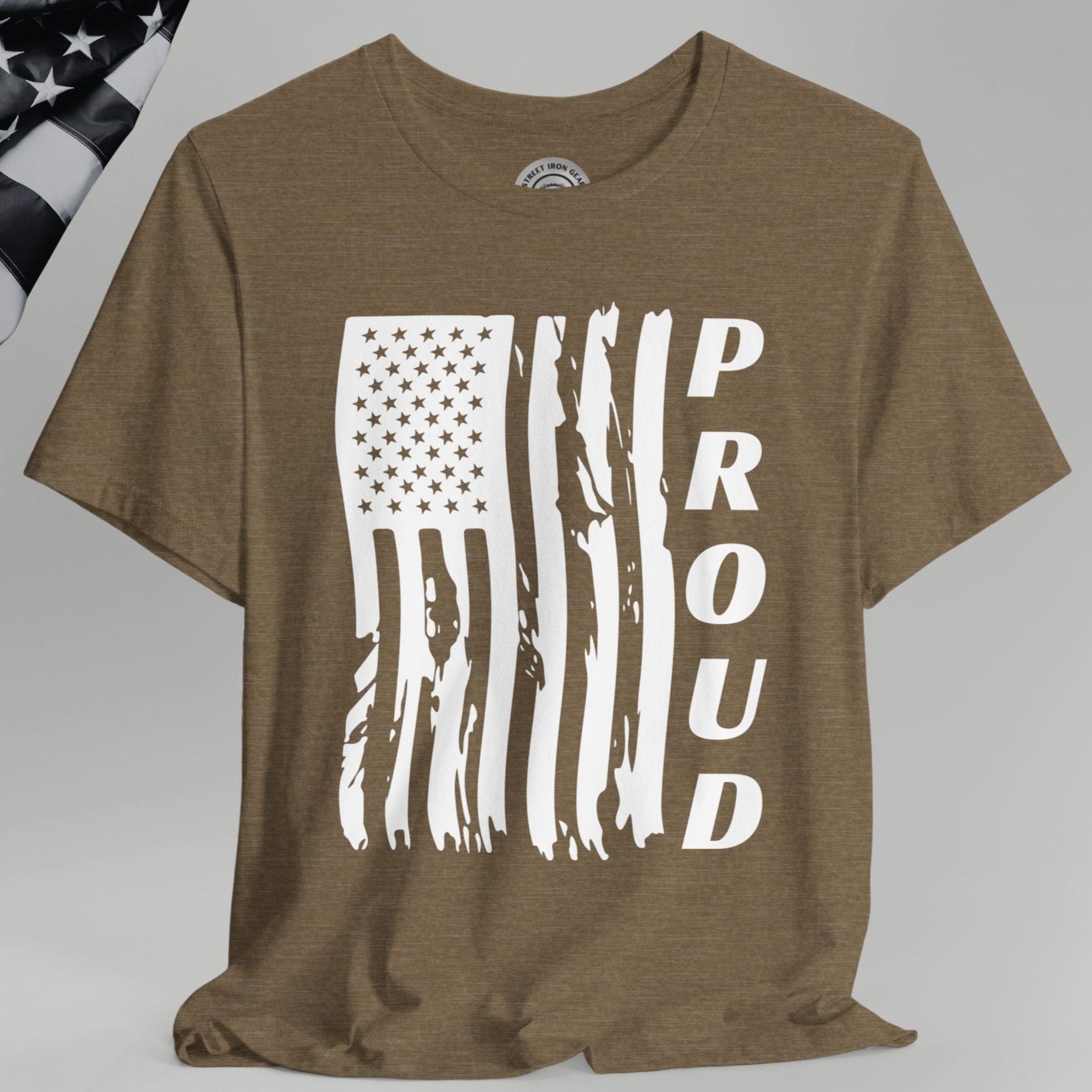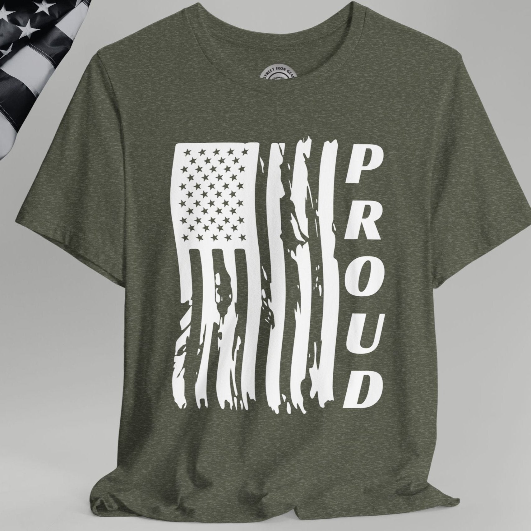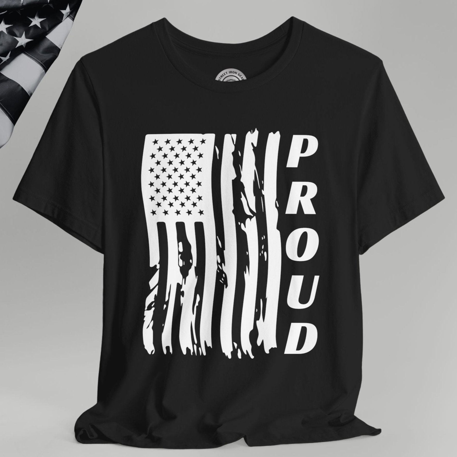 Show your patriotic pride with our Proud American Crew Neck T-Shirt, featuring a bold white distressed American flag design and the word "PROUD" placed vertically alongside it. This comfortable and stylish tee is perfect for anyone who wants to display their love for the USA, whether it's for everyday wear, special events, or national holidays. Made from high-quality fabric, it's a great gift for patriots and those who cherish their American heritage.