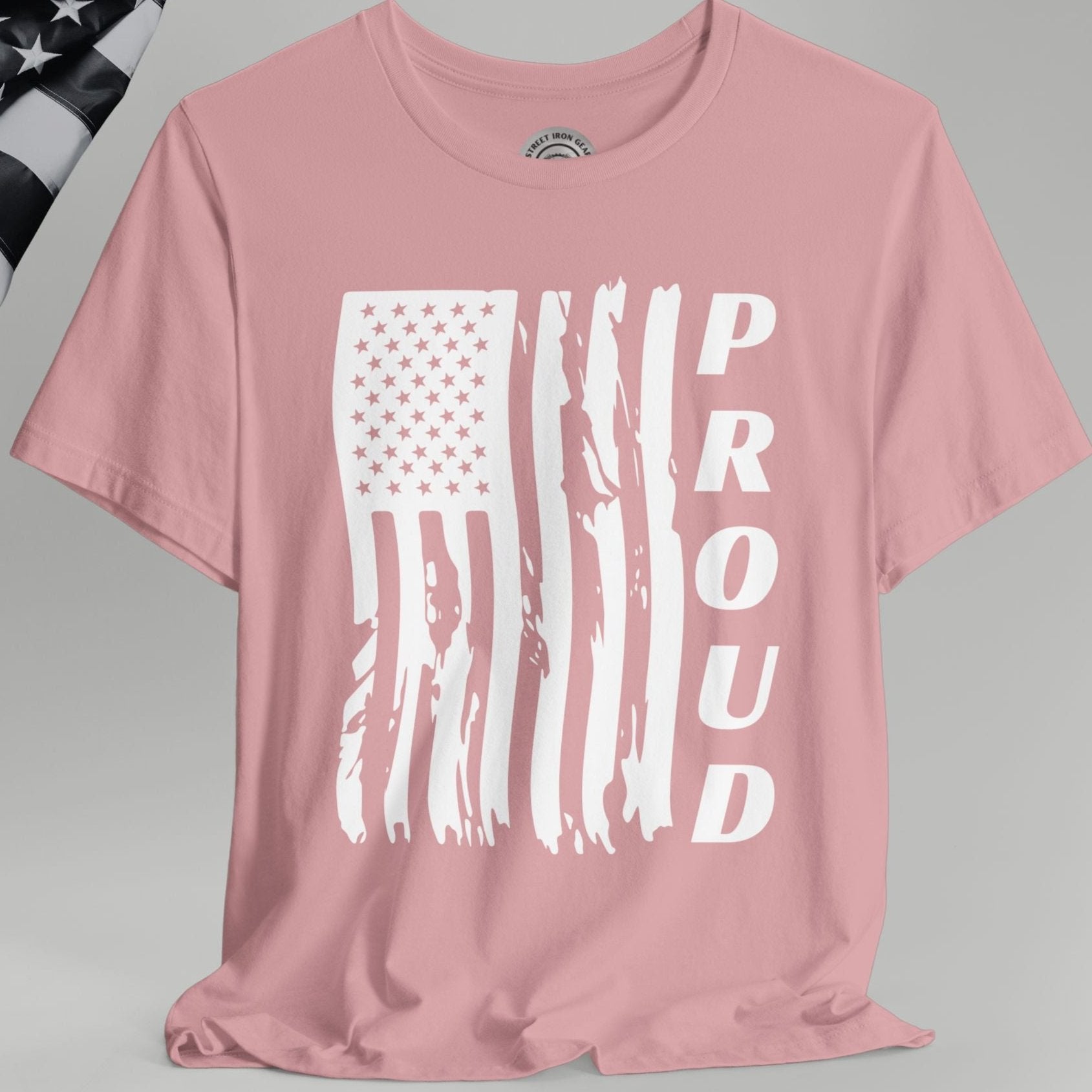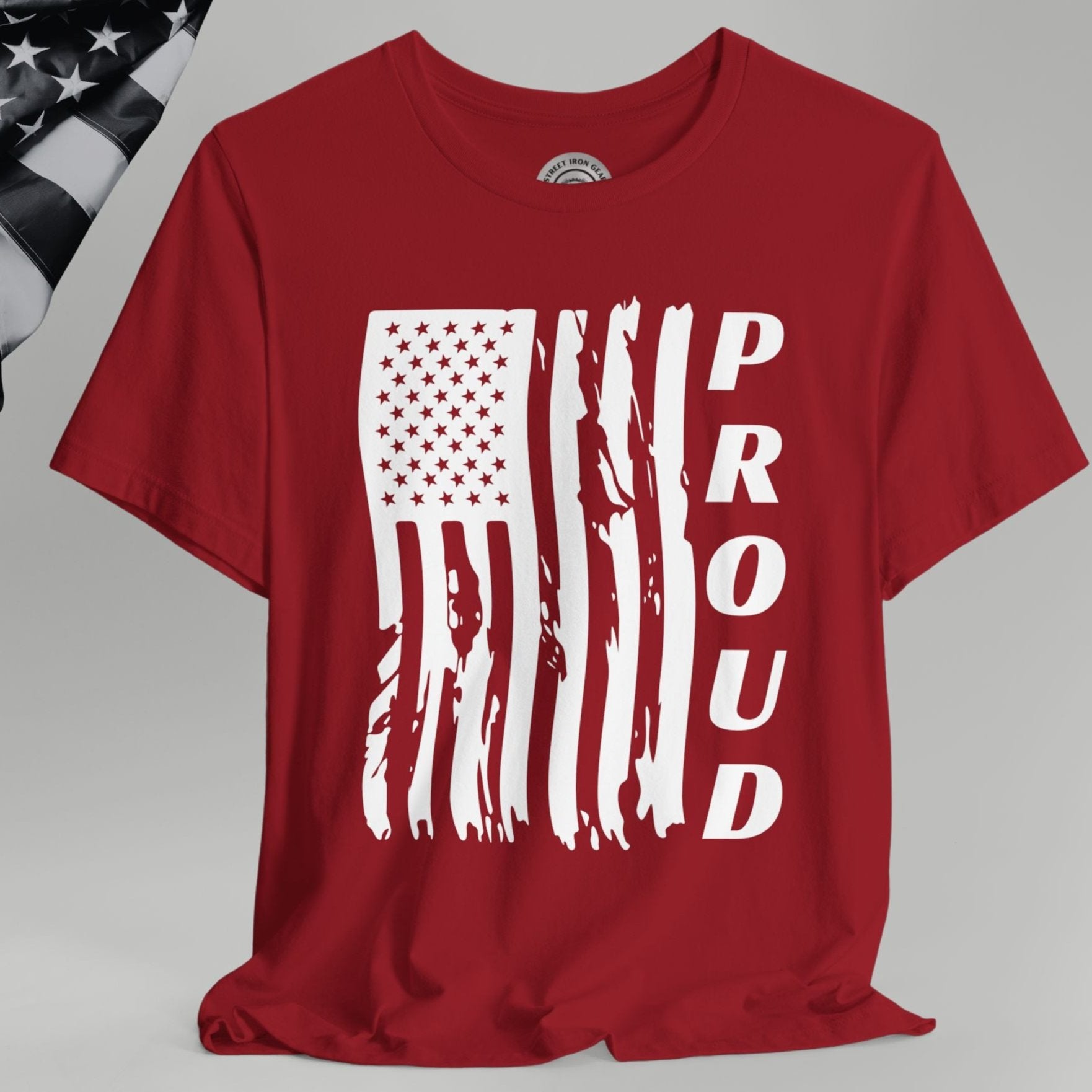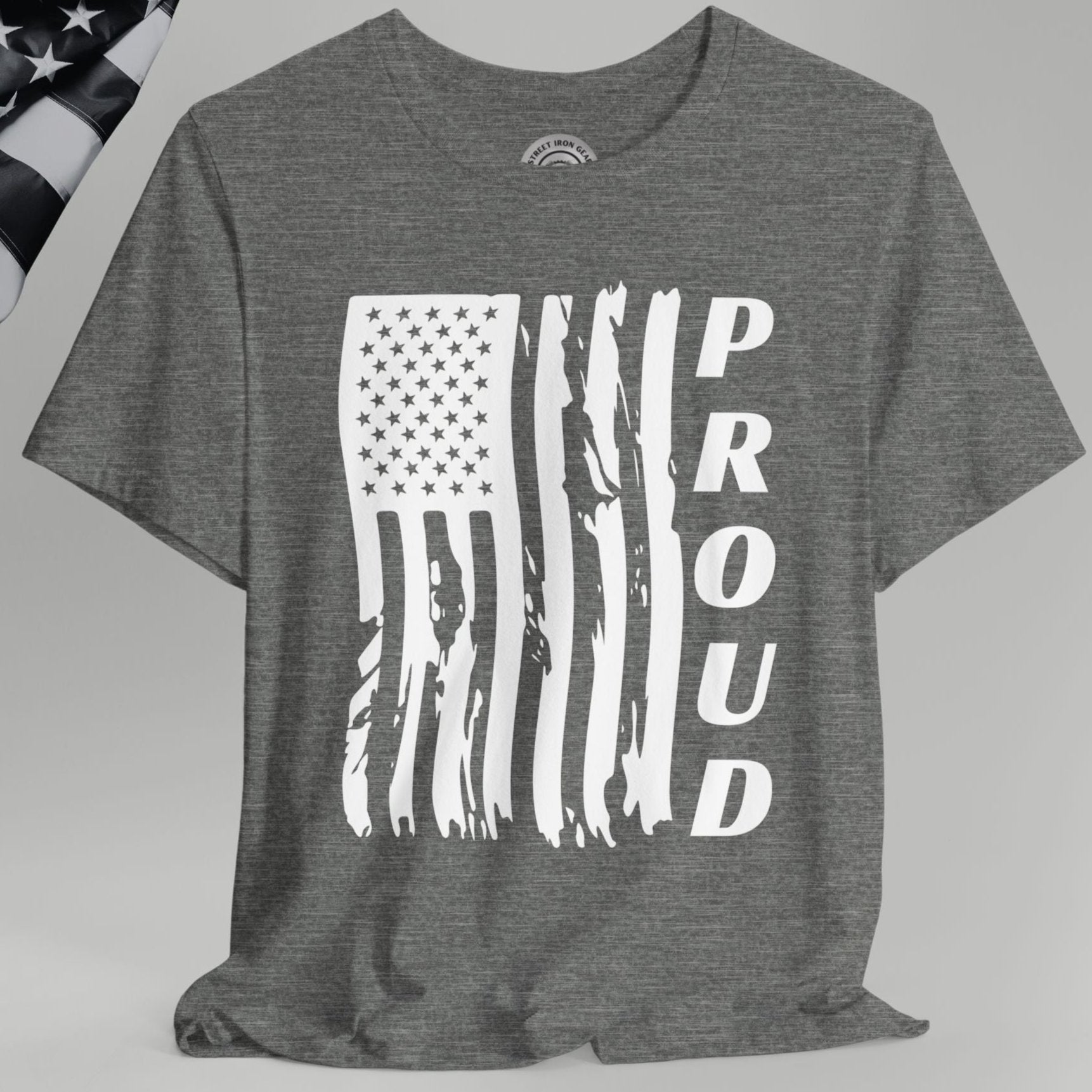 Show your patriotic pride with our Proud American Crew Neck T-Shirt, featuring a bold white distressed American flag design and the word "PROUD" placed vertically alongside it. This comfortable and stylish tee is perfect for anyone who wants to display their love for the USA, whether it's for everyday wear, special events, or national holidays. Made from high-quality fabric, it's a great gift for patriots and those who cherish their American heritage.