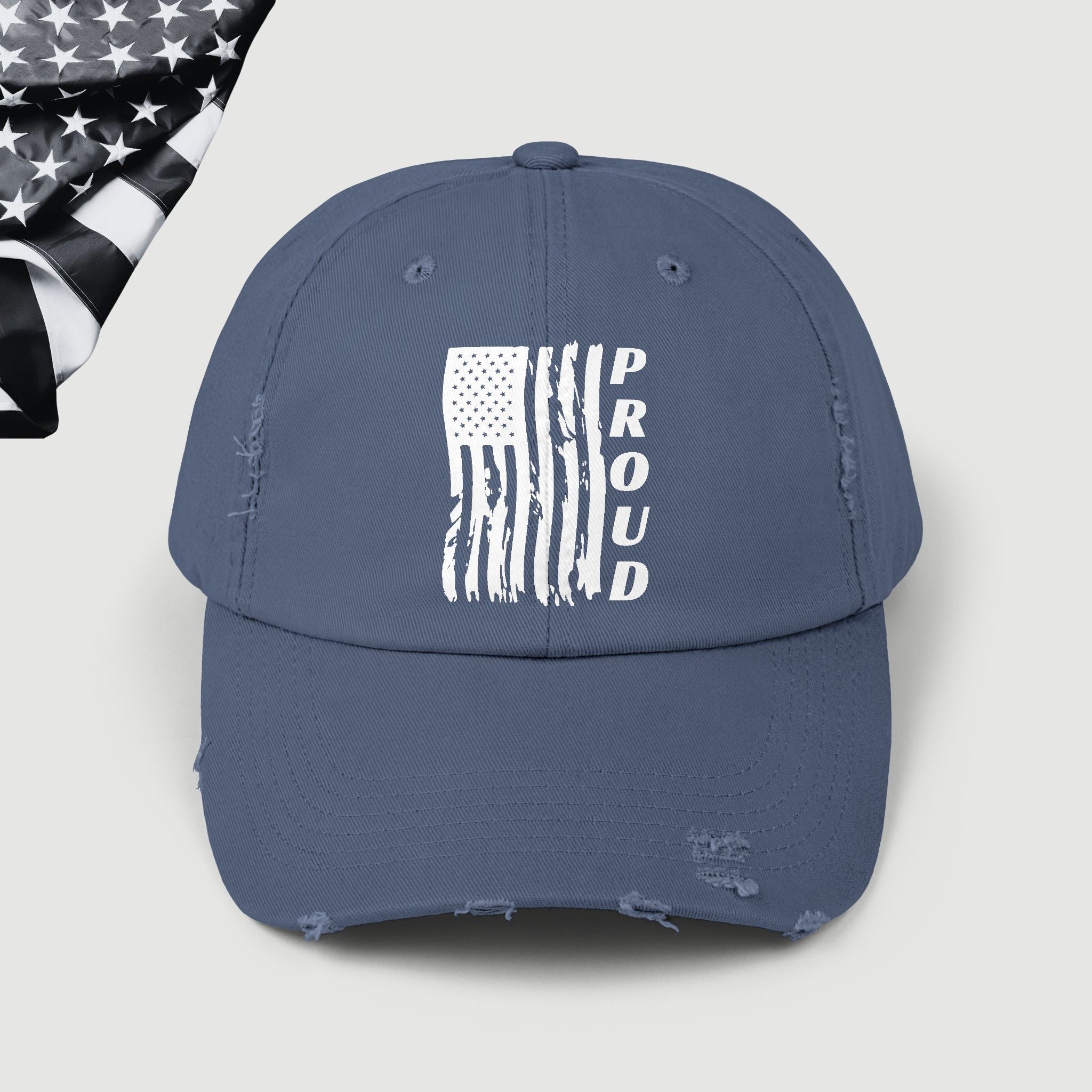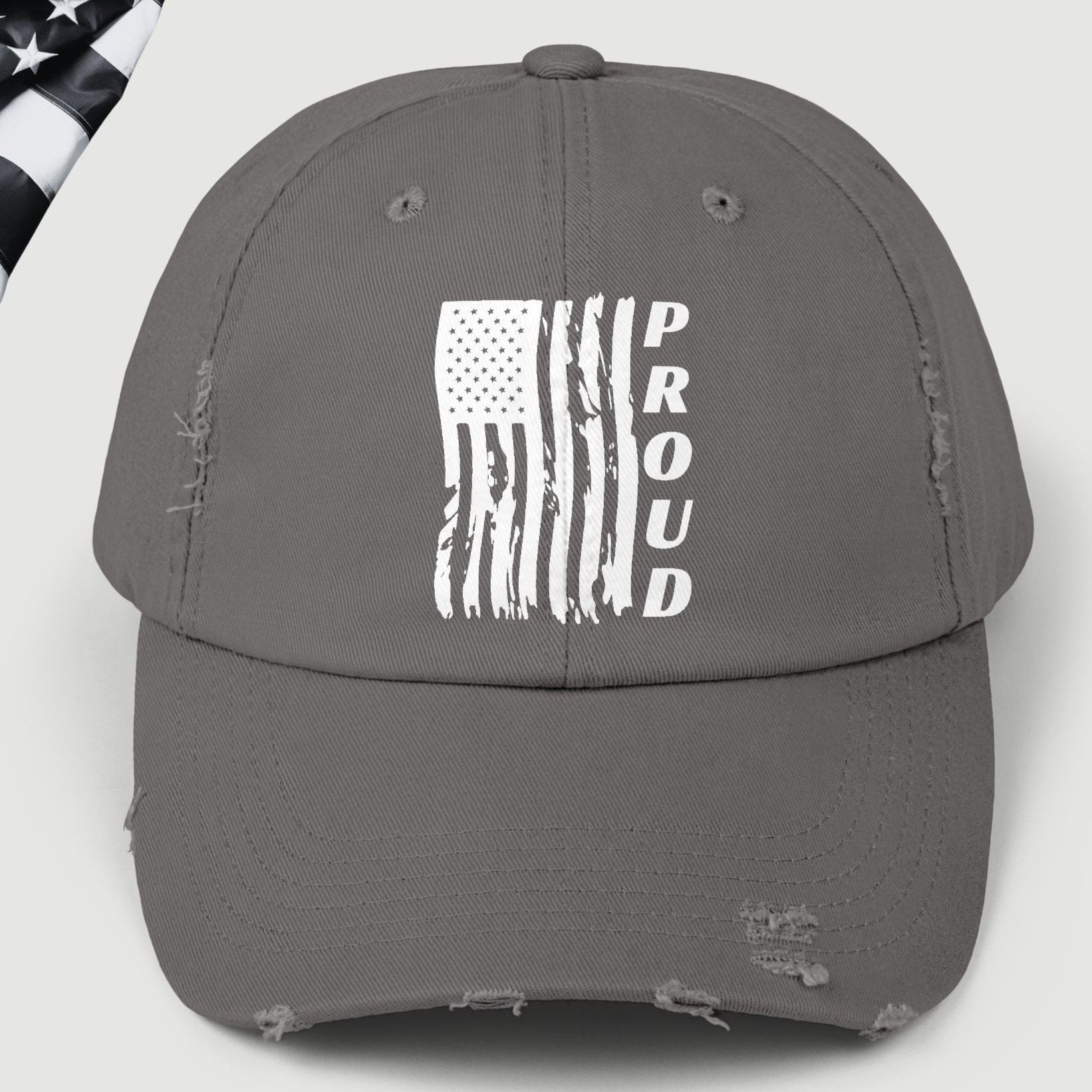 how your patriotic pride with our Proud American distressed Dad hat, featuring a bold white distressed American flag design and the word "PROUD" placed vertically alongside it. This comfortable and cap is perfect for anyone who wants to display their love for the USA, whether it's for everyday wear, special events, or national holidays. Made from high-quality fabric, it's a great gift for patriots and those who cherish their American heritage.