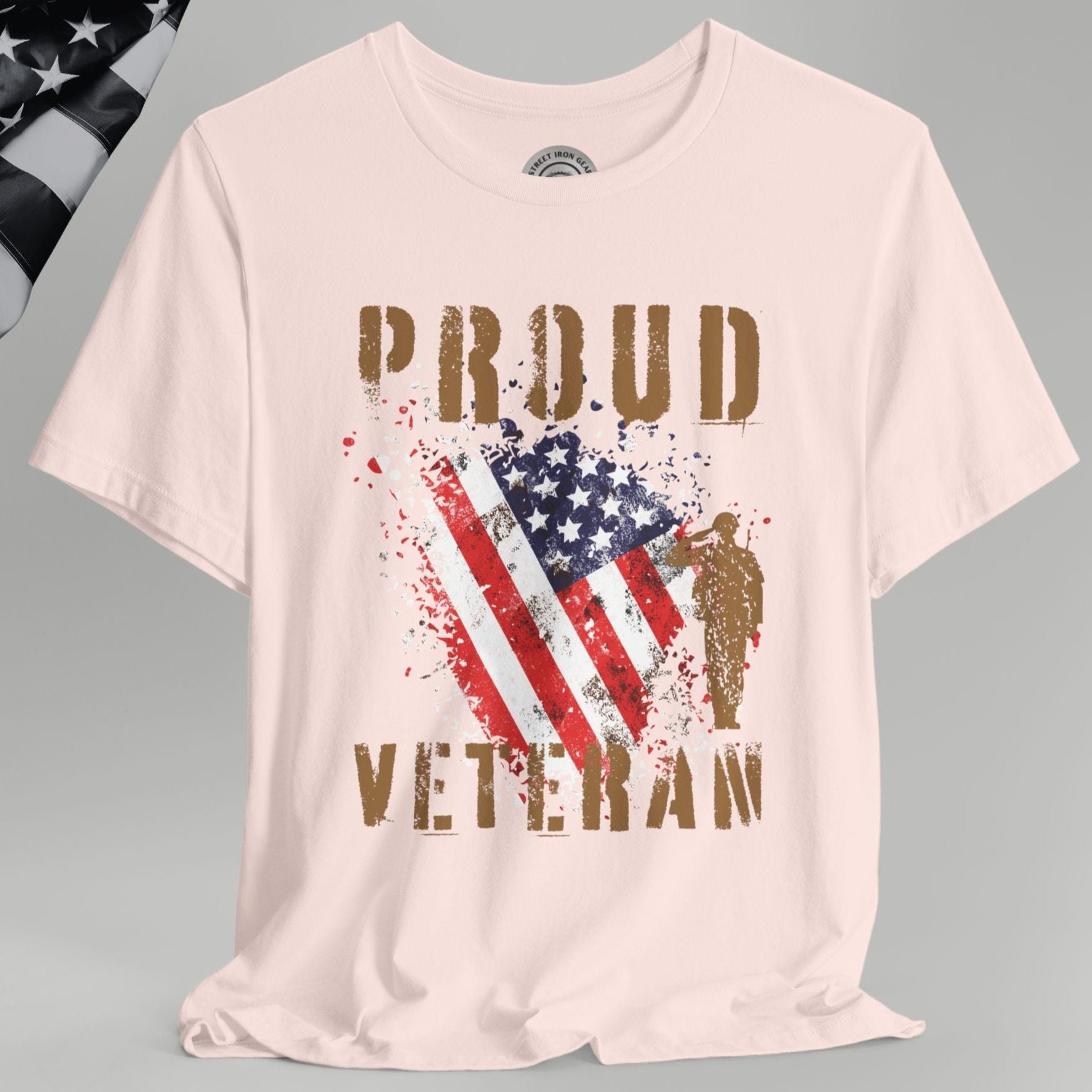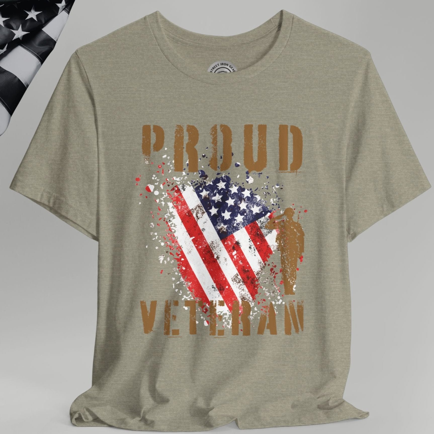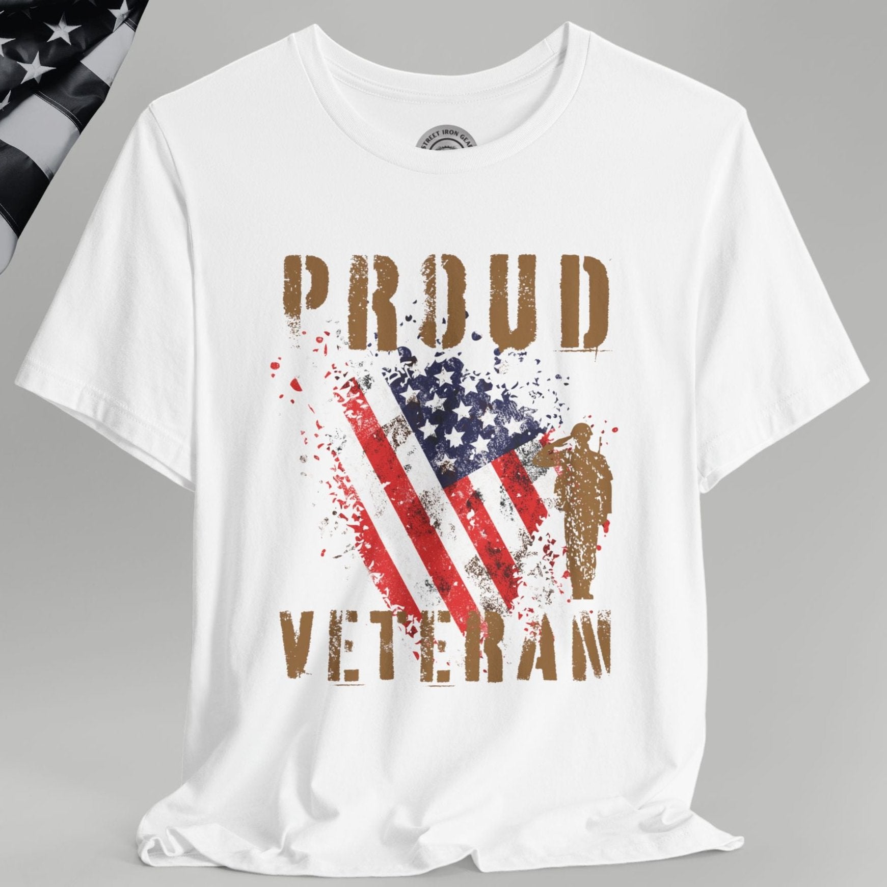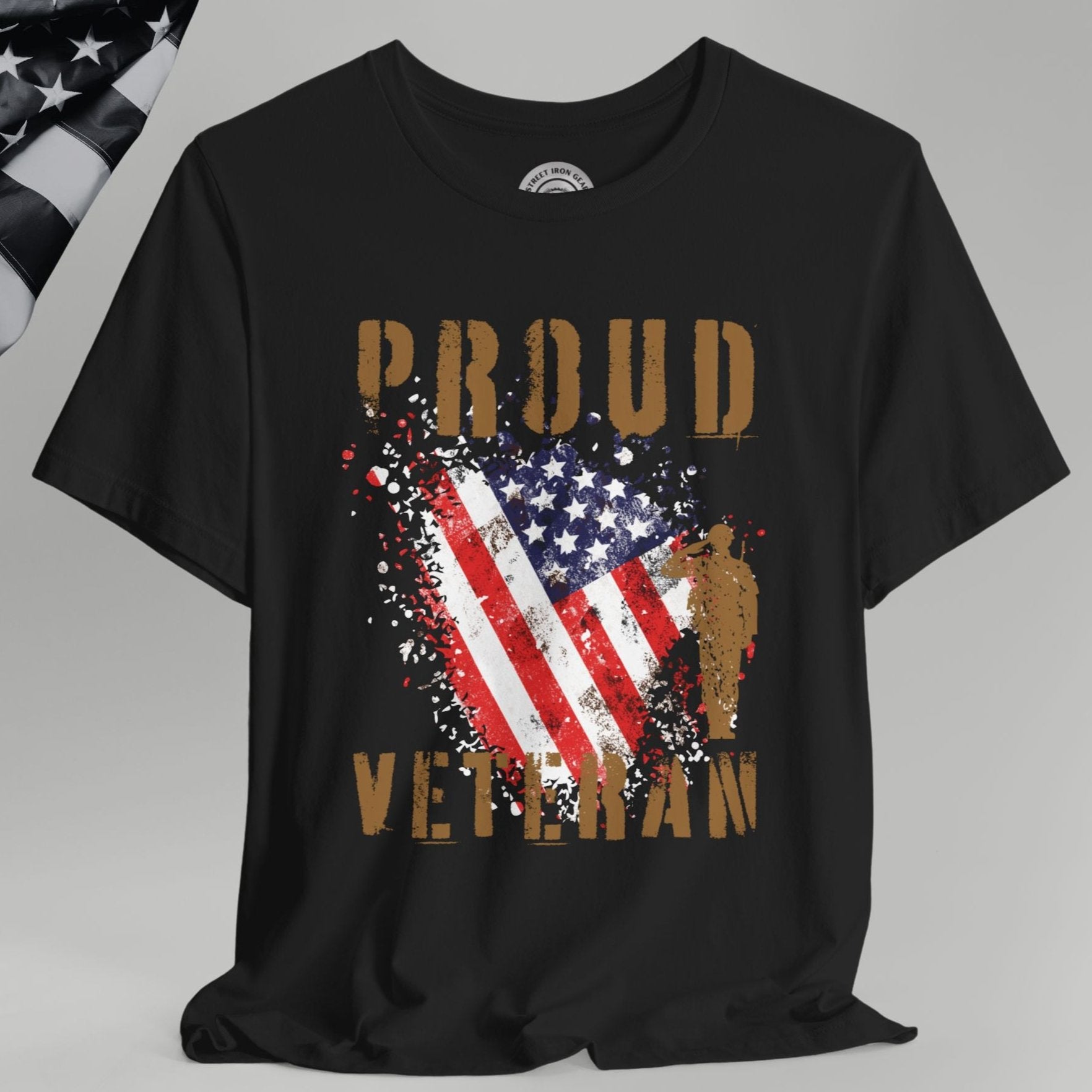 Honor the brave with our American Veteran Crew Neck T-shirt, featuring a distressed American flag and a saluting soldier design. This bold tee proudly displays the words "Proud Veteran" in grunge-style goldish block font, making it a perfect tribute to those who have served. Ideal for Veterans Day, Memorial Day, or as a meaningful gift for a proud veteran, this high-quality shirt combines comfort and patriotism in one unique design.