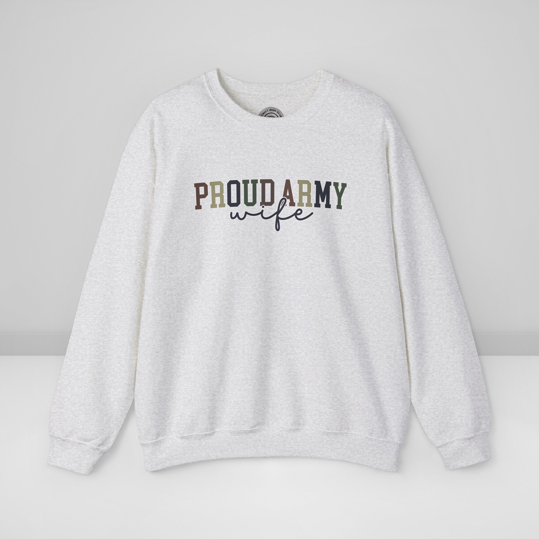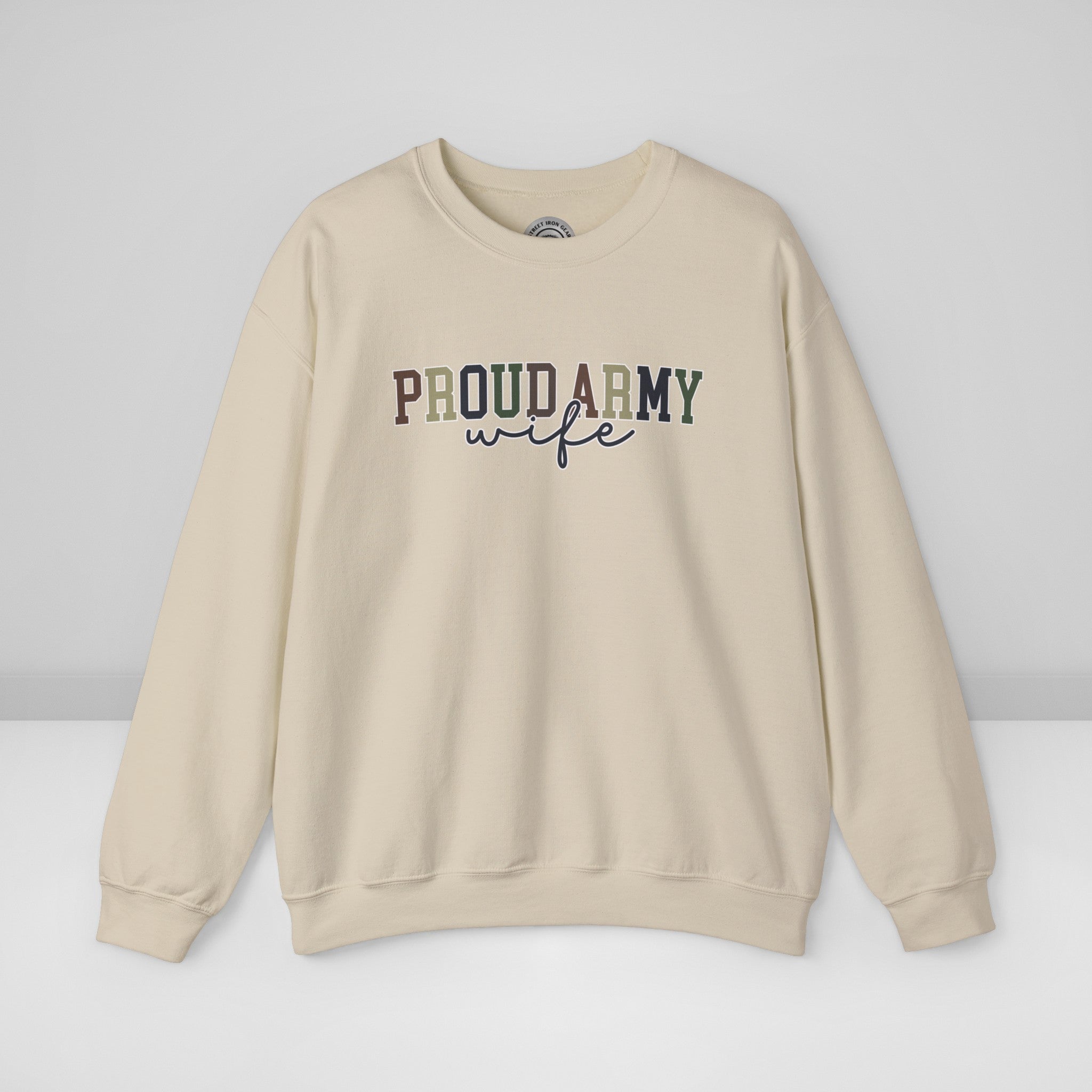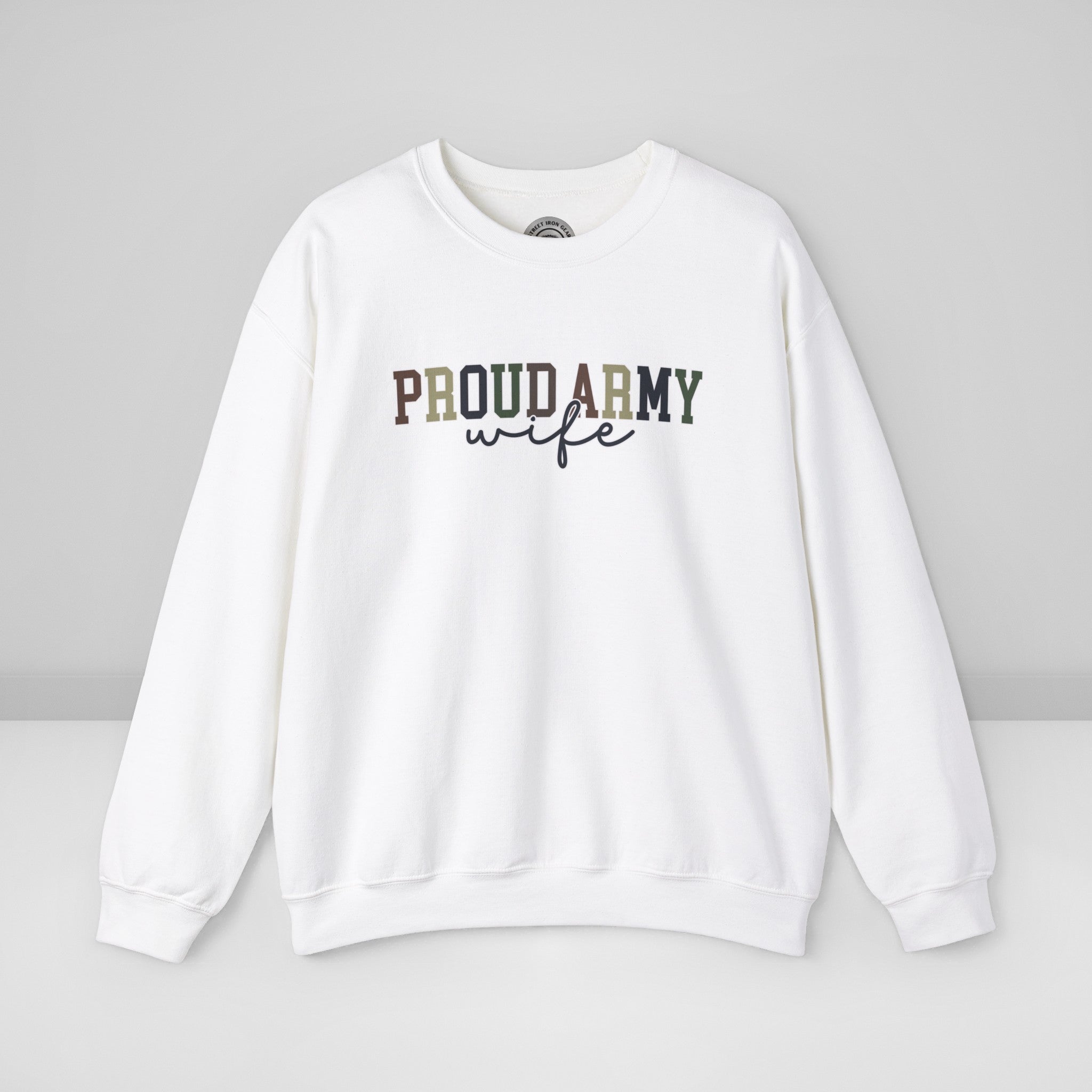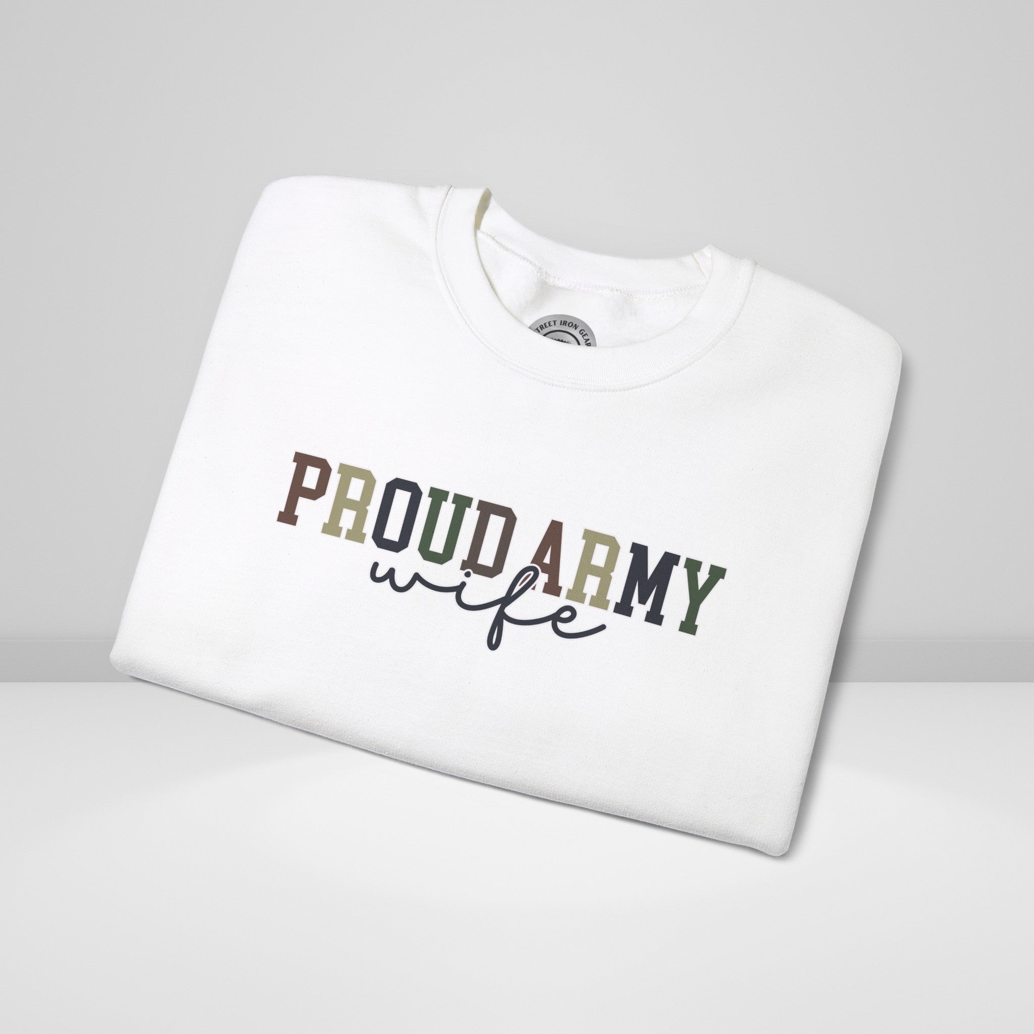 Express your pride with our "Proud Army Wife" T-shirt! This tee showcases the message in a combination of collegiate and script fonts, against a color palette inspired by the Army, all boldly outlined in soft white.