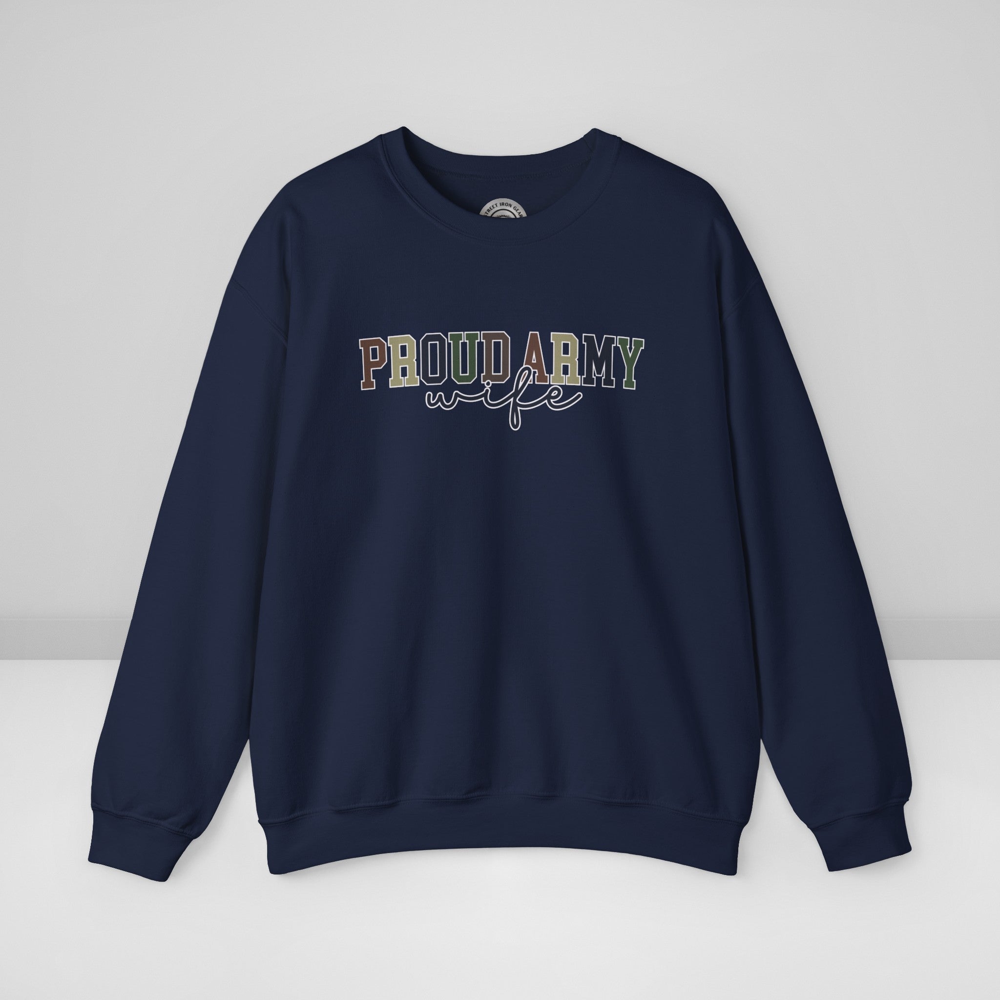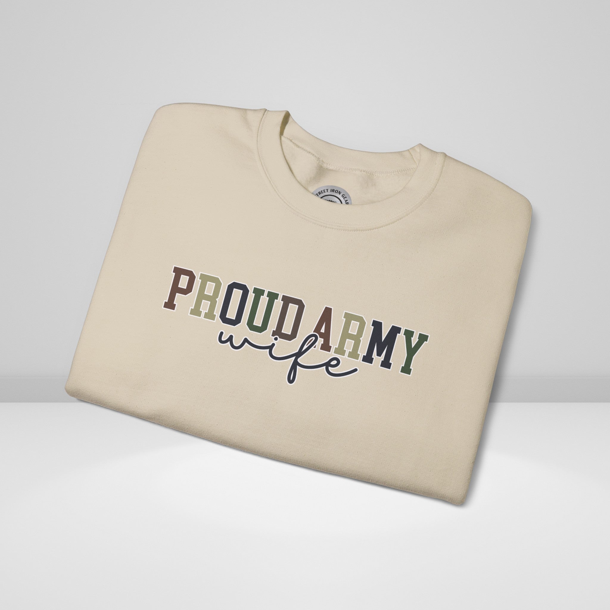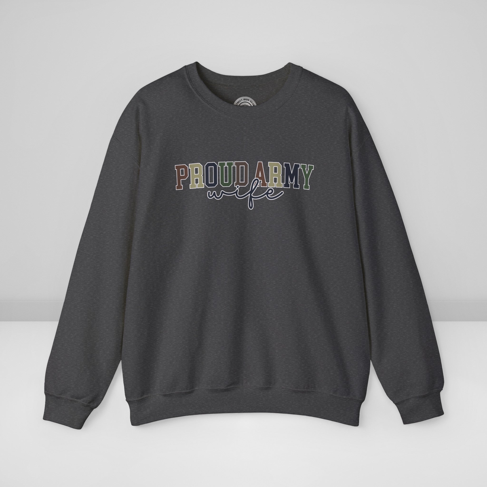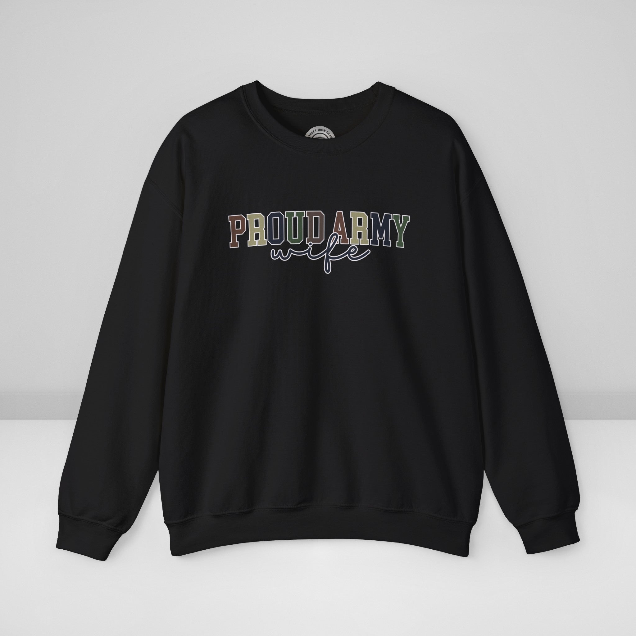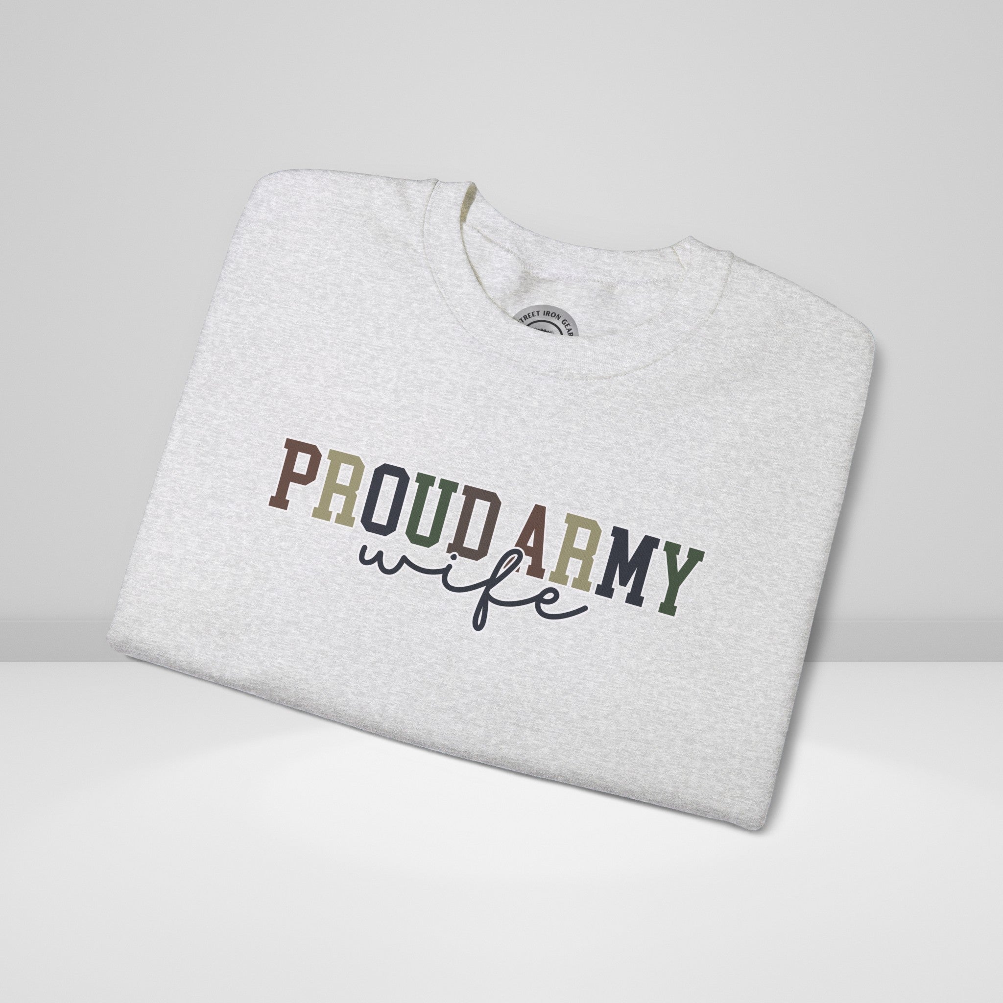 Express your pride with our "Proud Army Wife" T-shirt! This tee showcases the message in a combination of collegiate and script fonts, against a color palette inspired by the Army, all boldly outlined in soft white.