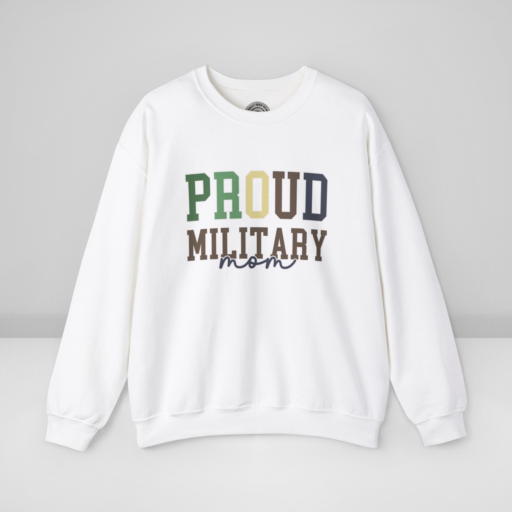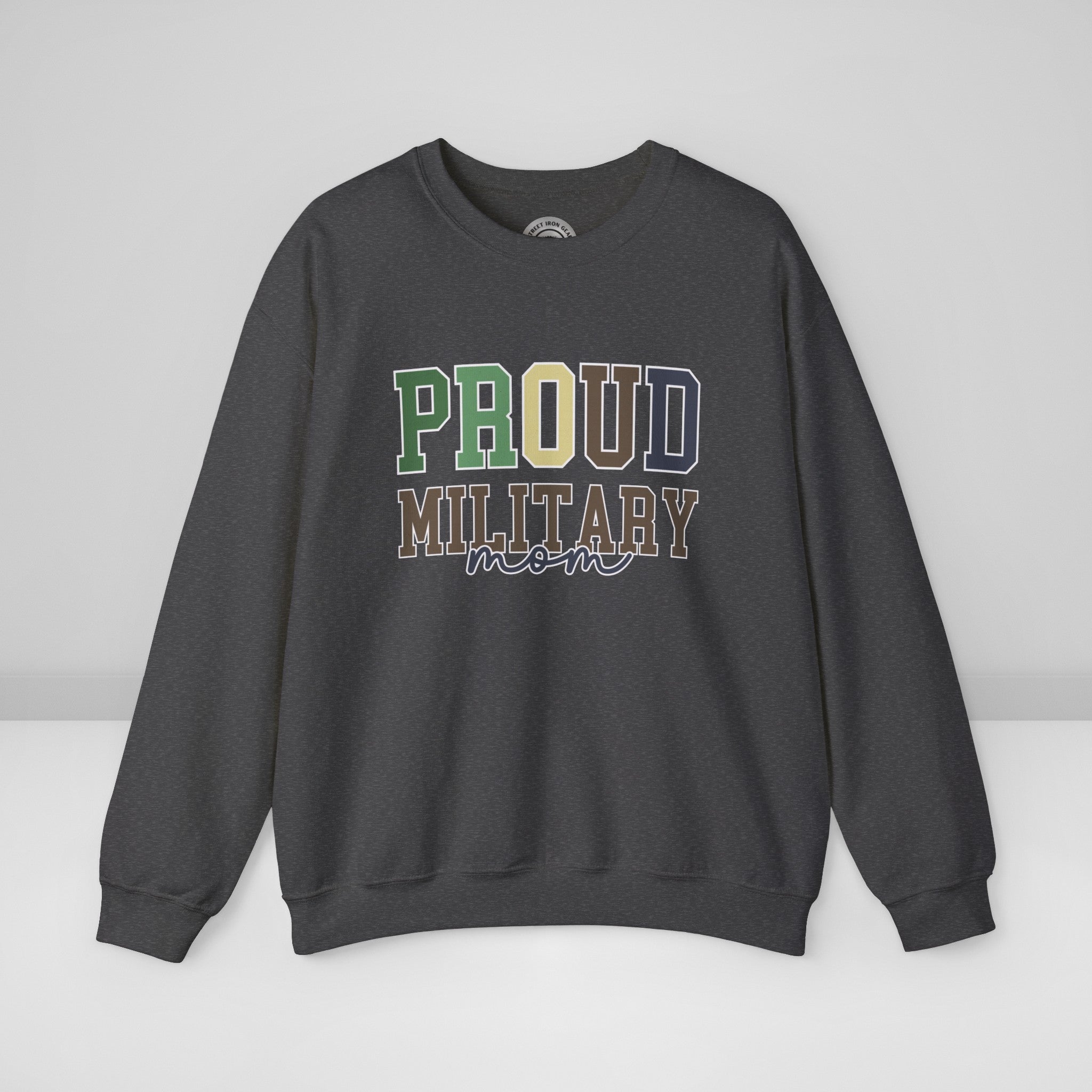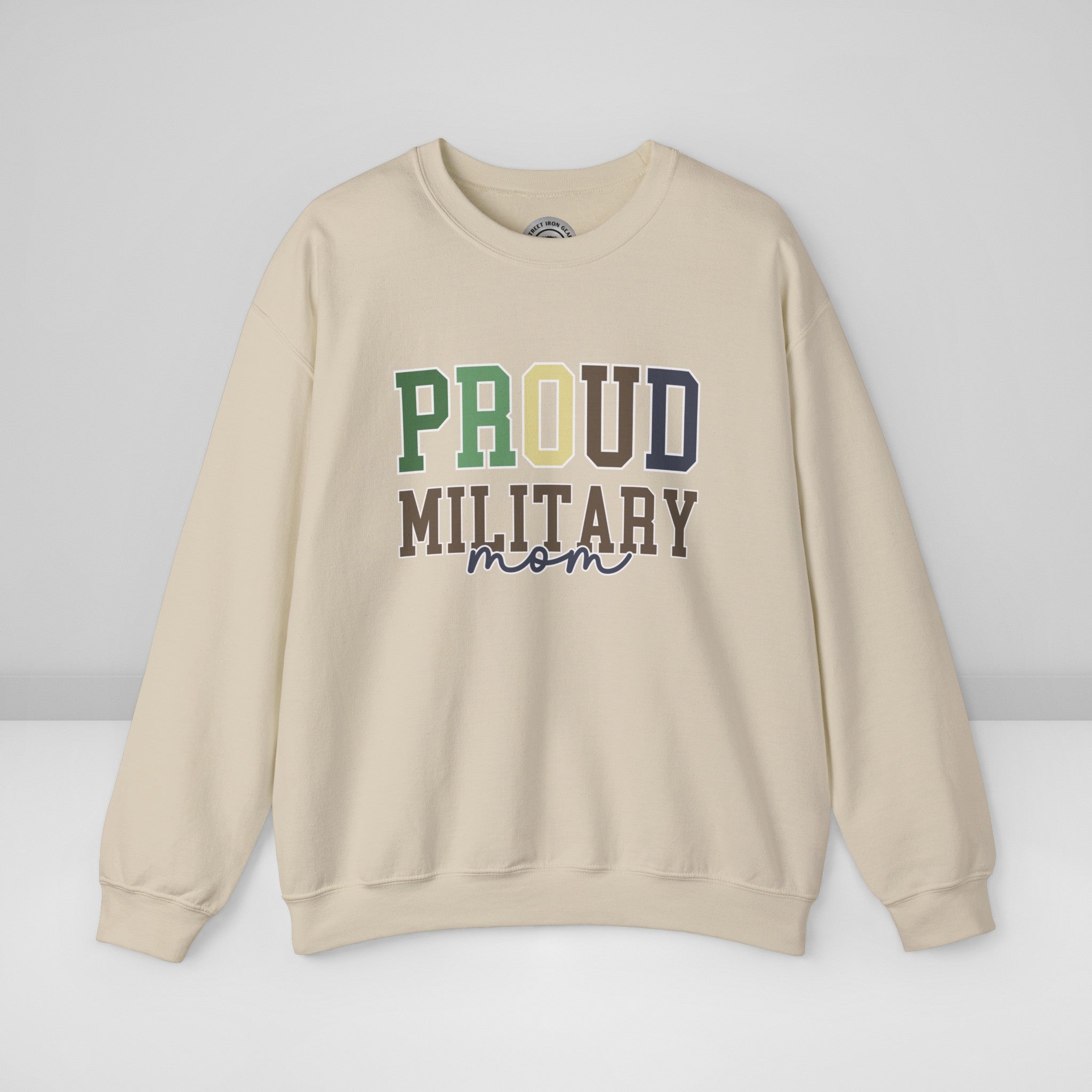 Show your unwavering support with our "Proud Military Mom" sweatshirt! This shirt proudly features the message in a combination of collegiate and script fonts, set against a military-inspired color palette, and boldly outlined in soft white.