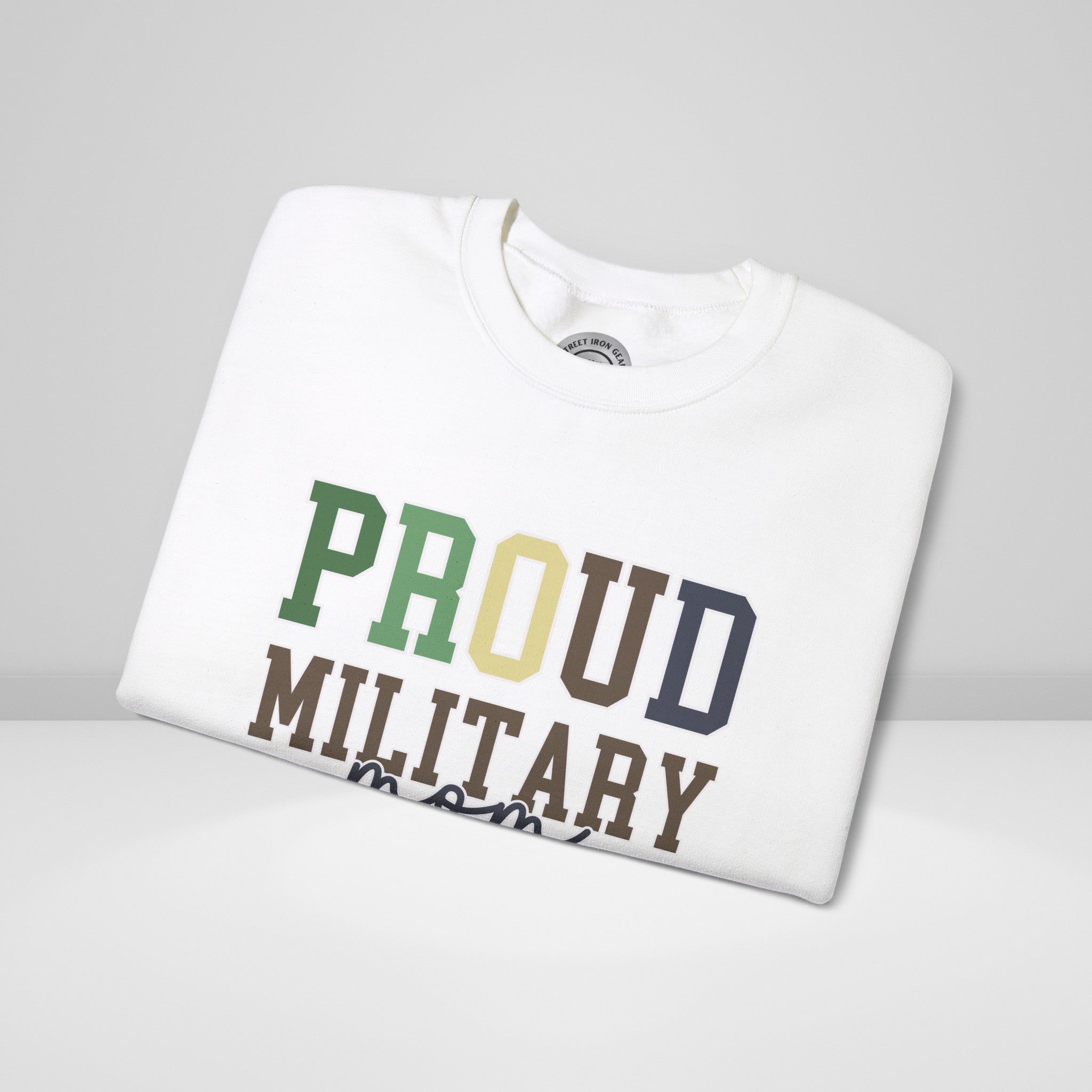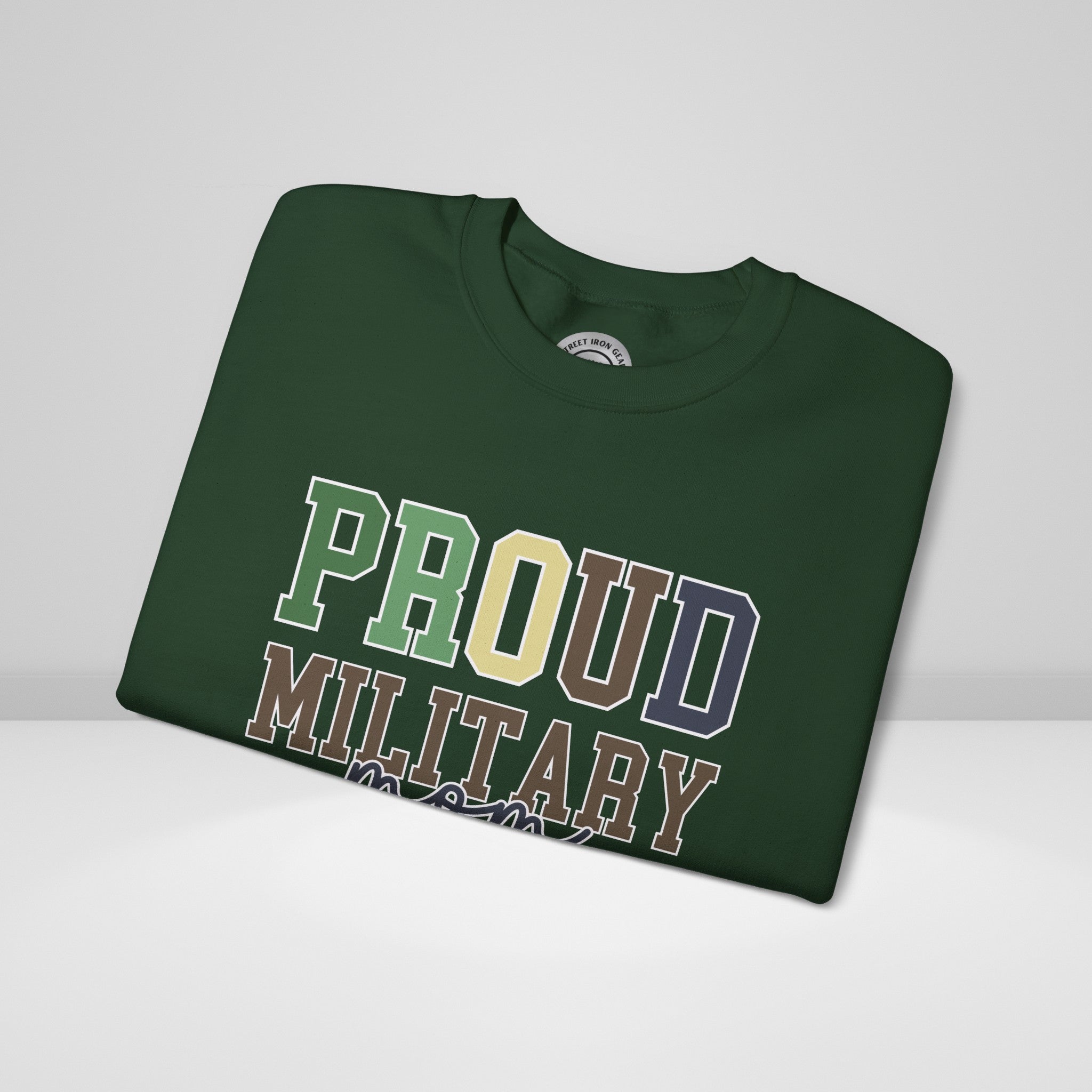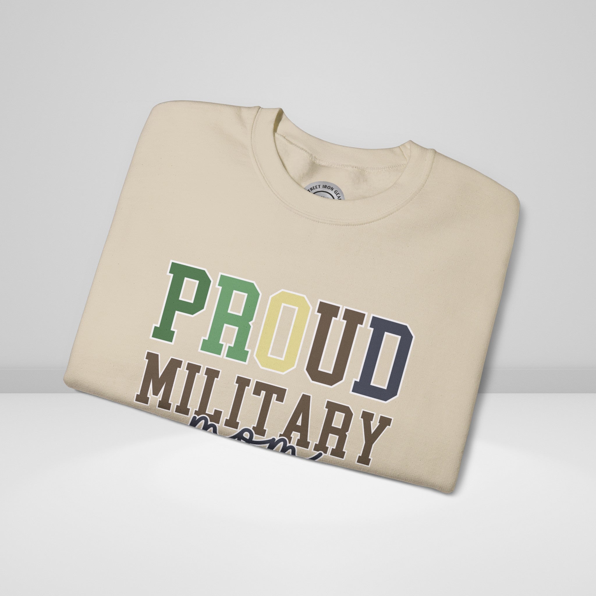 Show your unwavering support with our "Proud Military Mom" sweatshirt! This shirt proudly features the message in a combination of collegiate and script fonts, set against a military-inspired color palette, and boldly outlined in soft white.