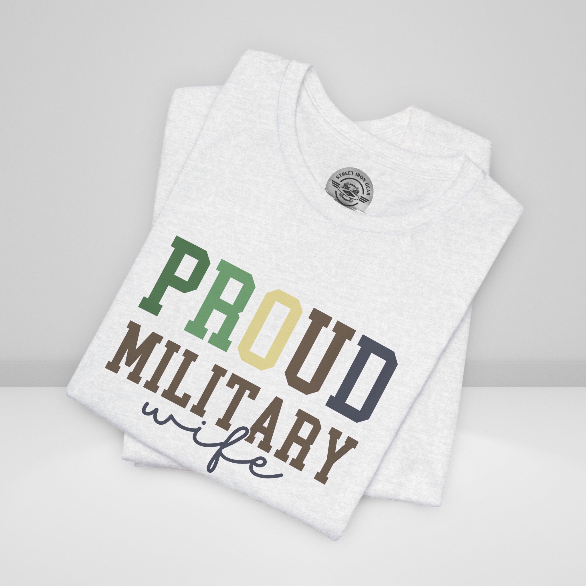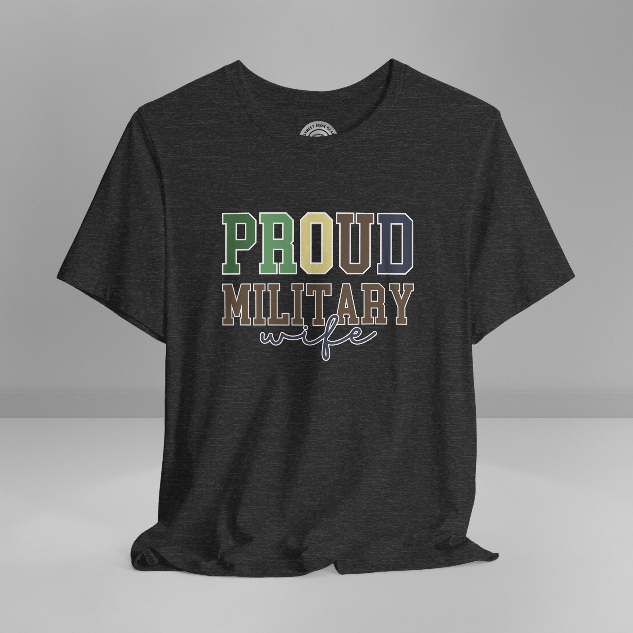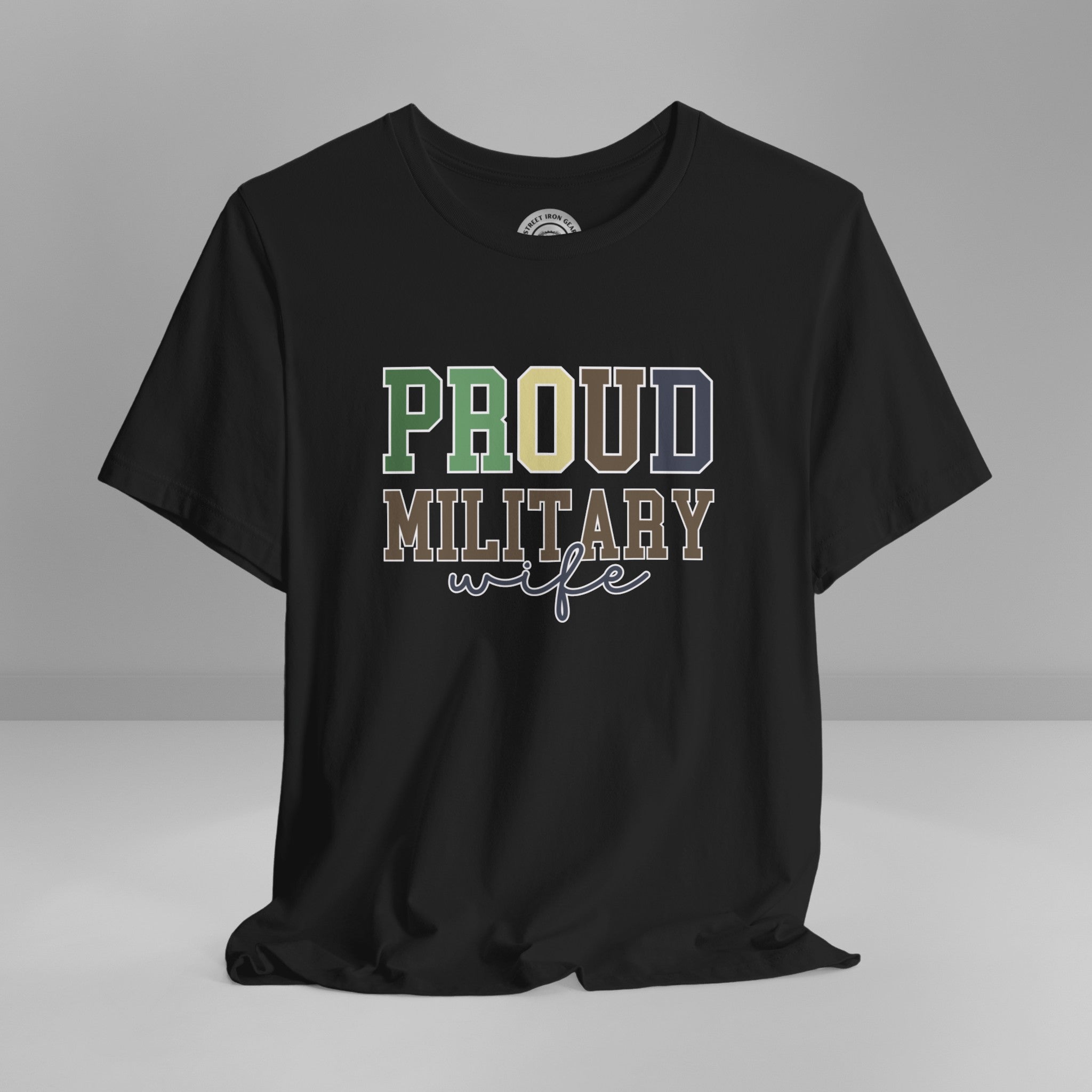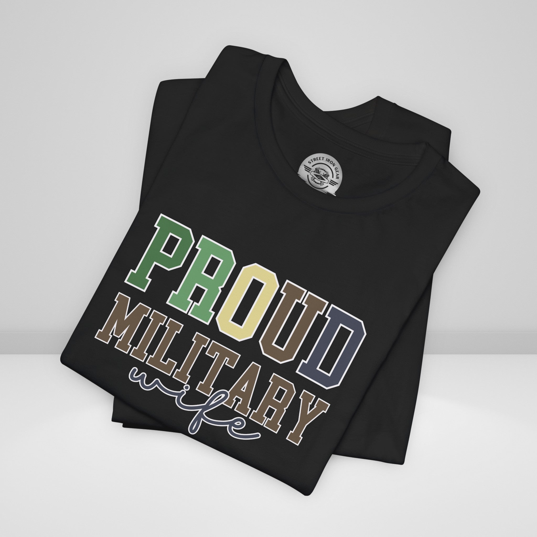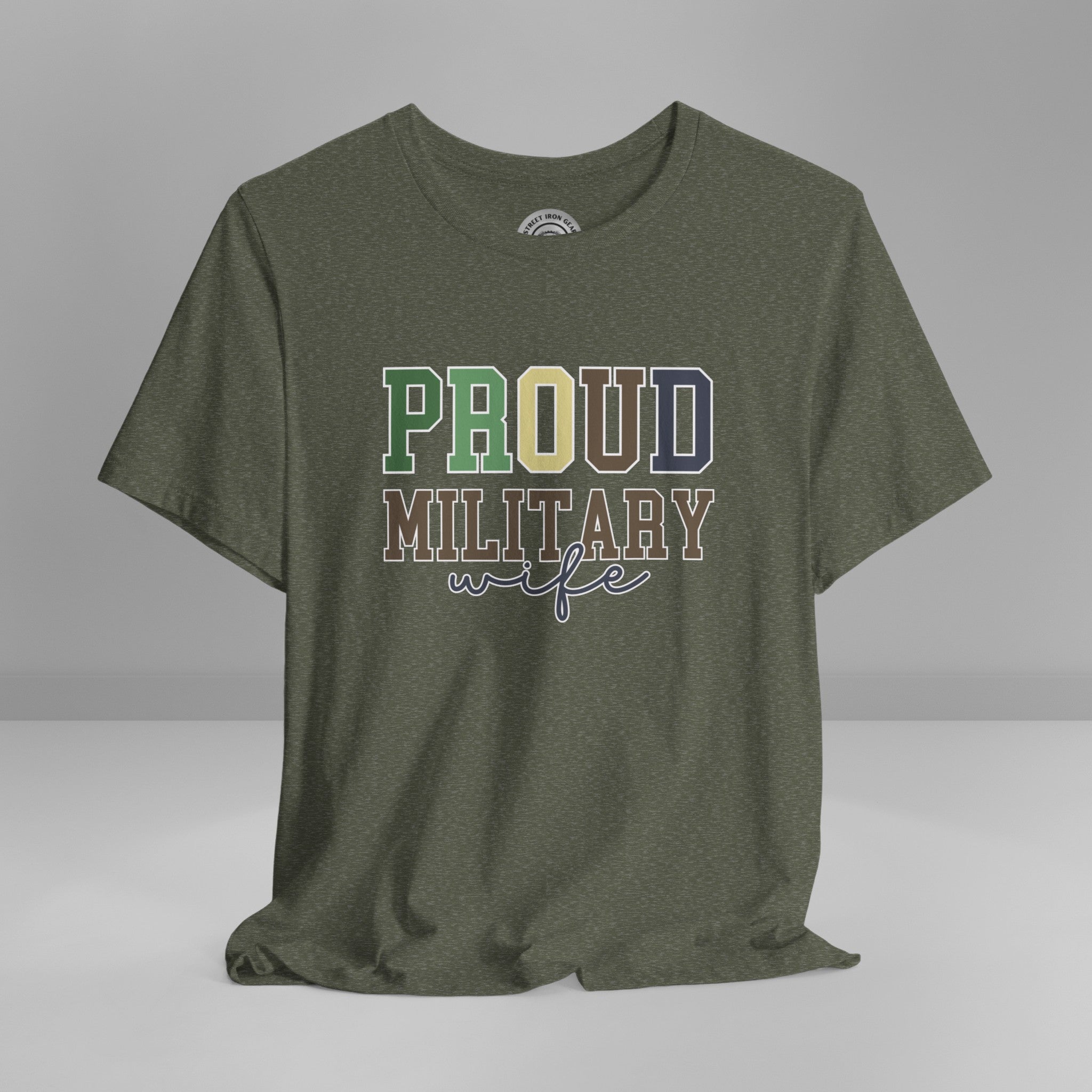 Celebrate your pride with our "Proud Military Wife" T-shirt! This tee showcases the message in a combination of collegiate and script fonts, set against a military-inspired color palette and boldly outlined in soft white.