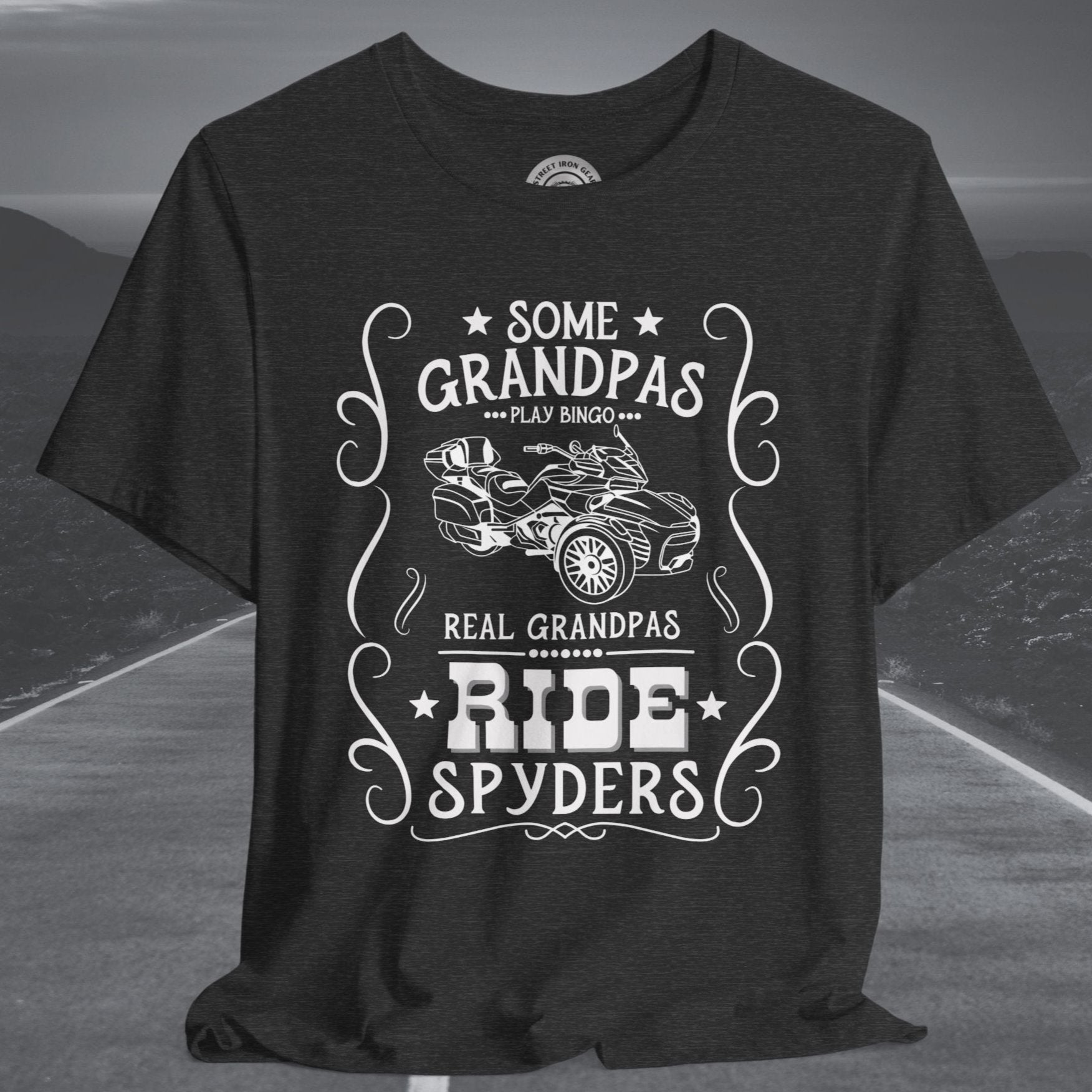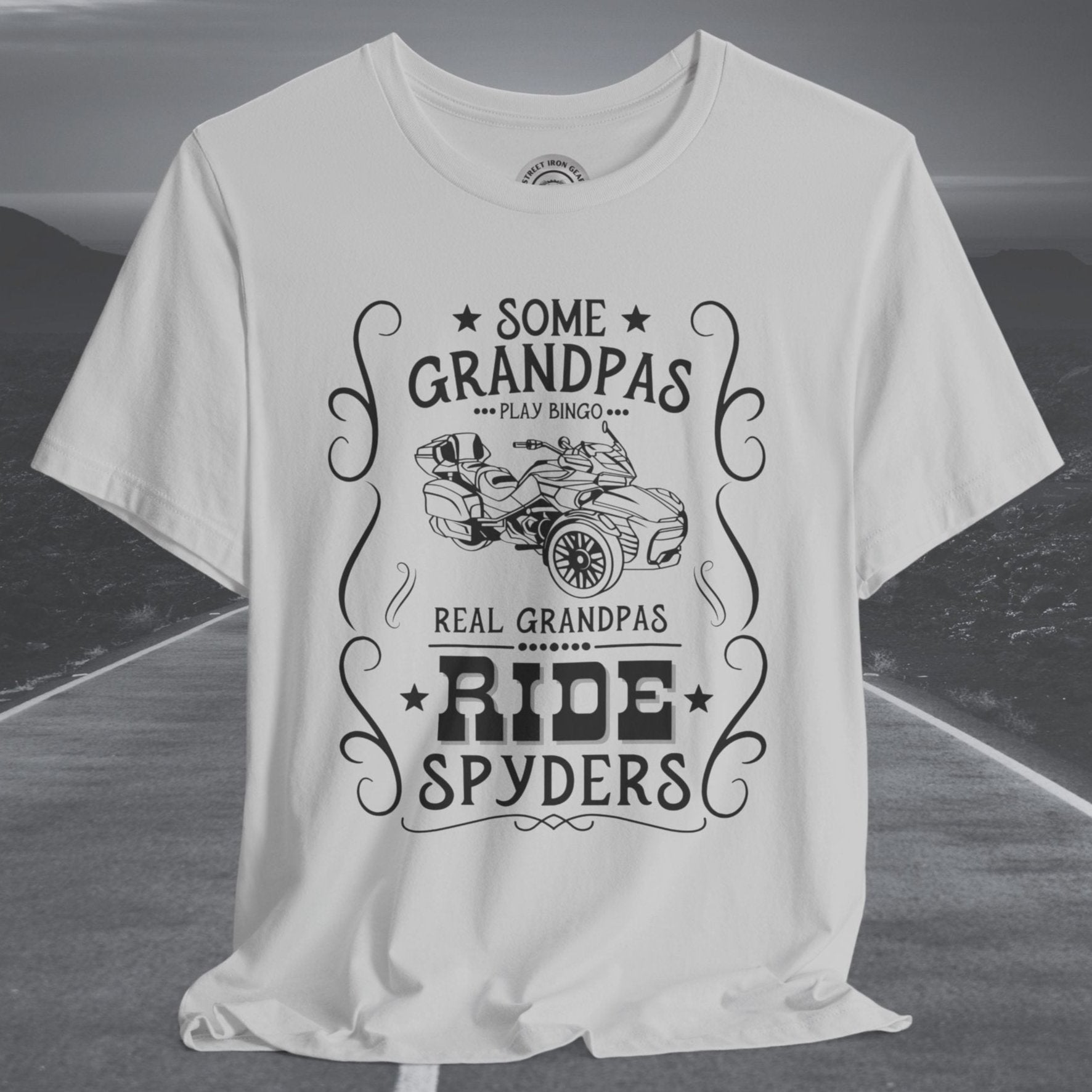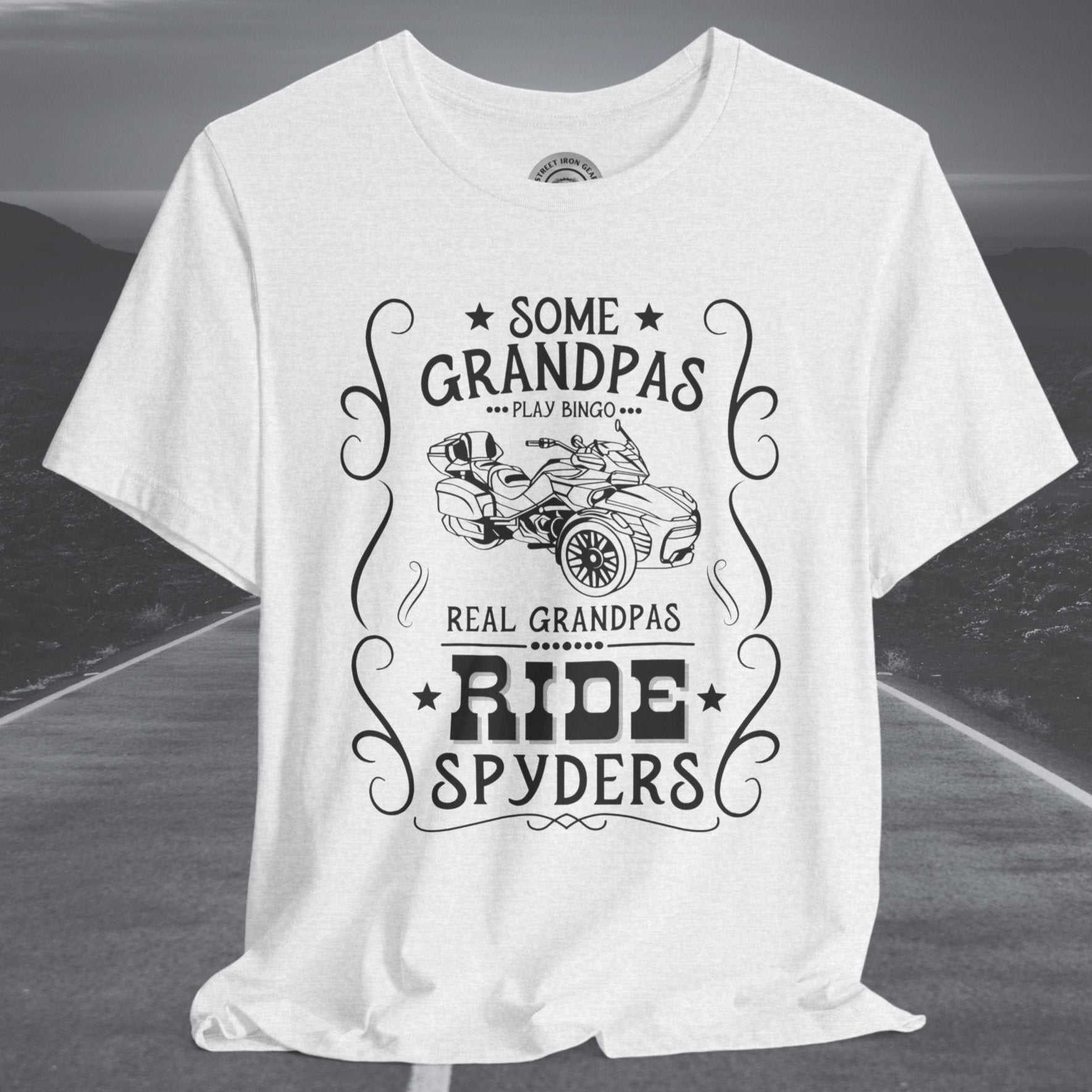 Celebrate grandpas who live life on the open road with our Can-Am Spyder-themed T-shirt! Featuring the bold statement, "Some Grandpas play bingo. Real Grandpas ride Spyders," and a detailed graphic of the iconic Spyder F3 Limited, this T-shirt is perfect for adventurous grandpas. Made from high-quality fabric and with an option to customize the graphic, it’s an ideal gift for any Spyder enthusiast and a fun way to show off their passion.