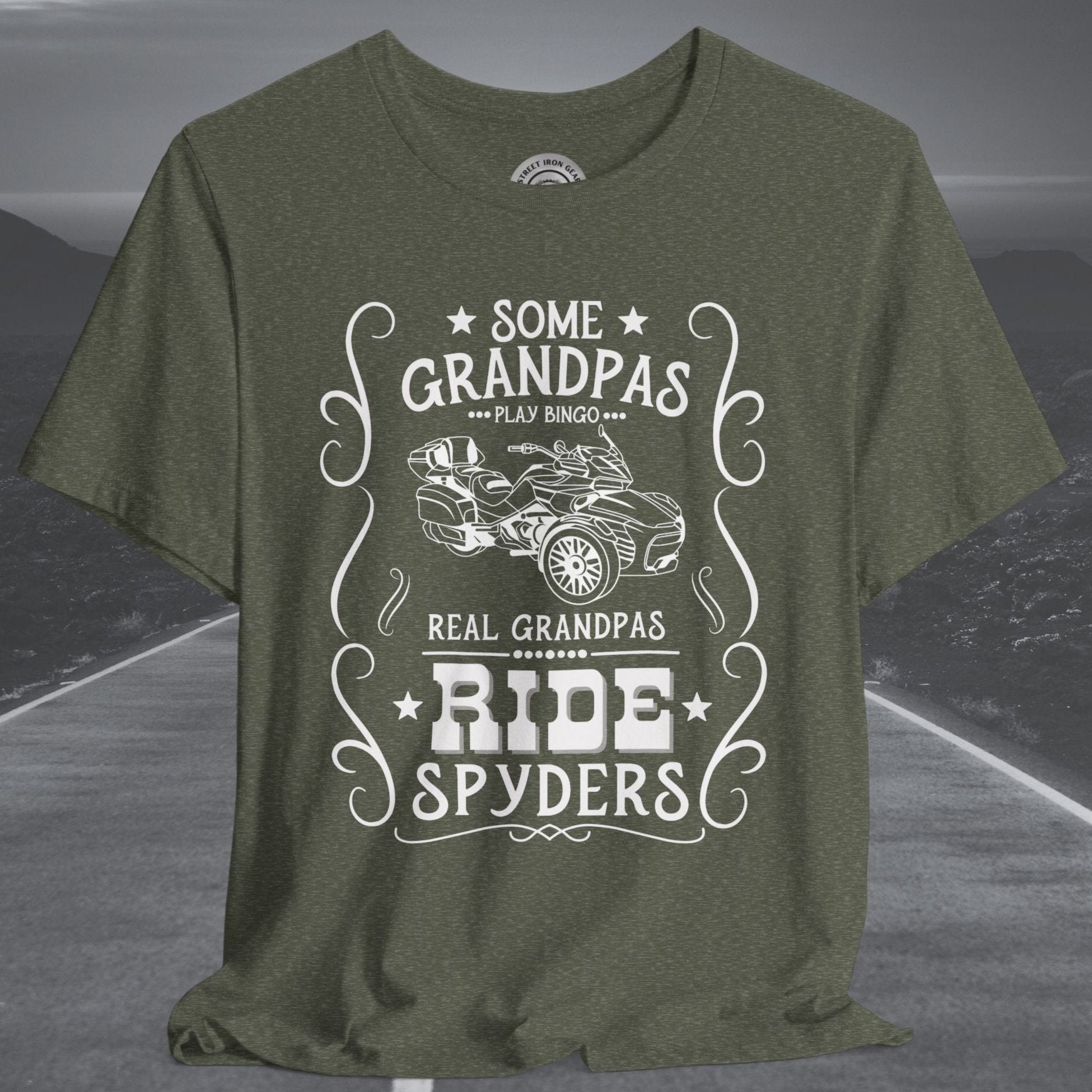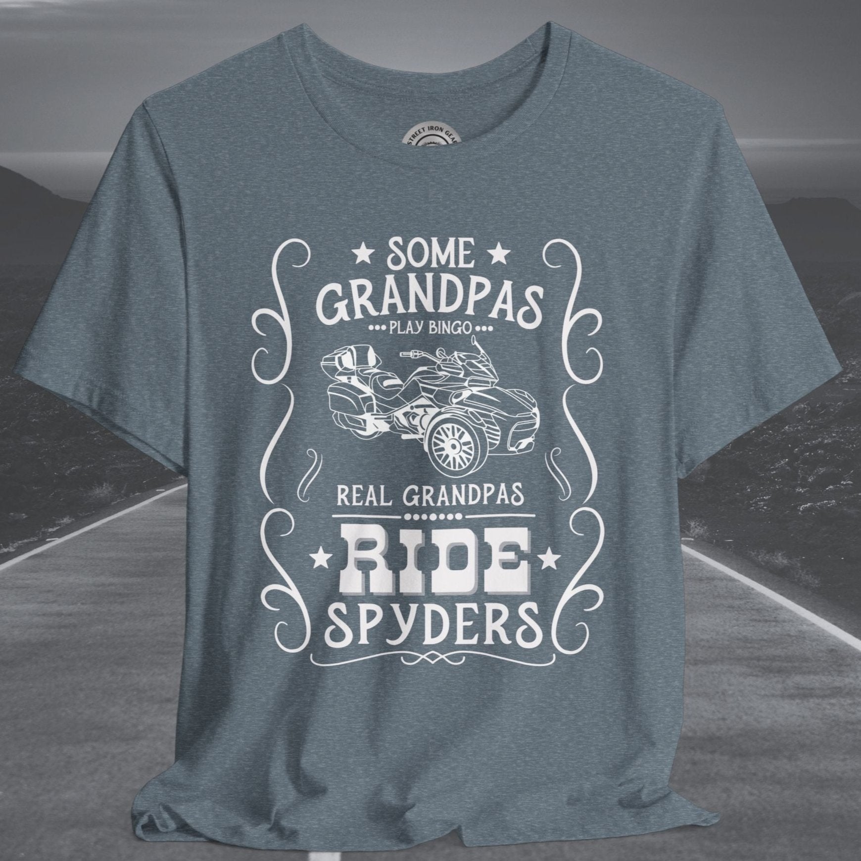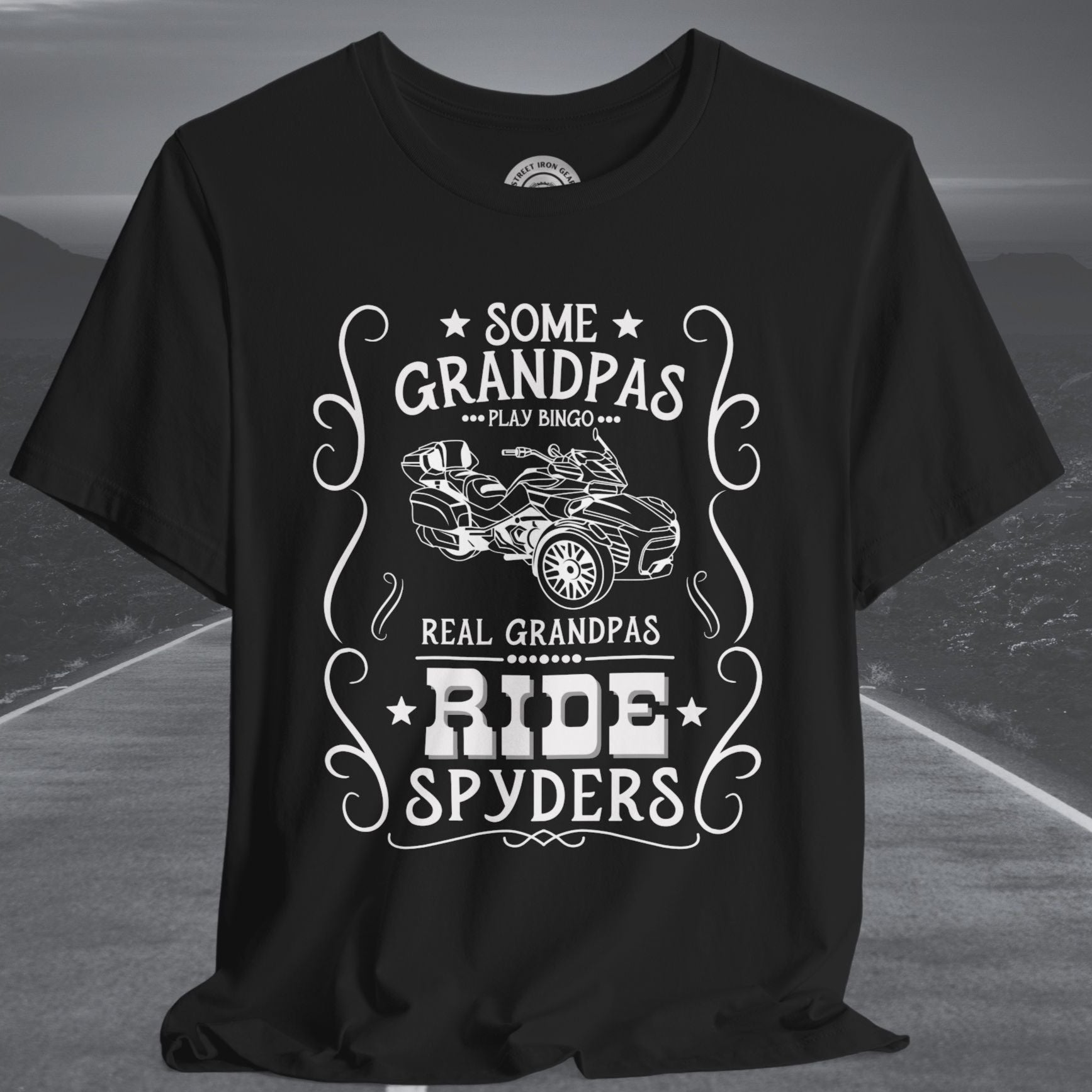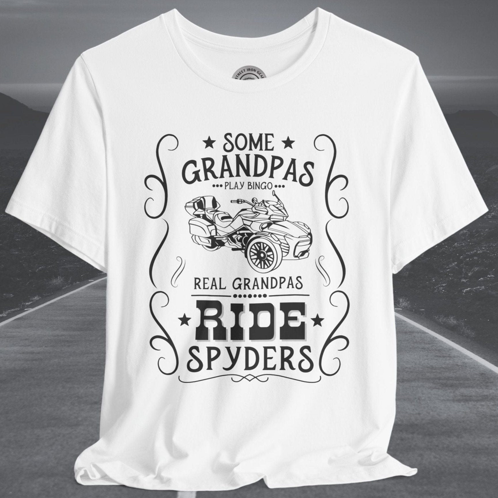 Celebrate grandpas who live life on the open road with our Can-Am Spyder-themed T-shirt! Featuring the bold statement, "Some Grandpas play bingo. Real Grandpas ride Spyders," and a detailed graphic of the iconic Spyder F3 Limited, this T-shirt is perfect for adventurous grandpas. Made from high-quality fabric and with an option to customize the graphic, it’s an ideal gift for any Spyder enthusiast and a fun way to show off their passion.