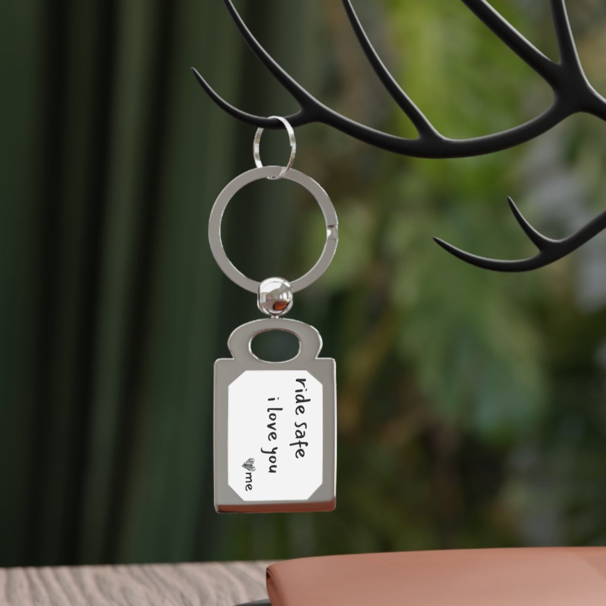 Show them you care with this "Ride Safe, I love you" motorcycle keychain. Crafted with high-quality zinc alloy, these keyrings are as durable as they are stylish and even be used as a bag charm. Featuring a strong swivel joint and a dog-tag style frame, this keyring has a rectangular shape to show off your prize toy.