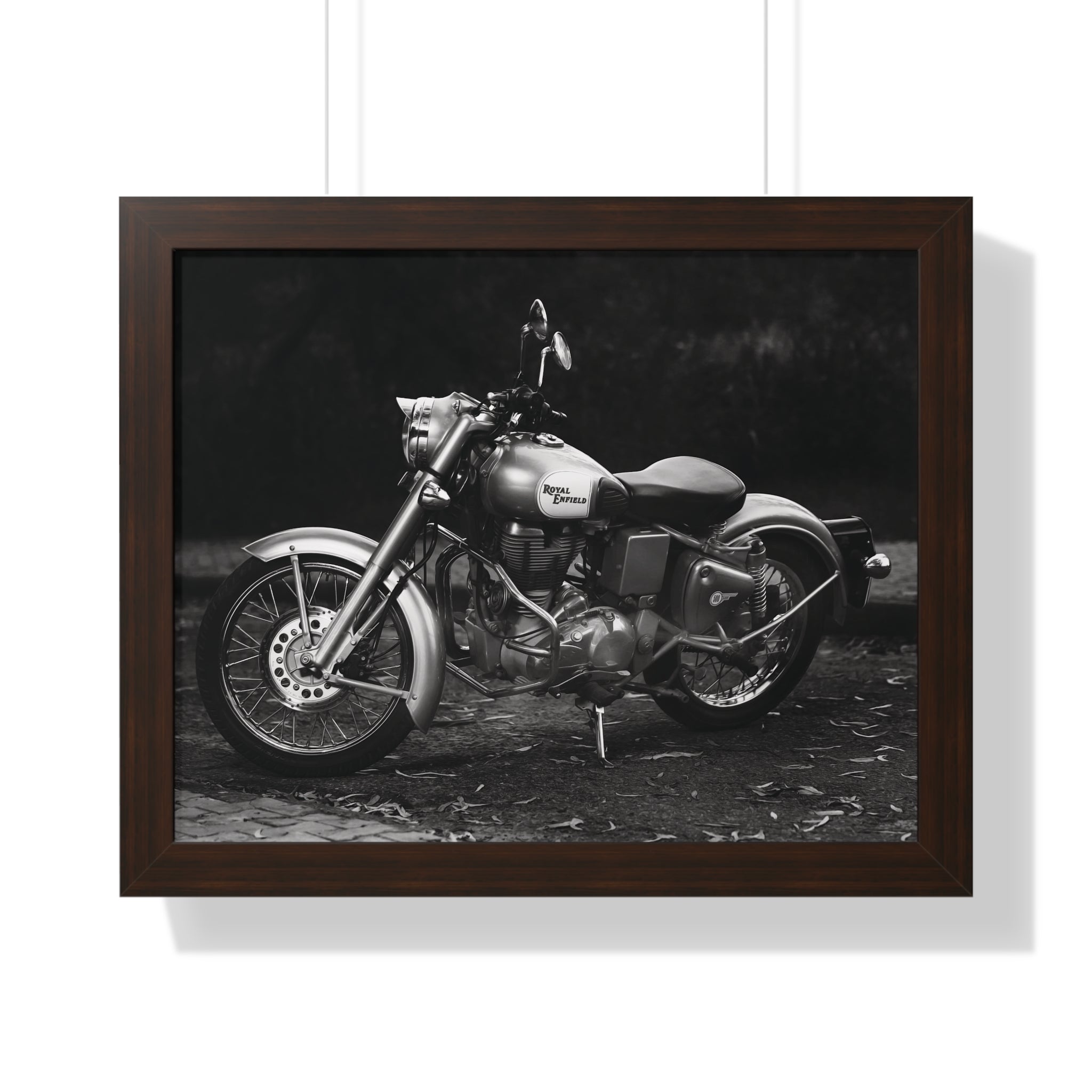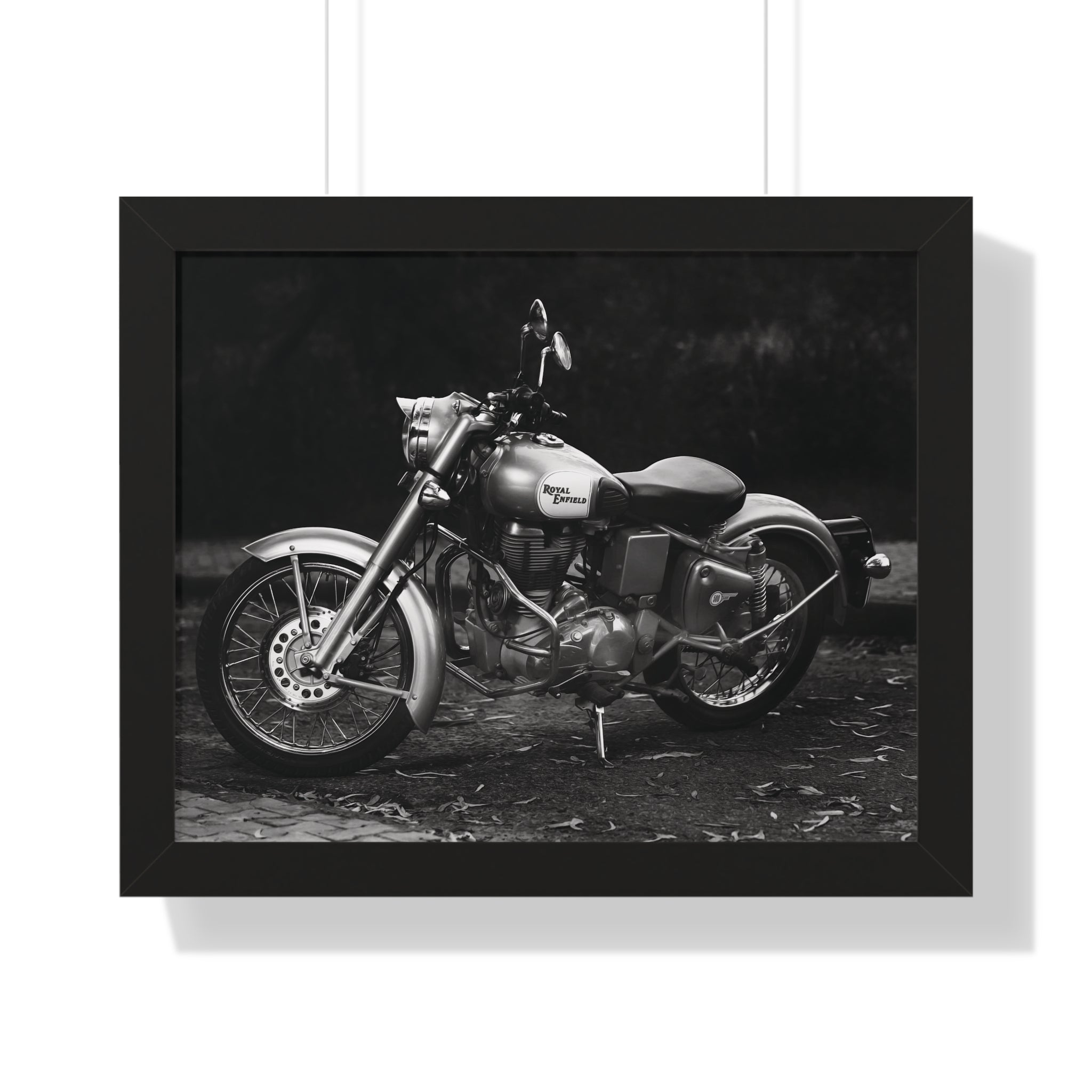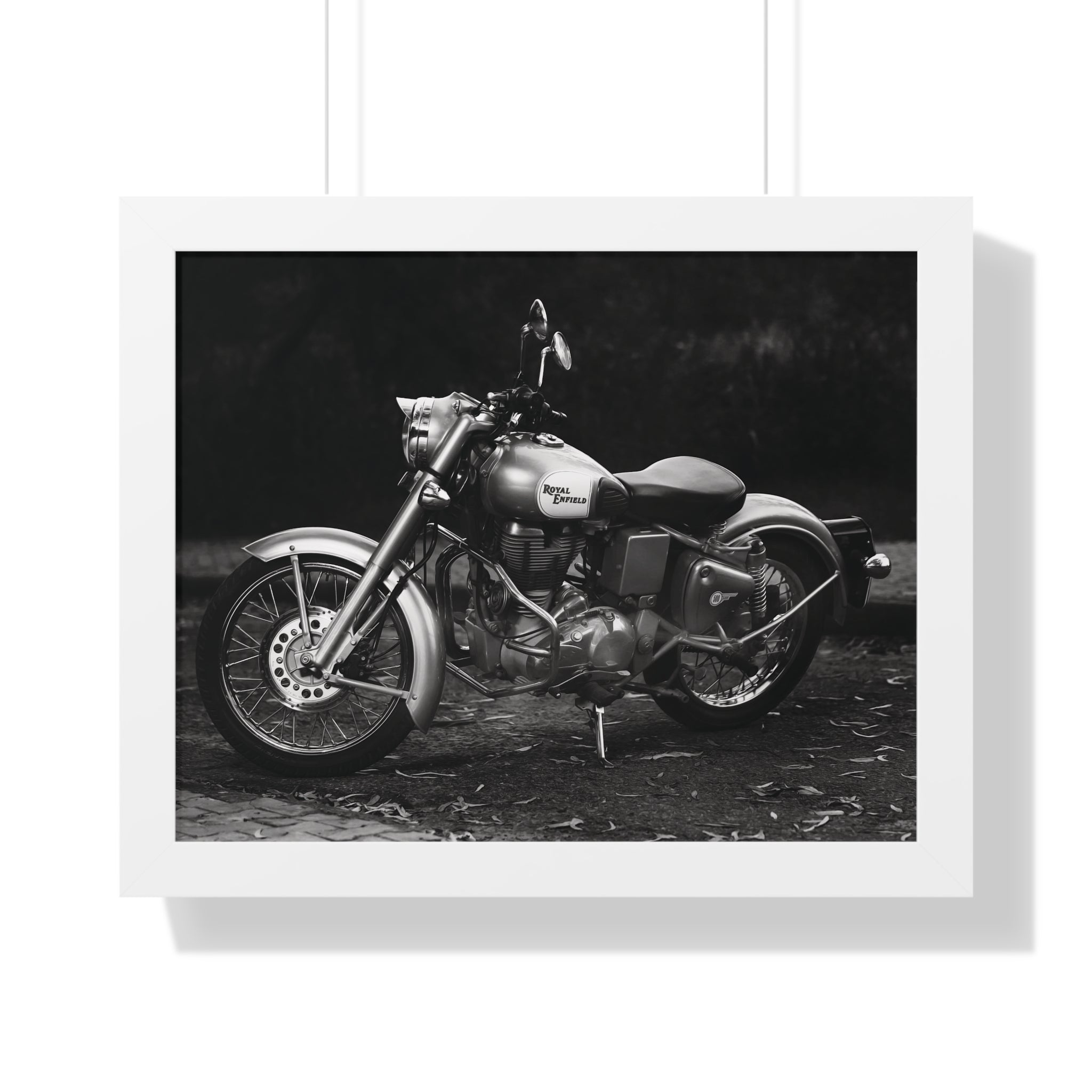 Elevate your space with this stunning Royal Enfield Motorcycle Framed Print, featuring a striking black and white image of a Royal Enfield cruiser parked on a gravel road against a dark, moody background. Printed on high-quality matte paper and framed in a sleek MDF frame available in white, black, or walnut, this premium motorcycle wall art is perfect for motorcycle enthusiasts, vintage bike lovers, and Royal Enfield fans. Whether displayed in your home, garage, office, or man cave, this framed print adds a bold, classic touch to any decor. A must-have for collectors and the perfect gift for bikers who live for the open road!