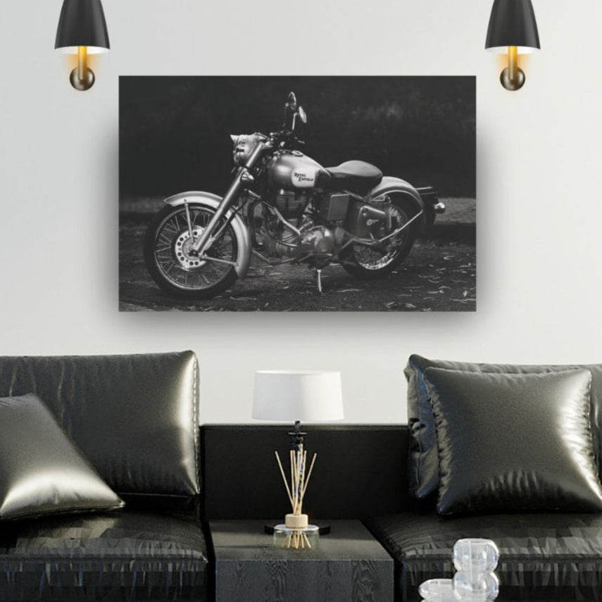 Elevate your space with this stunning Royal Enfield Motorcycle Metal Print Poster, featuring a striking black and white image of a Royal Enfield cruiser parked on a gravel road against a dark, moody background. This high-quality metal wall art is perfect for motorcycle enthusiasts, vintage bike lovers, and Royal Enfield fans who appreciate classic design and timeless style. The sleek, durable metal print brings out the fine details and contrasts, making it a bold statement piece for your home, garage, office, or man cave. A must-have for collectors or the perfect gift for bikers who live for the open road!