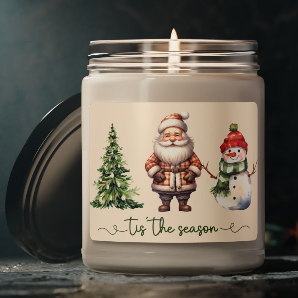 Celebrate the holidays with our cute Christmas-themed soy candle, featuring a festive trio of a Holiday Tree, Vintage Santa Claus, and Snowman across the top. The elegant script reading "Tis' the Season" adds a charming touch to this cozy candle, perfect for creating a warm holiday atmosphere. Made from 100% natural soy wax, it burns cleaner and longer than petroleum-based candles, making it a thoughtful and eco-friendly gift for any Christmas lover.