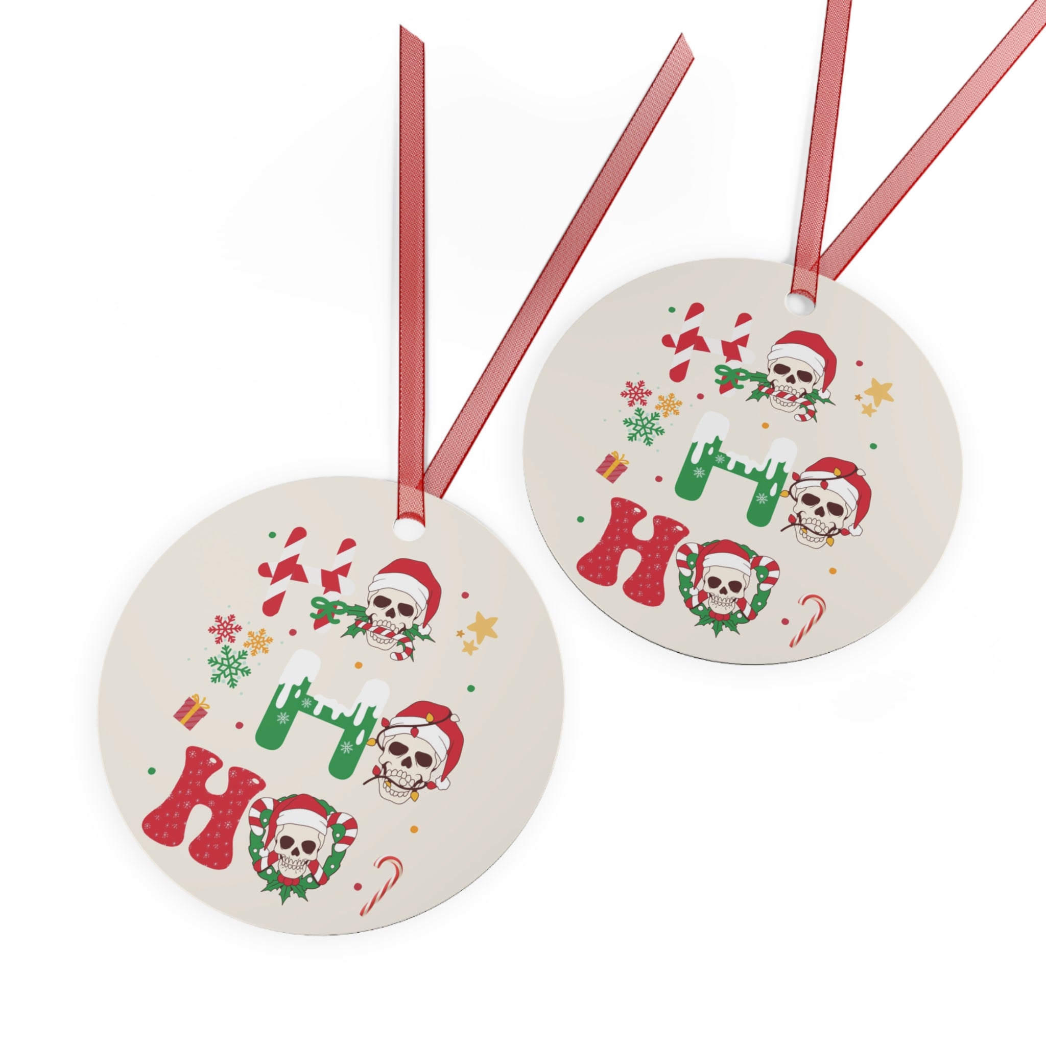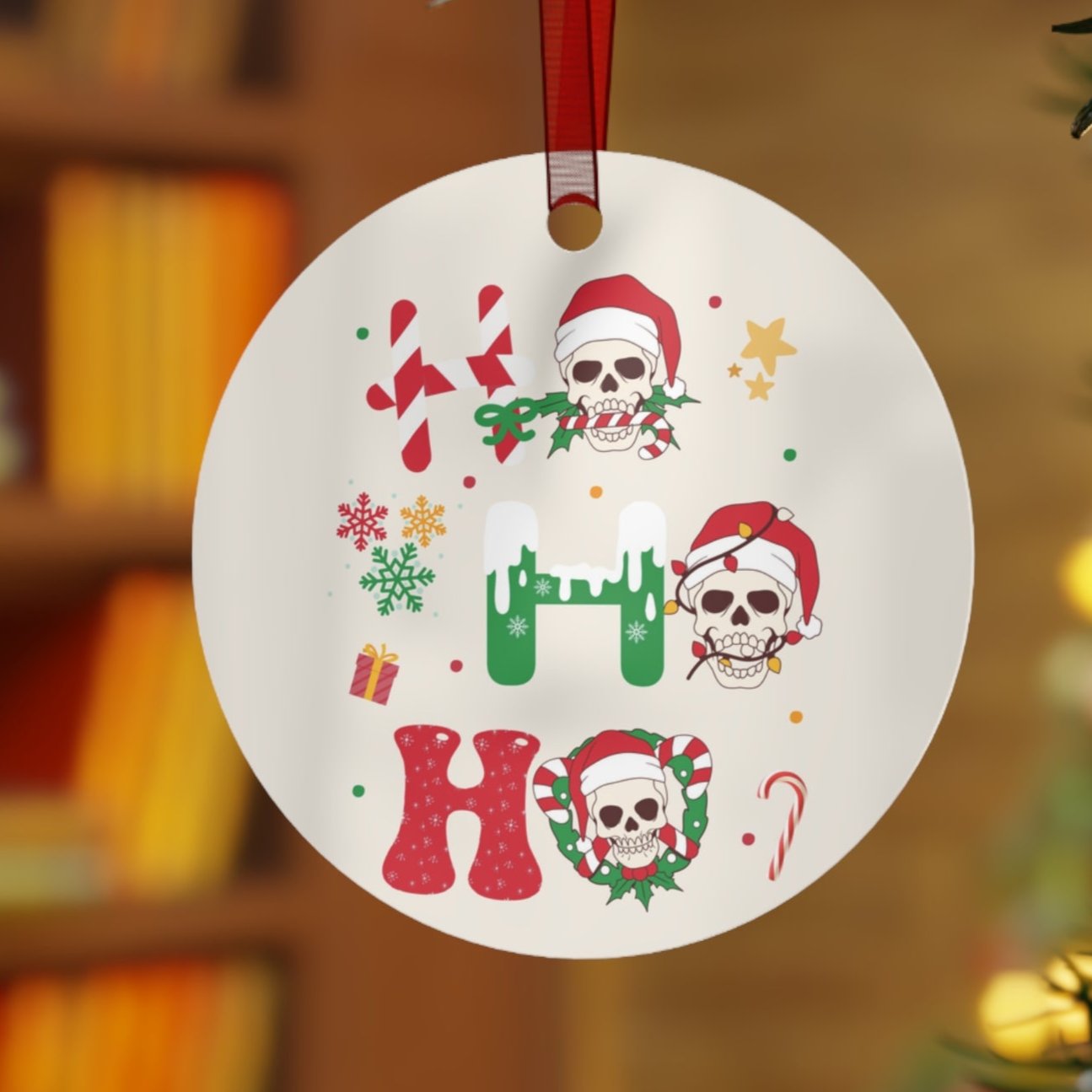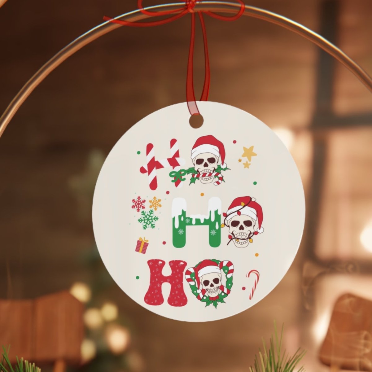 Celebrate the holiday season with a twist with our custom-designed Christmas ornament for motorcycle lovers! This vintage-style ornament features Santa Skulls wearing Santa hats, with a unique "Ho, Ho, Ho" design where the O's are replaced by skulls. Perfect for adding a festive, edgy touch to your Christmas decor, this ornament makes an ideal gift for bikers and motorcycle enthusiasts who appreciate a blend of holiday spirit and biker culture.