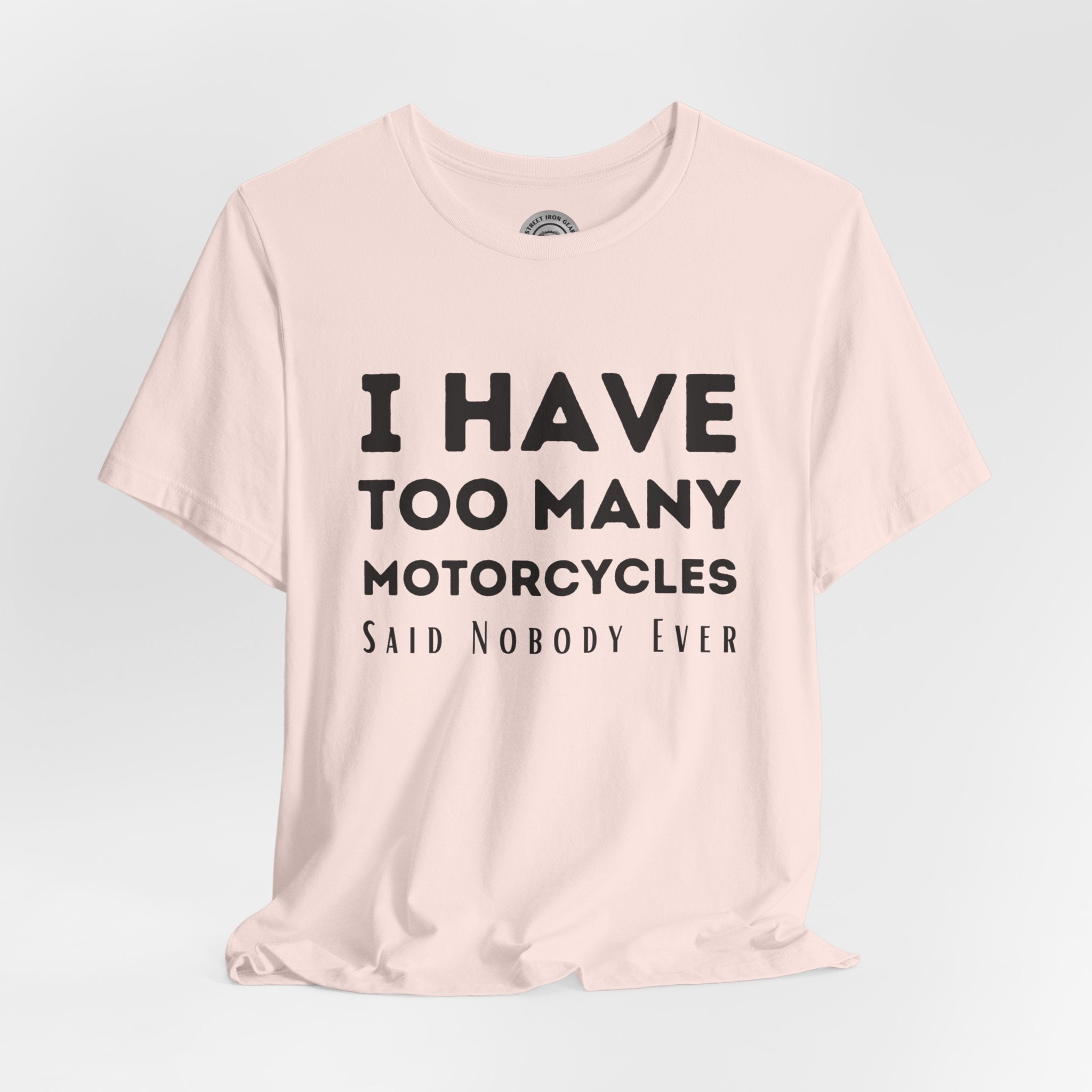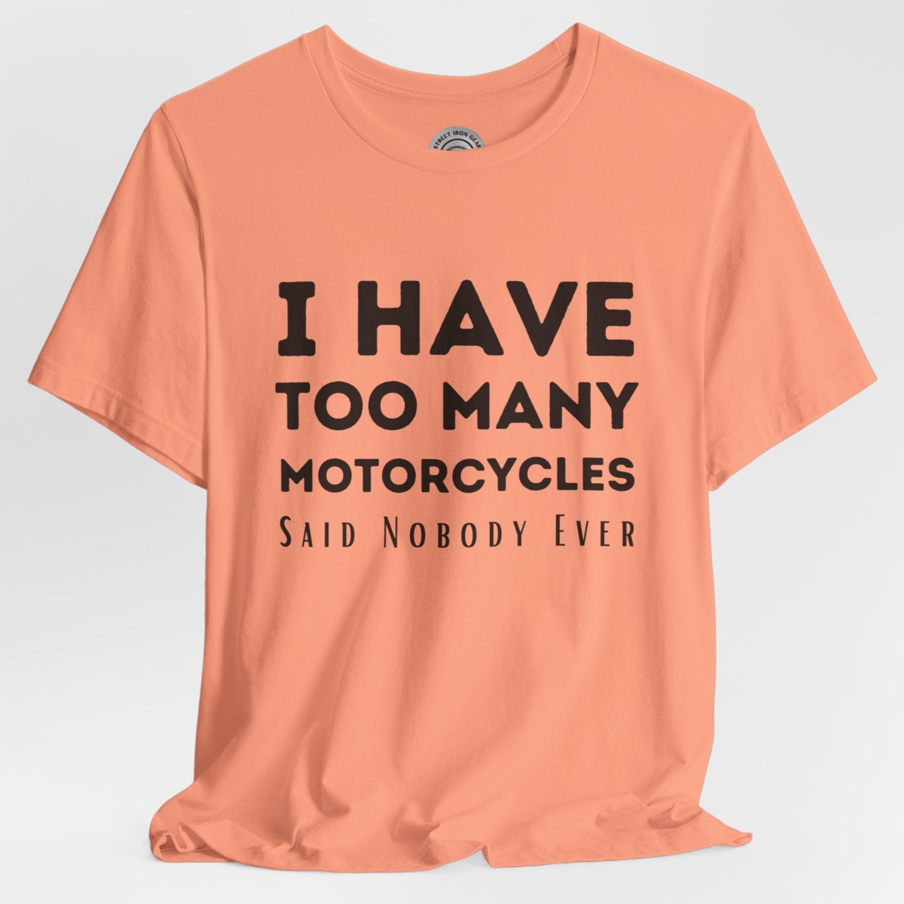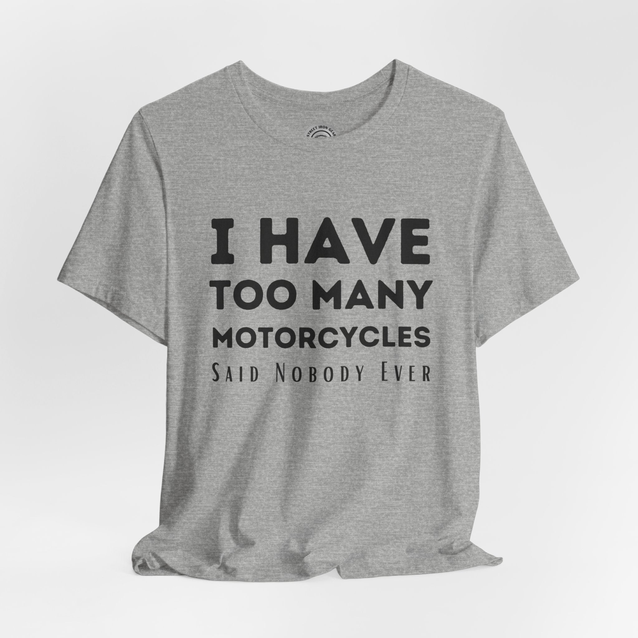 Riders, this one's for you! Our 'I have too many motorcycles, said nobody ever' T-shirt is the ultimate Motorcycle Gift for the true 'ride or die' enthusiast. Make a bold statement with this men's Motorcycle T-shirt and let your passion shine!